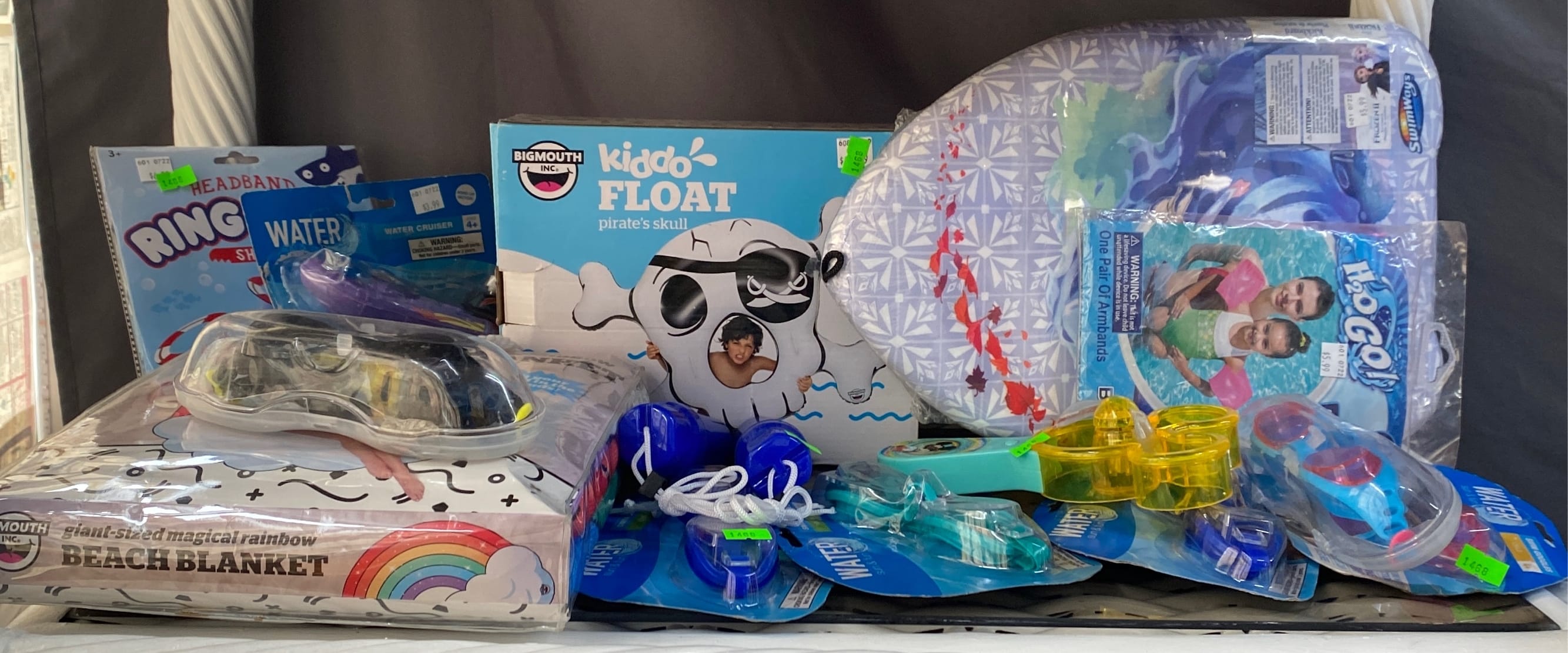 1468 Inflatable pool items, water goggle assortment, beach blanket