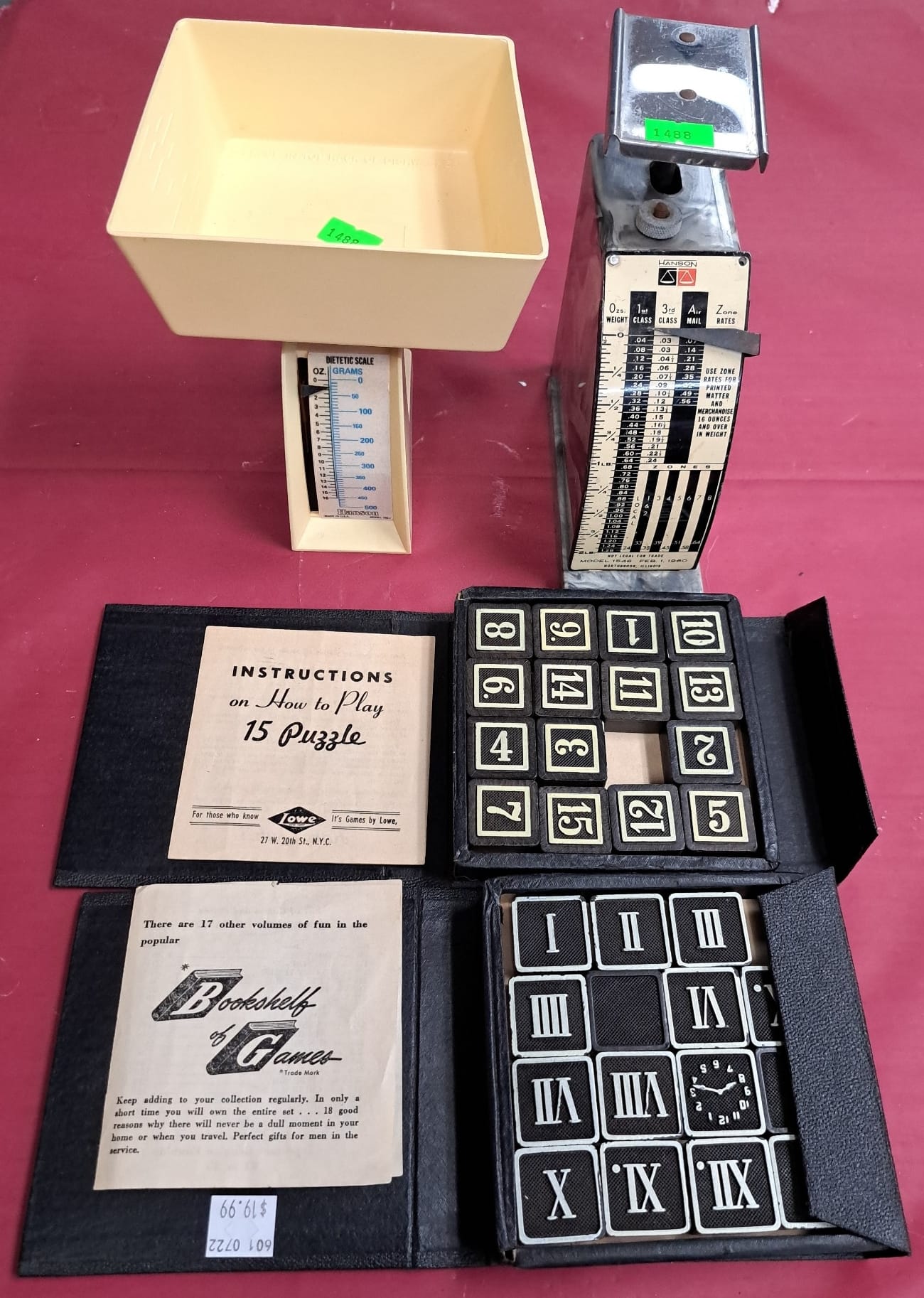 1488 Hanson Postal scale, dietetic scale, bookshelf tile games