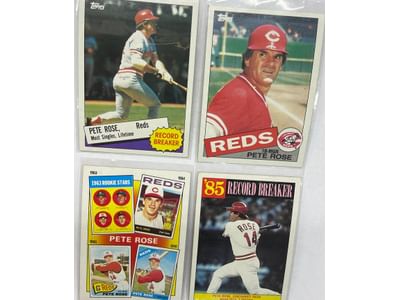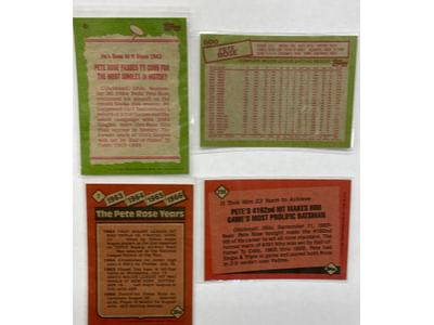 538 4 Pete Rose baseball cards - Pete Rose, Record Breaker, most singles, lifetime, #6 Topps 1985 - Pete Rose, Cincinnati Reds, #690 Topps 1985 - Pete Rose, #2, Topps 1986 - Pete Rose, #206 Topps 1986
