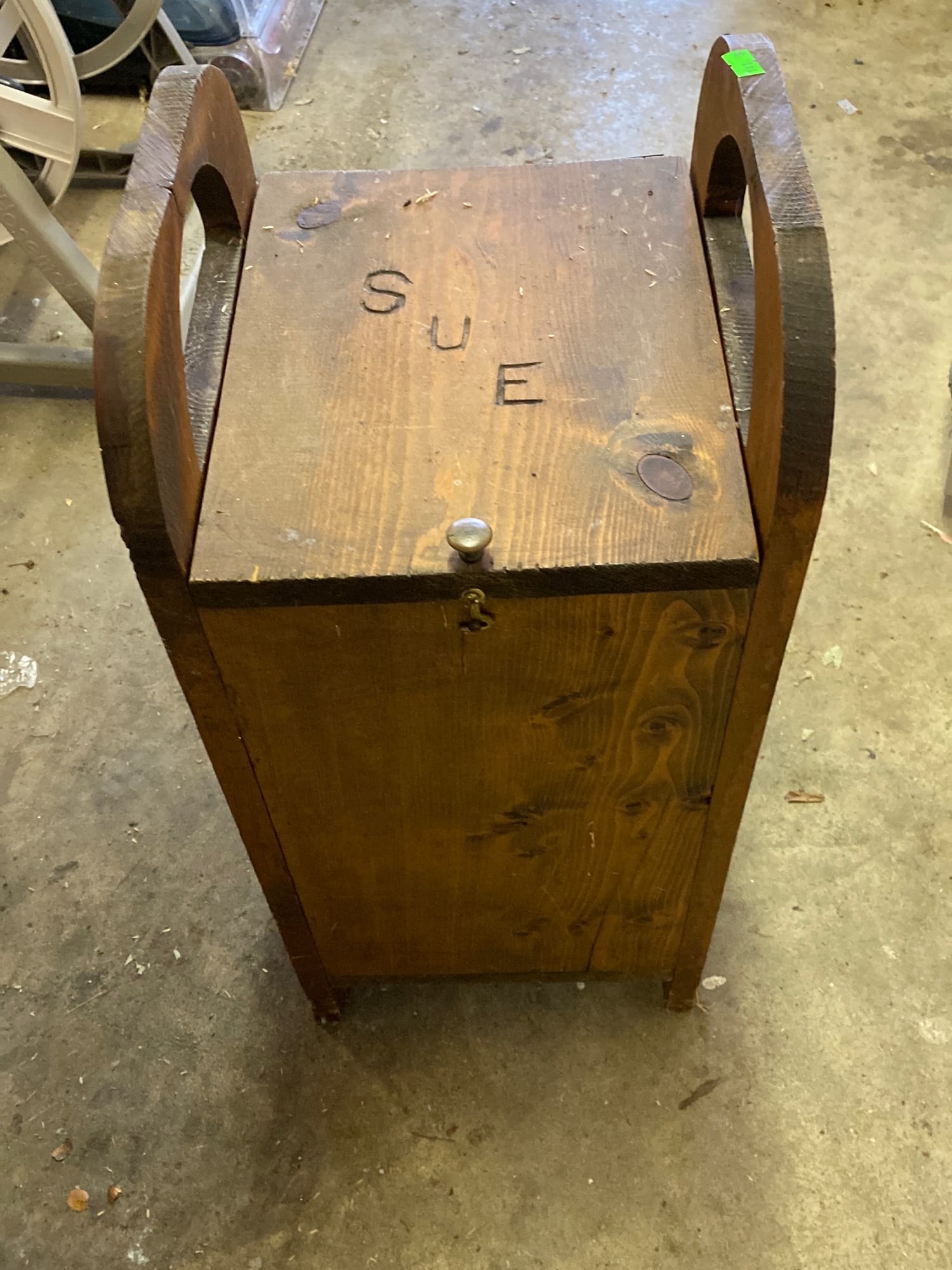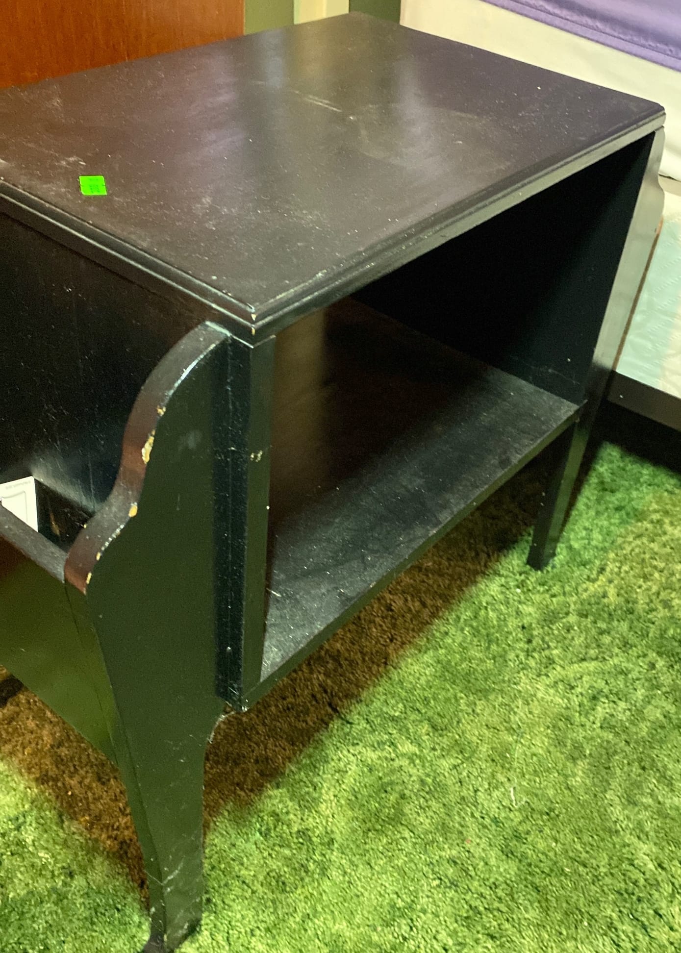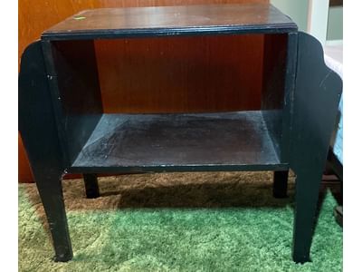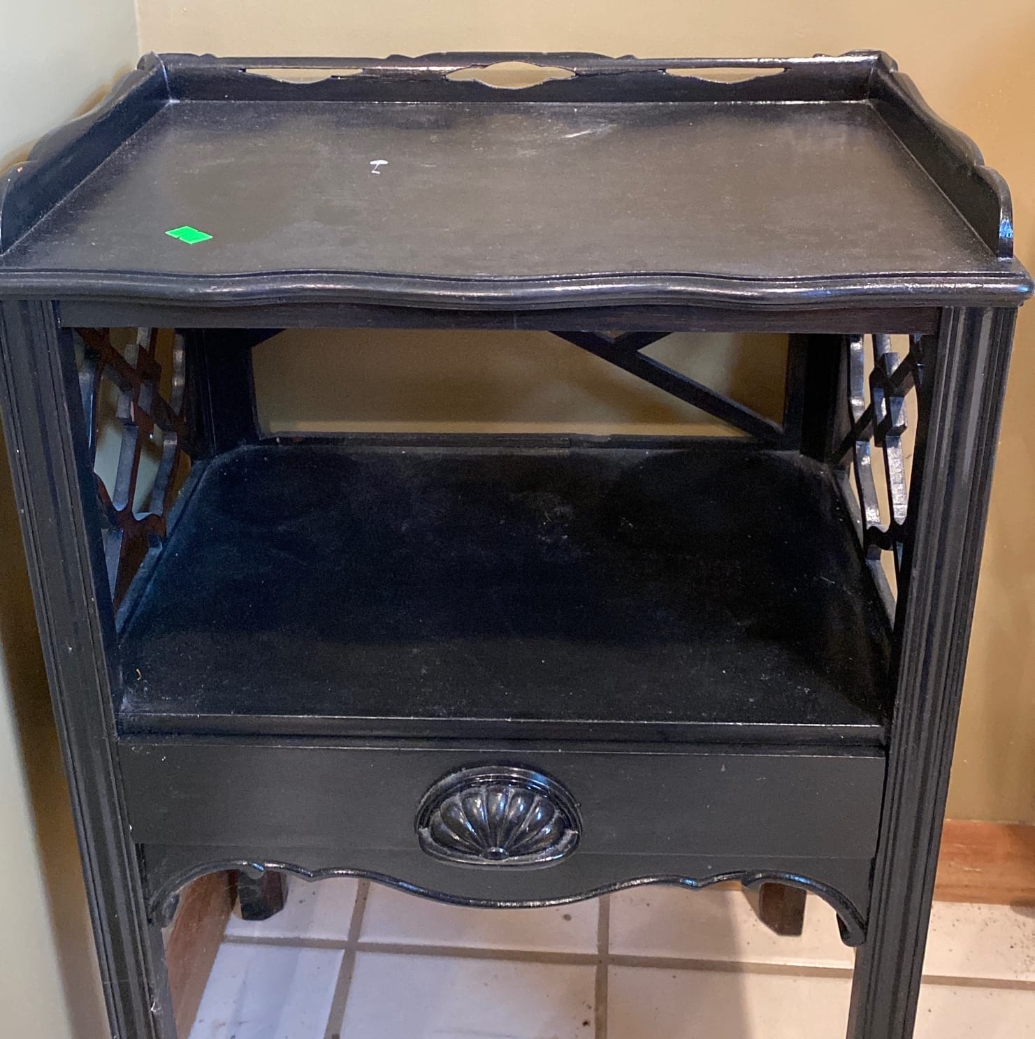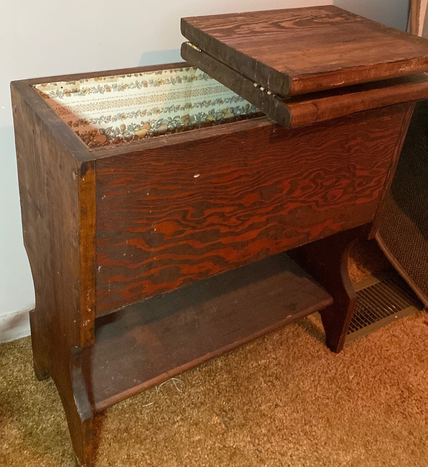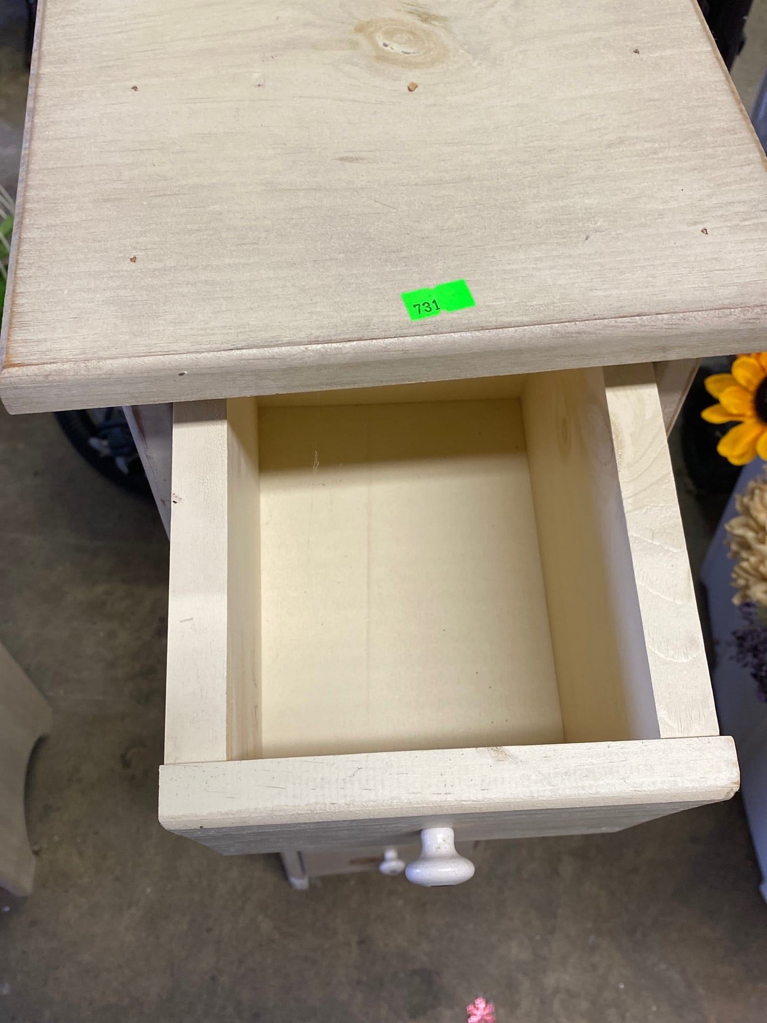 741 3 - Wood shelf 16x7x36, storage box stained 11x24x10 & side stand finish wear 15x19