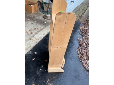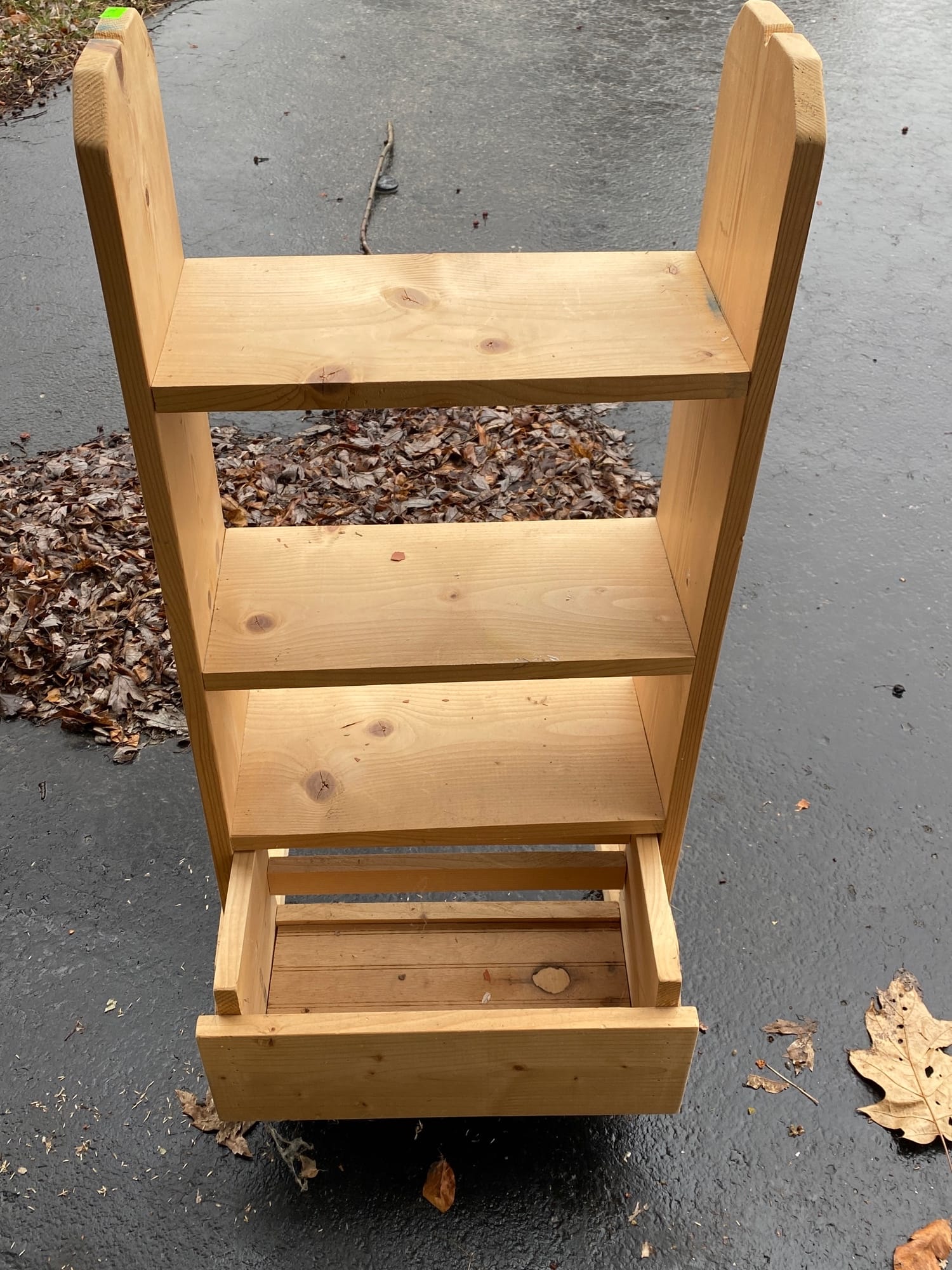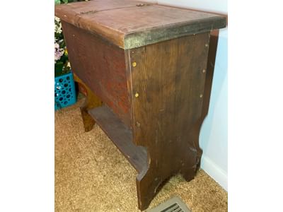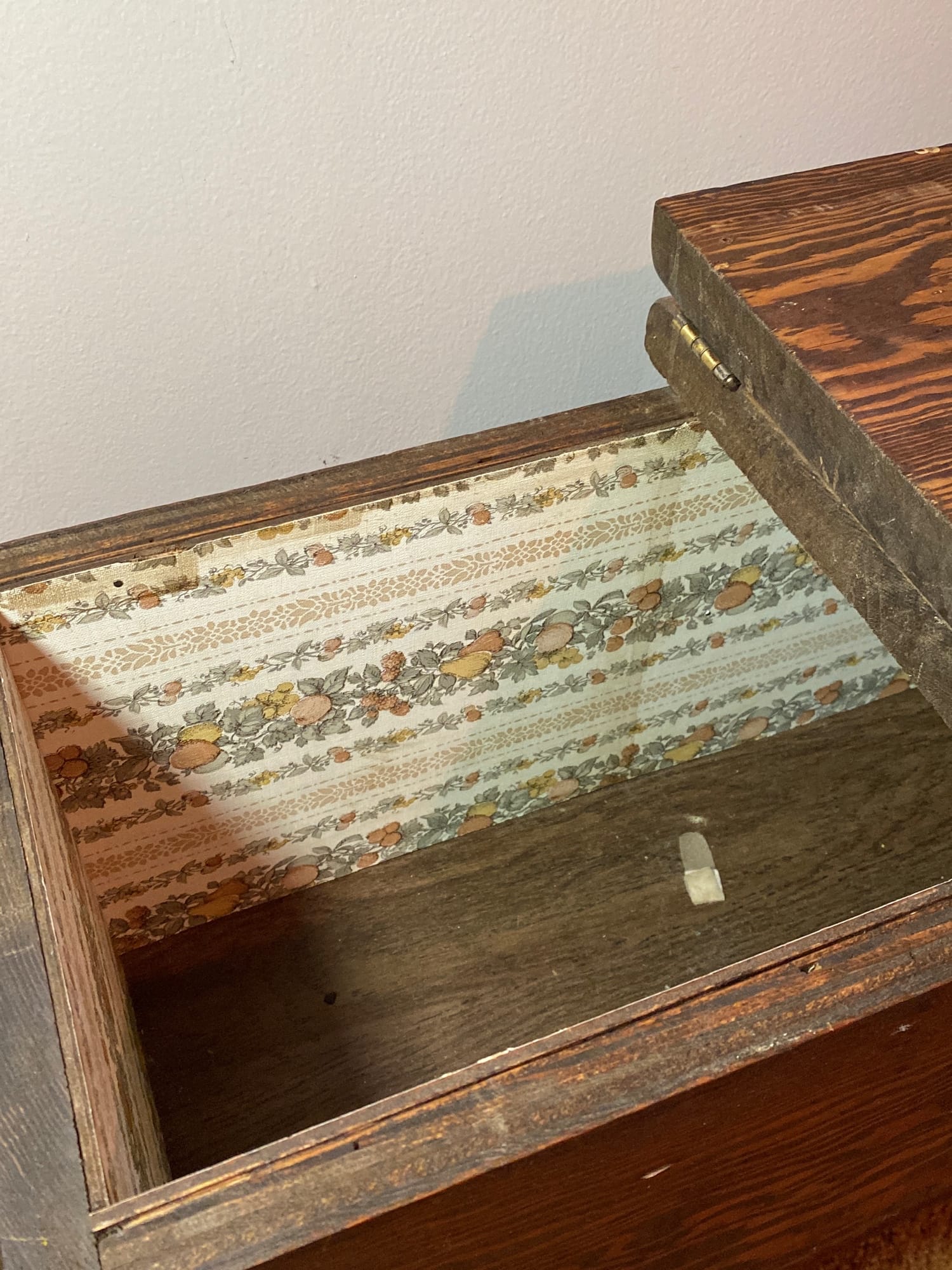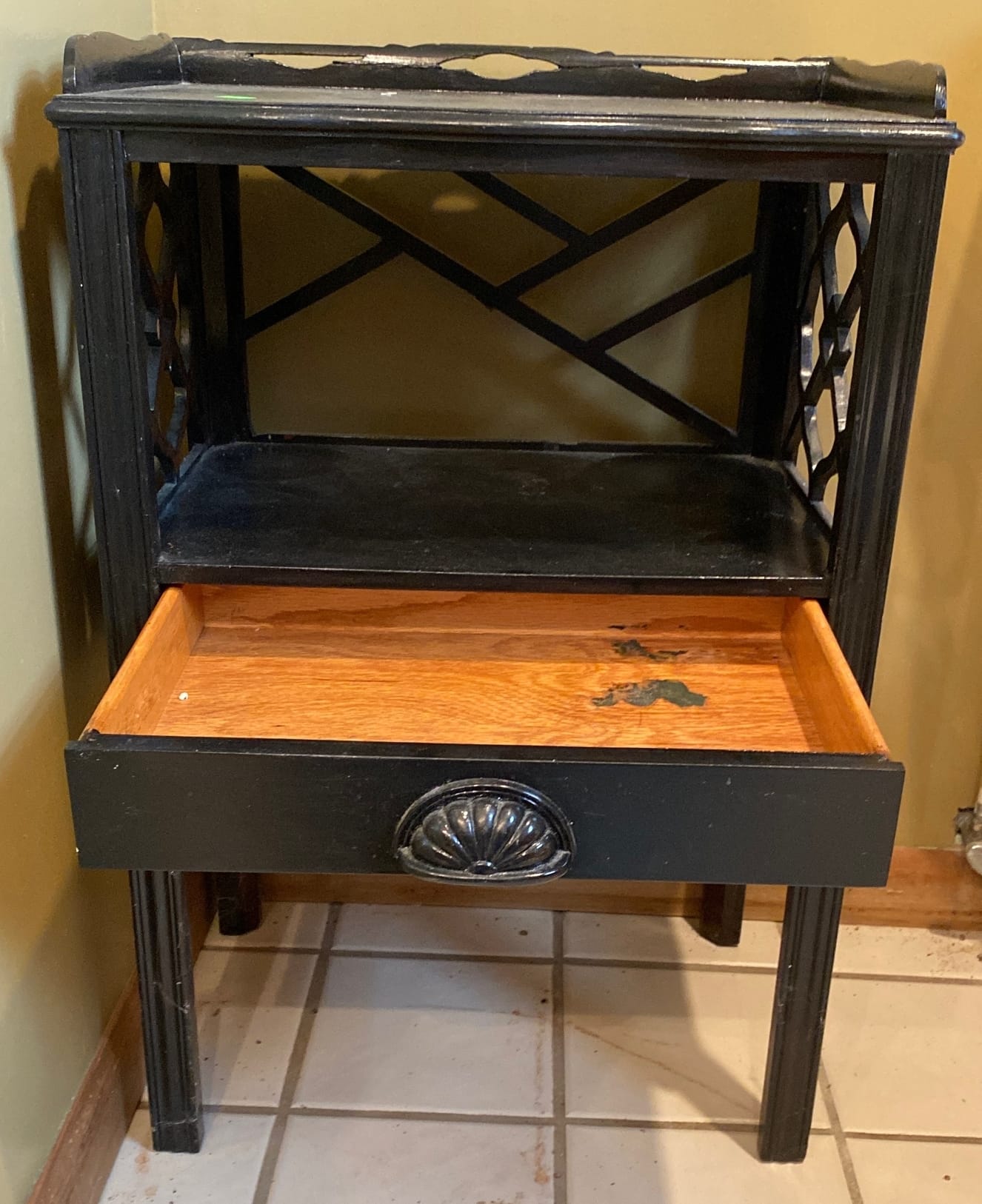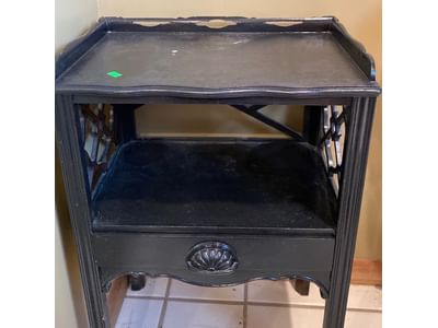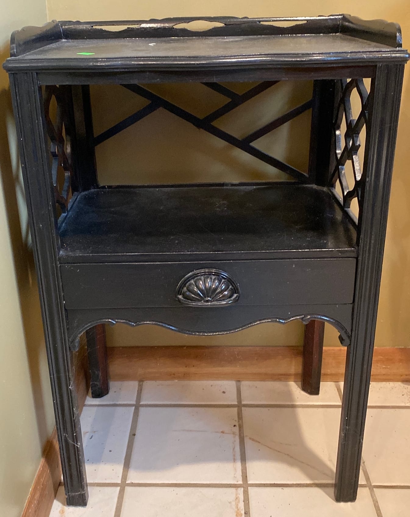741 3 - Wood shelf 16x7x36, storage box stained 11x24x10 & side stand finish wear 15x19