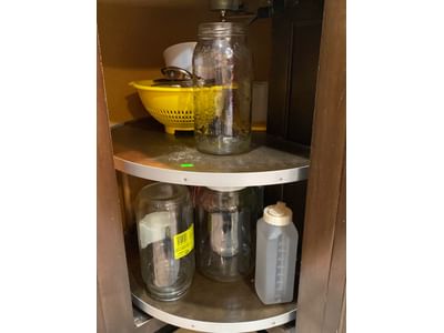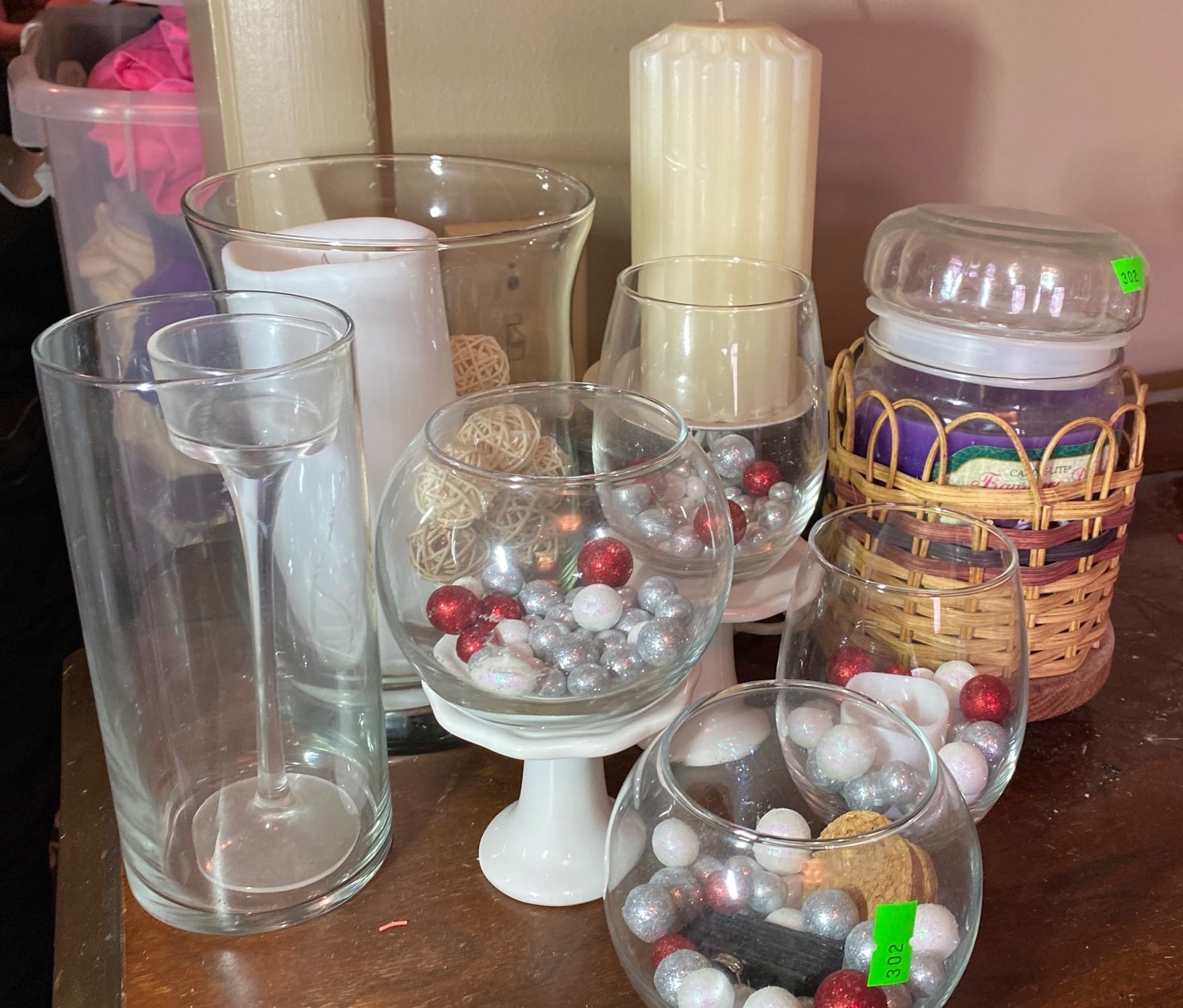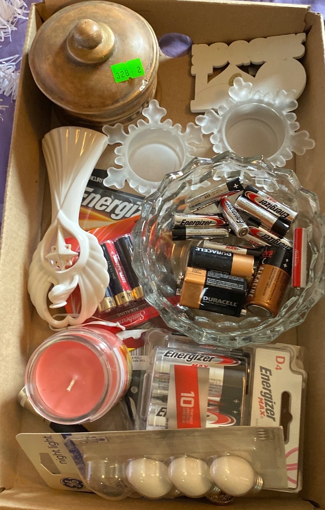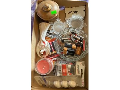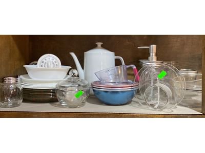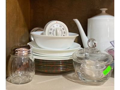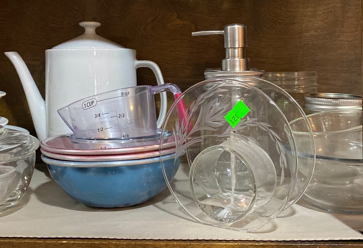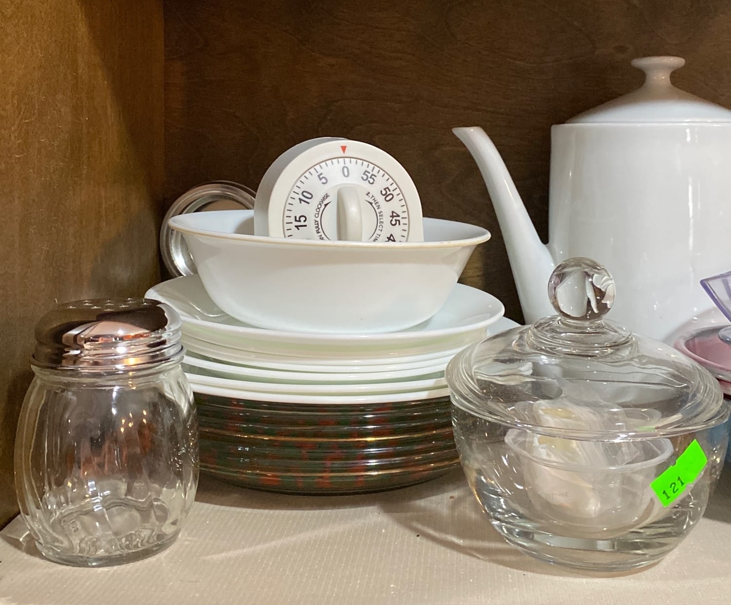 121 Etched glass oil candle, jars, Corelle plates and bowls, tea pot, soap dispenser, measuring cup, misc. contents as shown in pictures