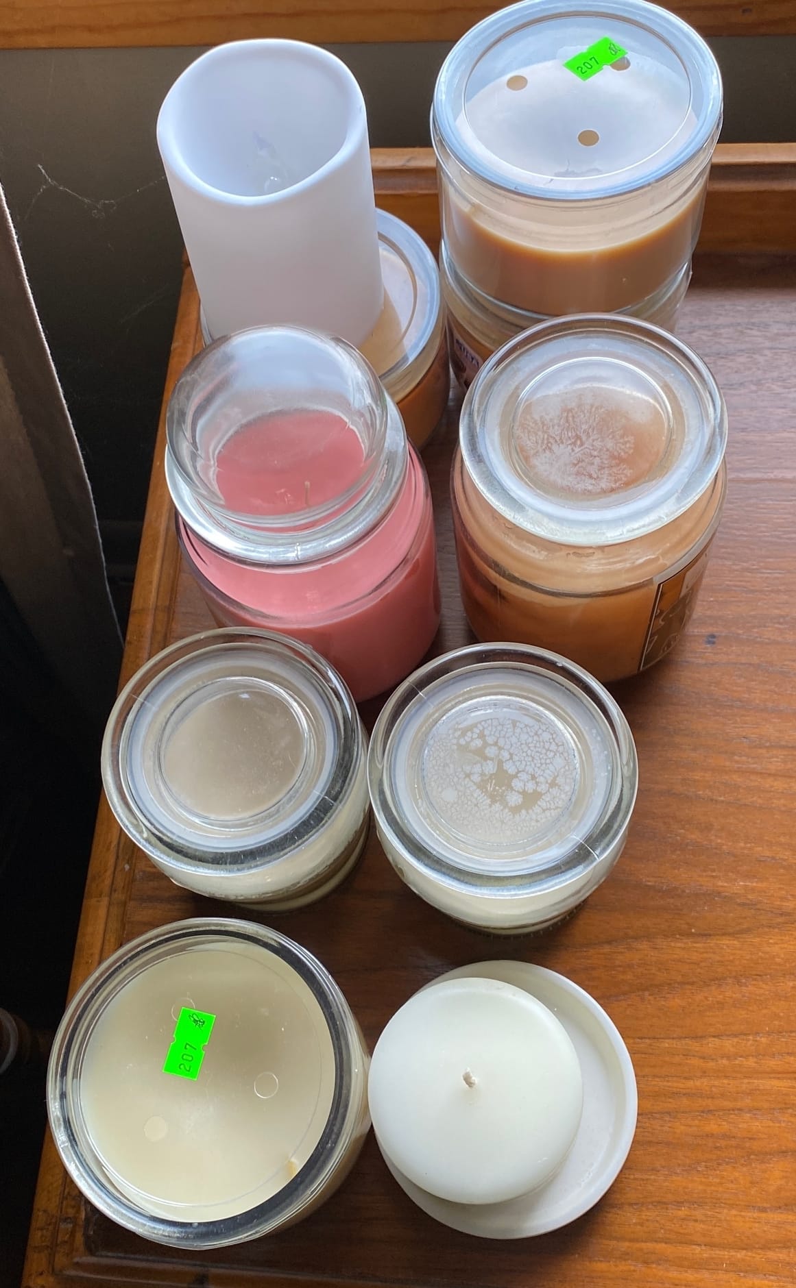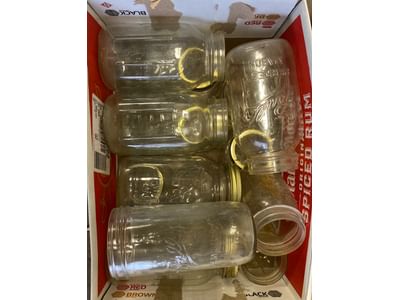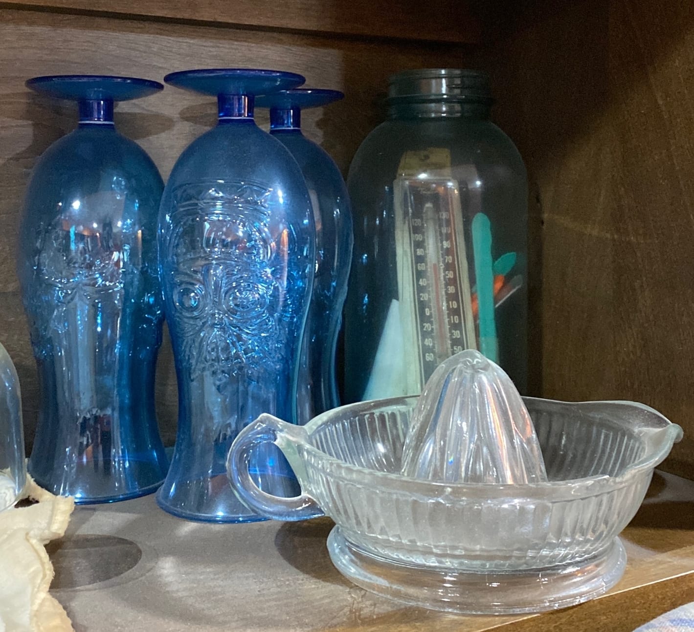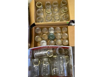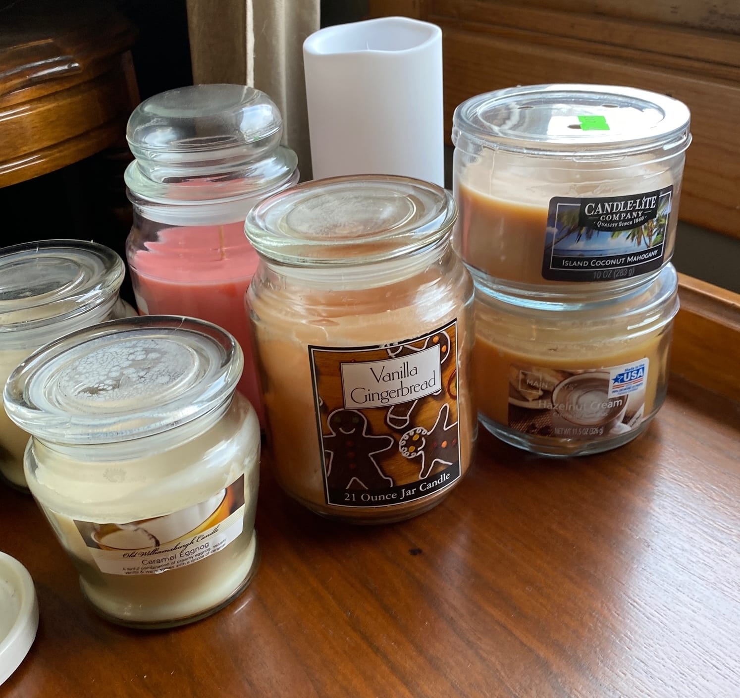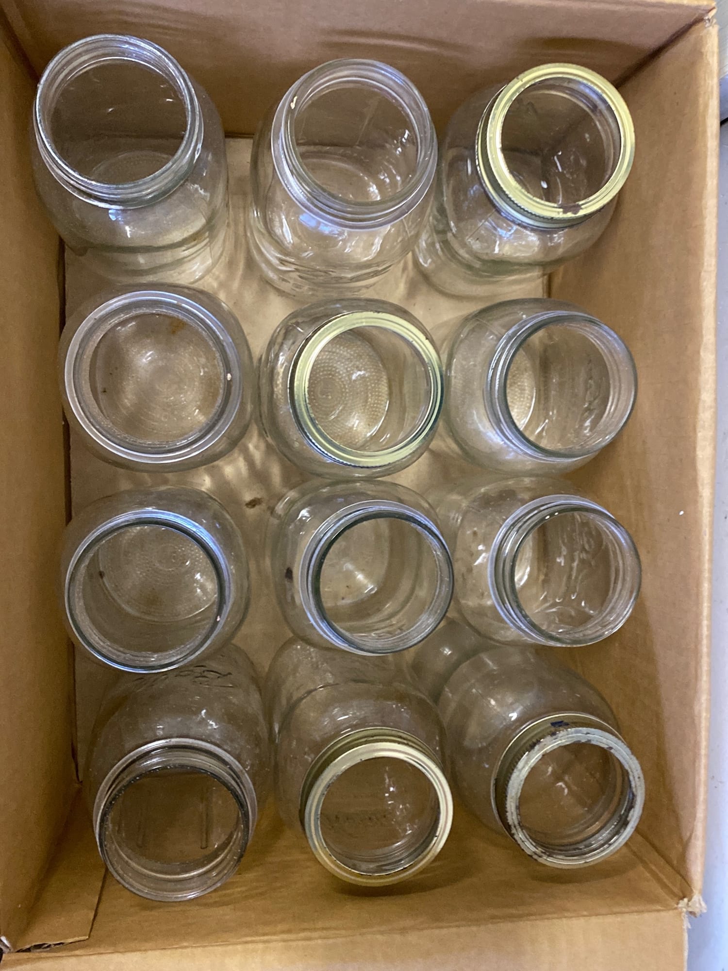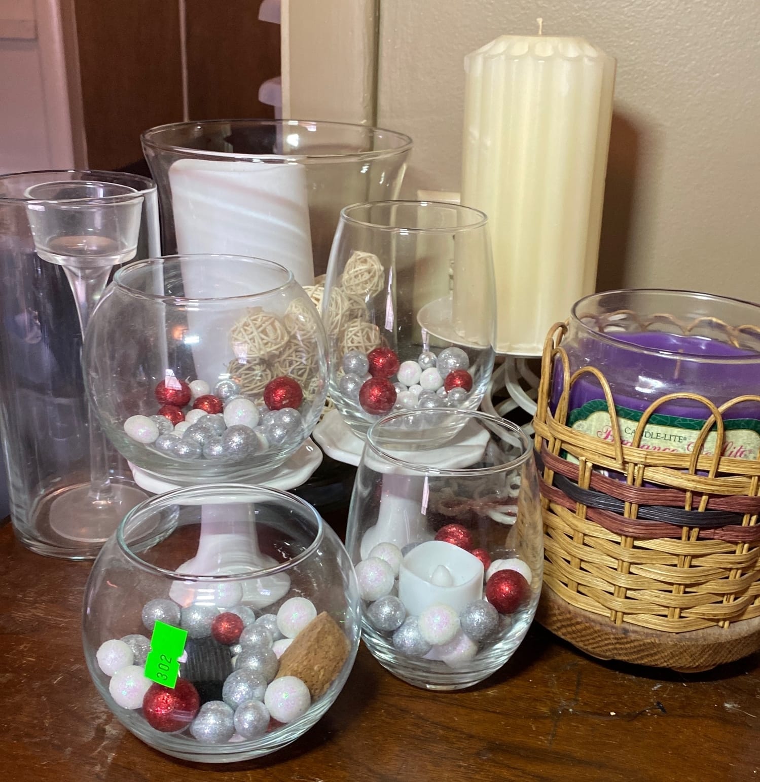 121 Etched glass oil candle, jars, Corelle plates and bowls, tea pot, soap dispenser, measuring cup, misc. contents as shown in pictures
