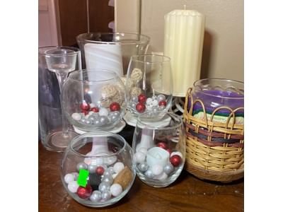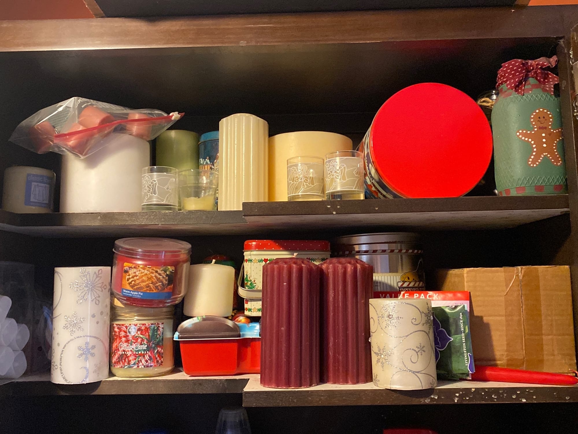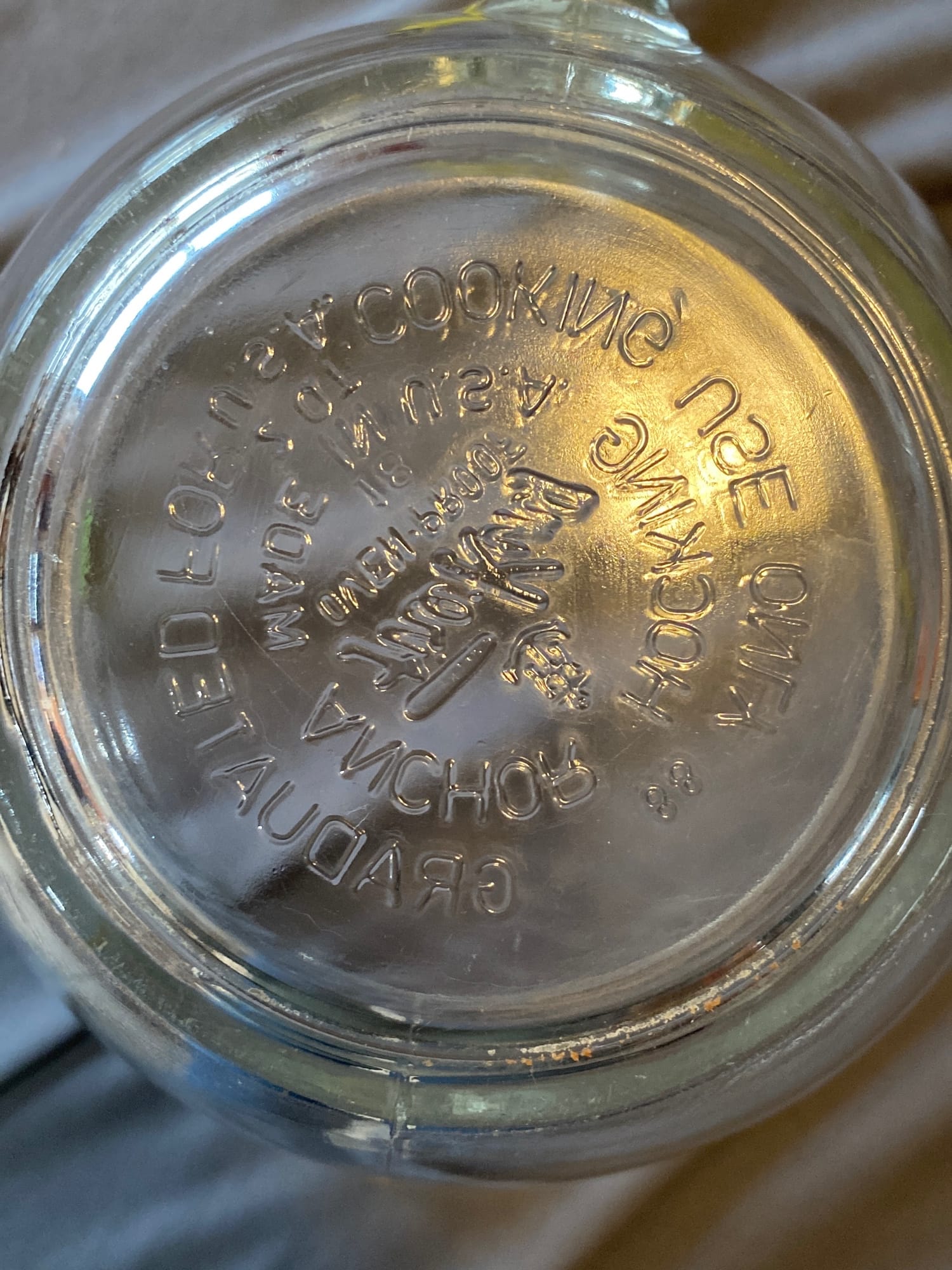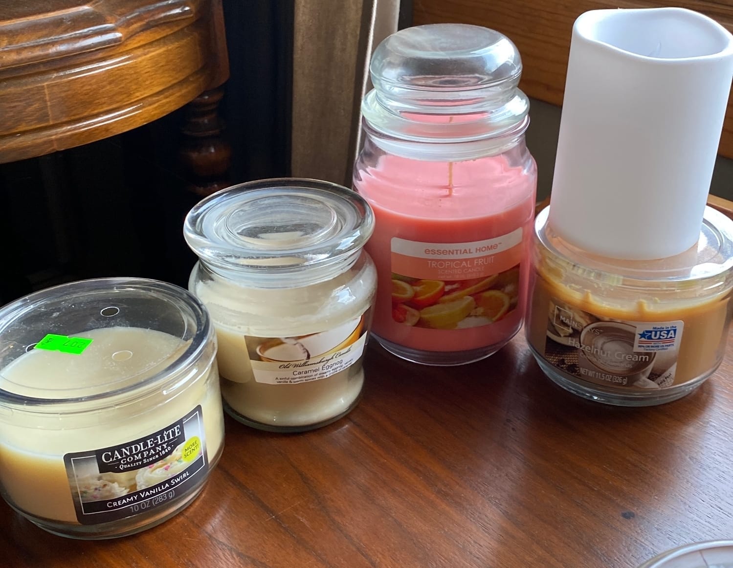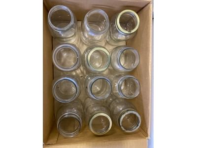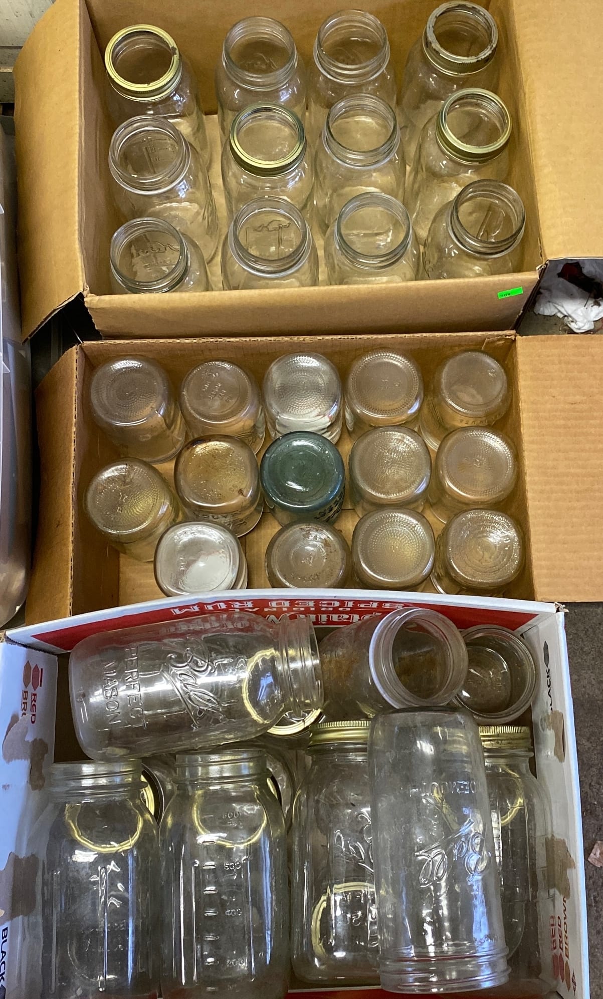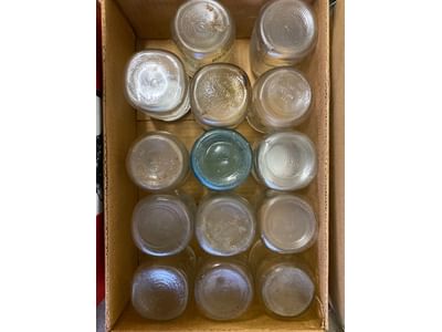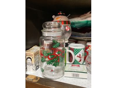121 Etched glass oil candle, jars, Corelle plates and bowls, tea pot, soap dispenser, measuring cup, misc. contents as shown in pictures