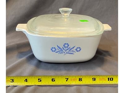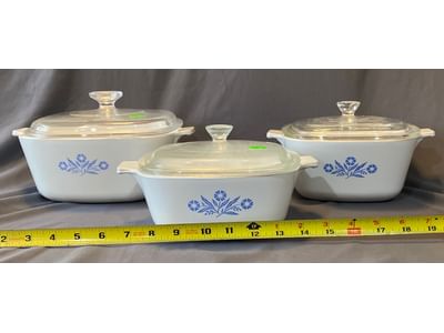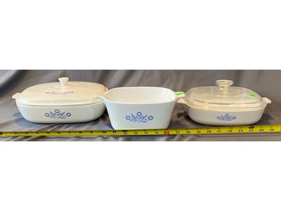 106 3 - Corningware baking dishes. 2 with lids, some chips