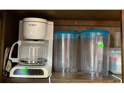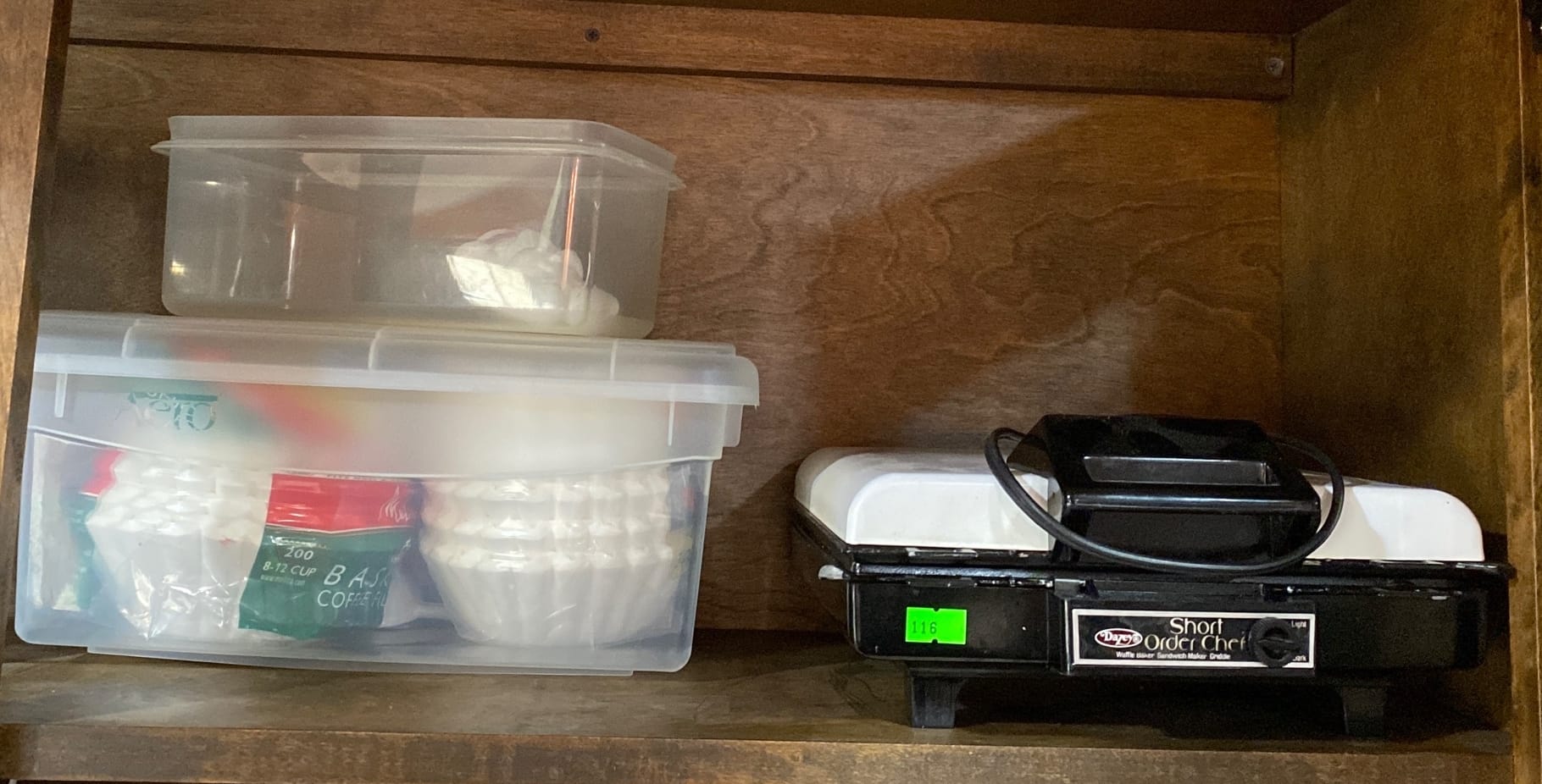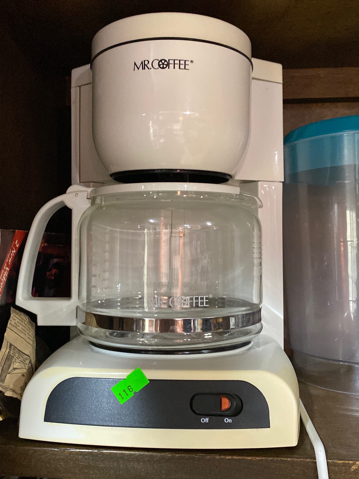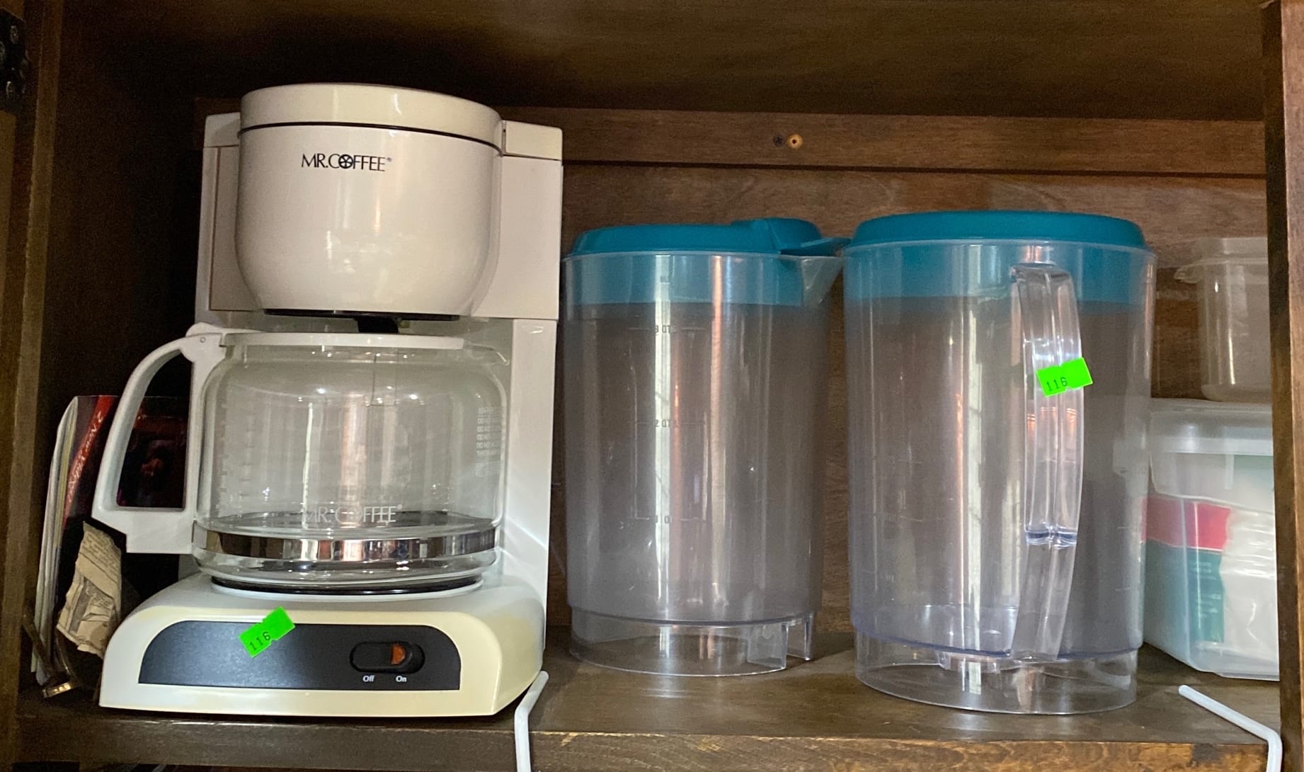 116 Mr. Coffee coffee maker, dazey short order grill, plastic pitchers, storage containers, coffee filters