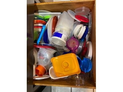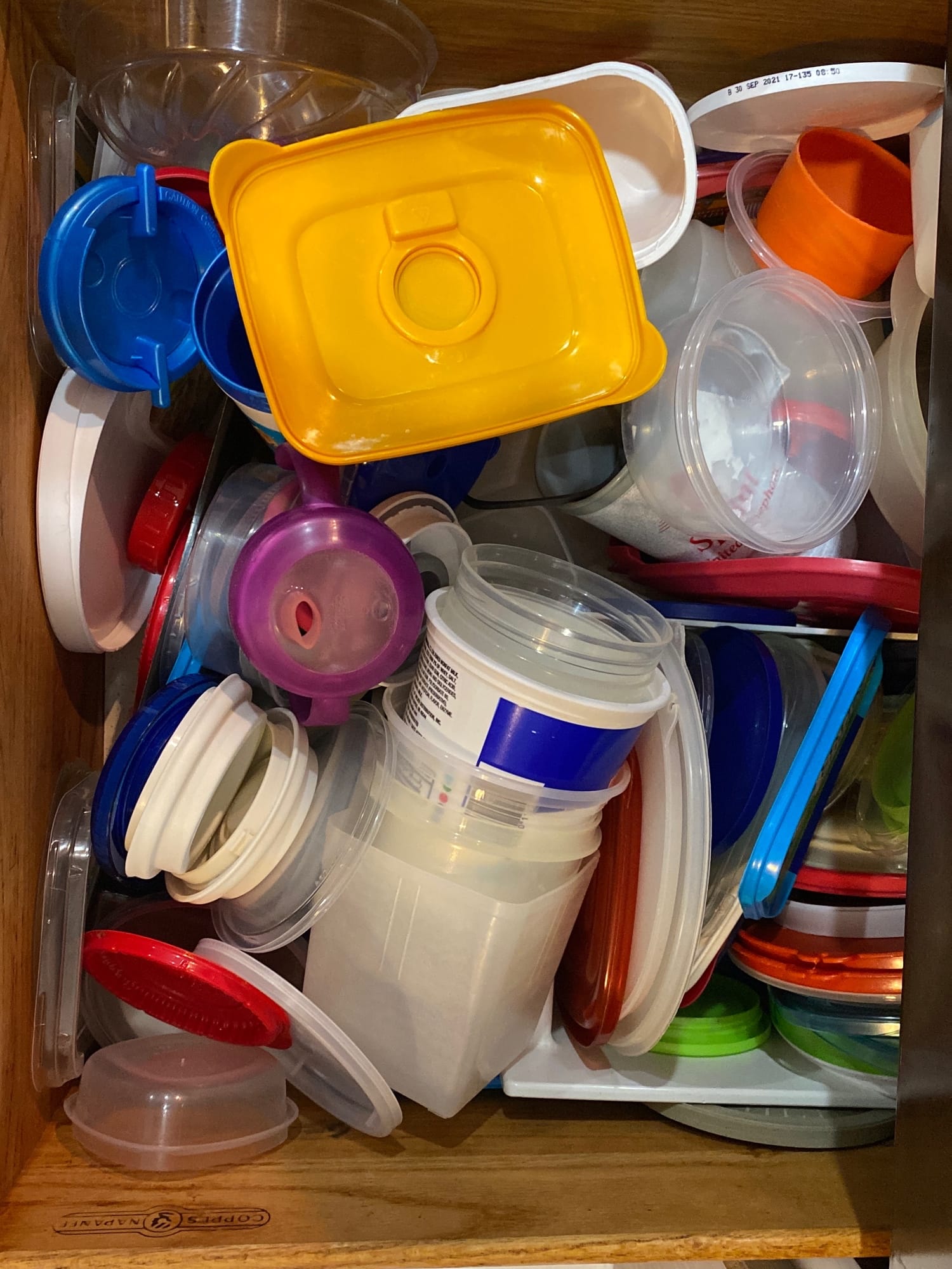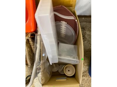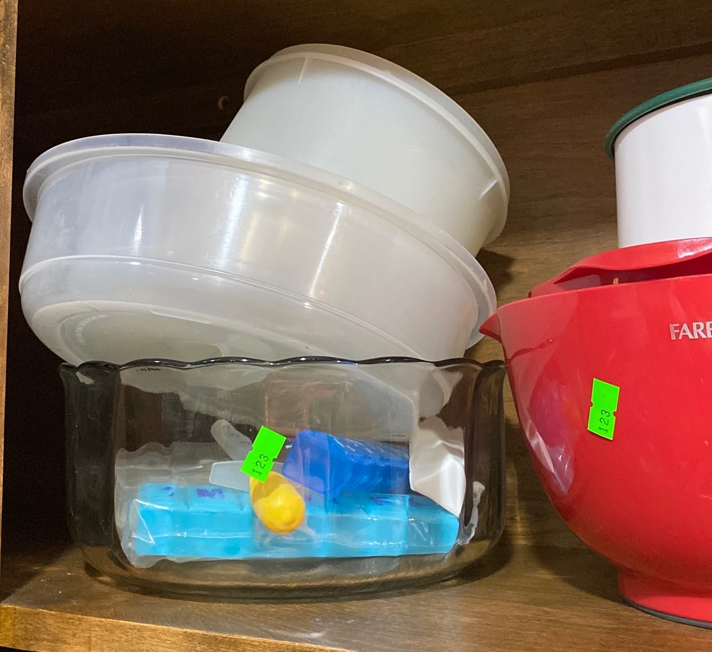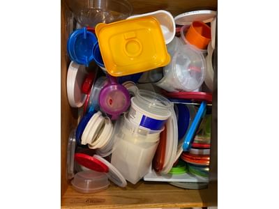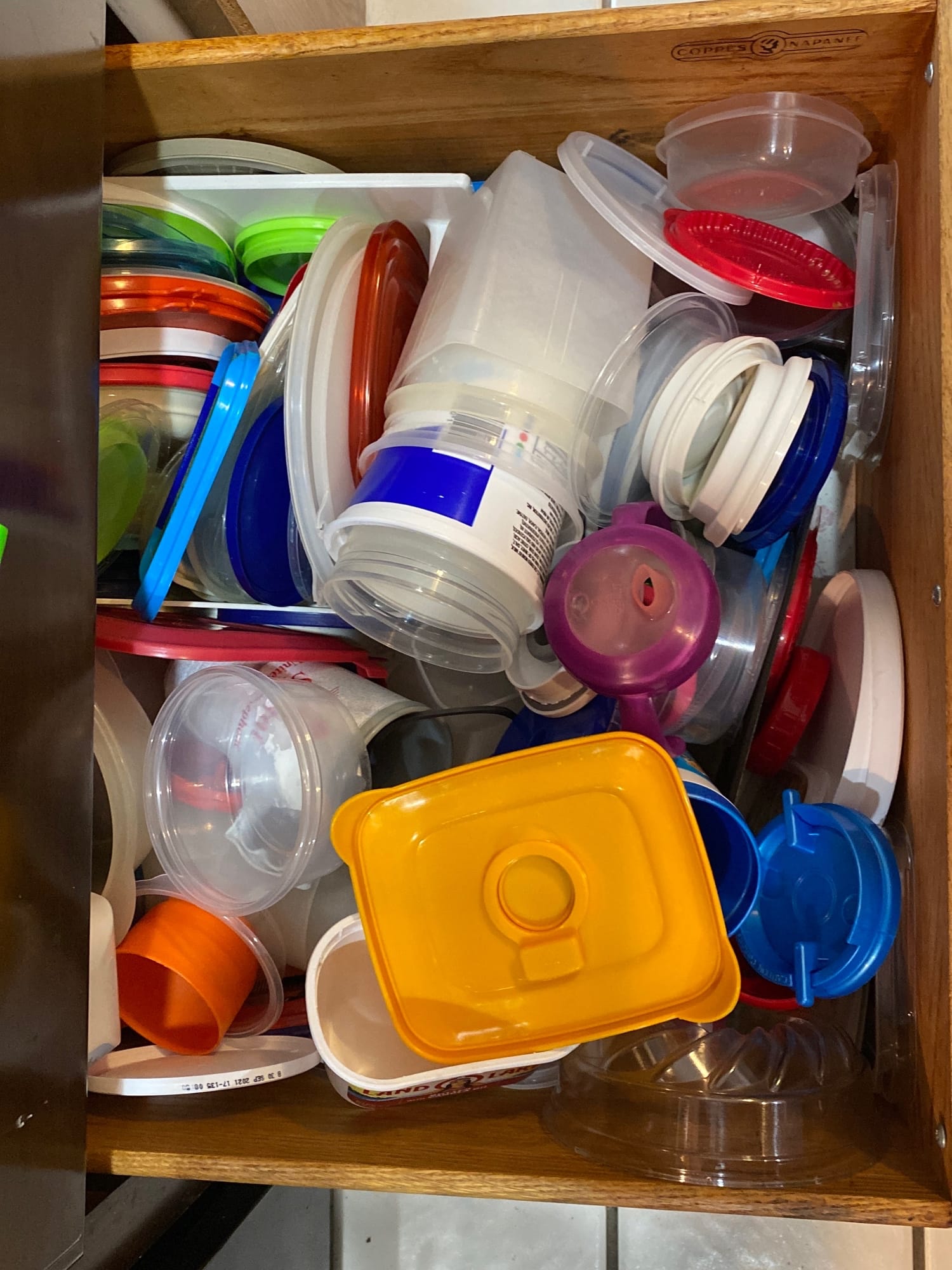 135 Plastic containers, Colander, popcorn container, pitcher, measuring cups, pot, contents as shown in pictures