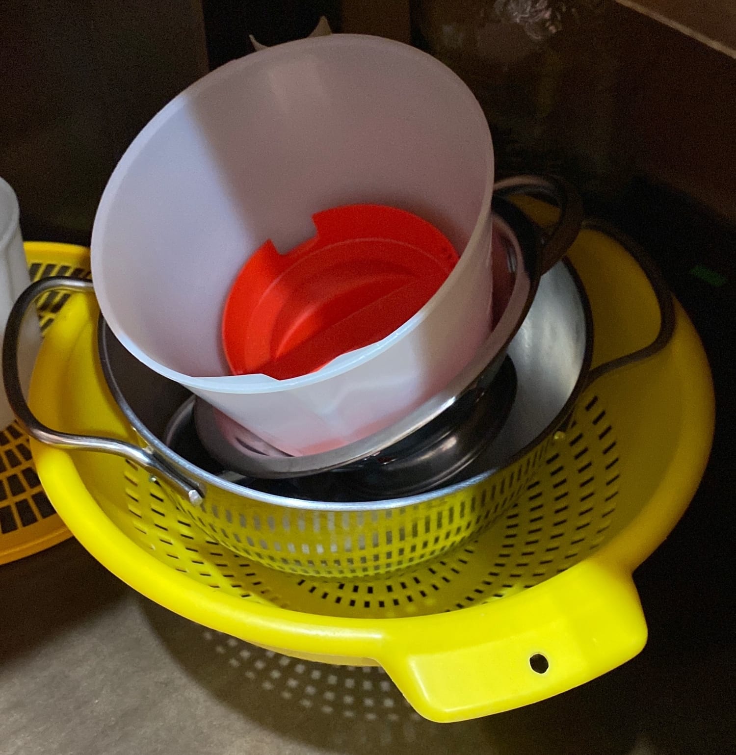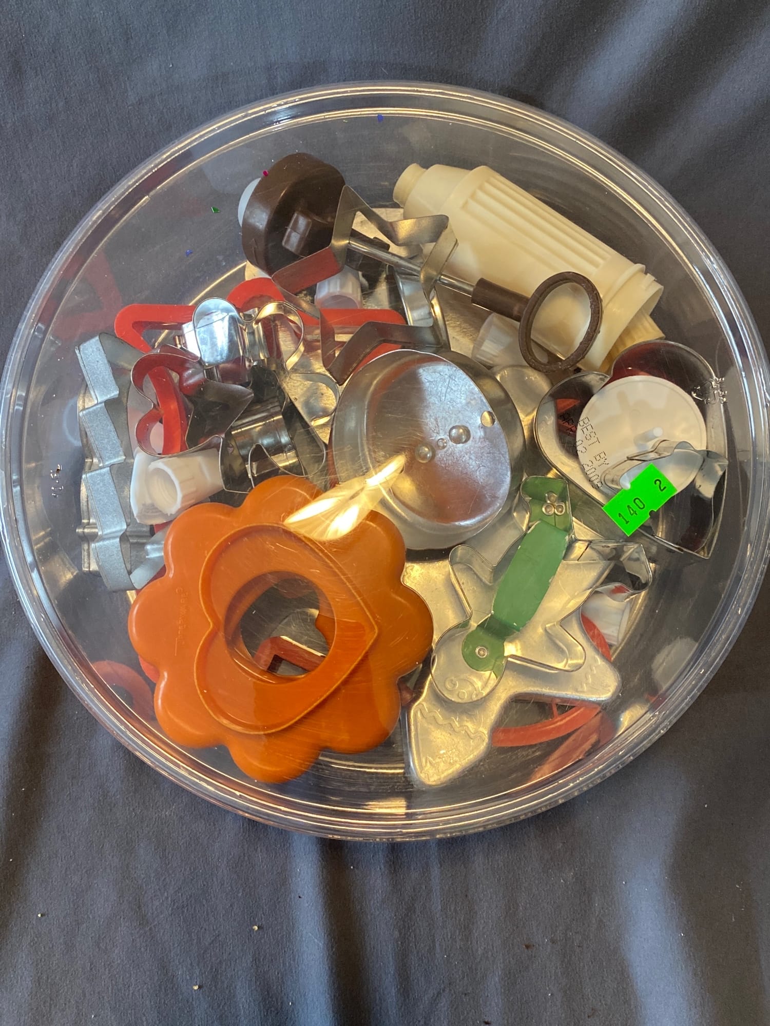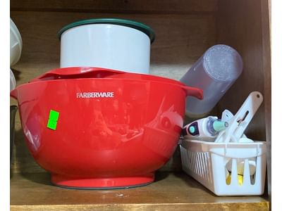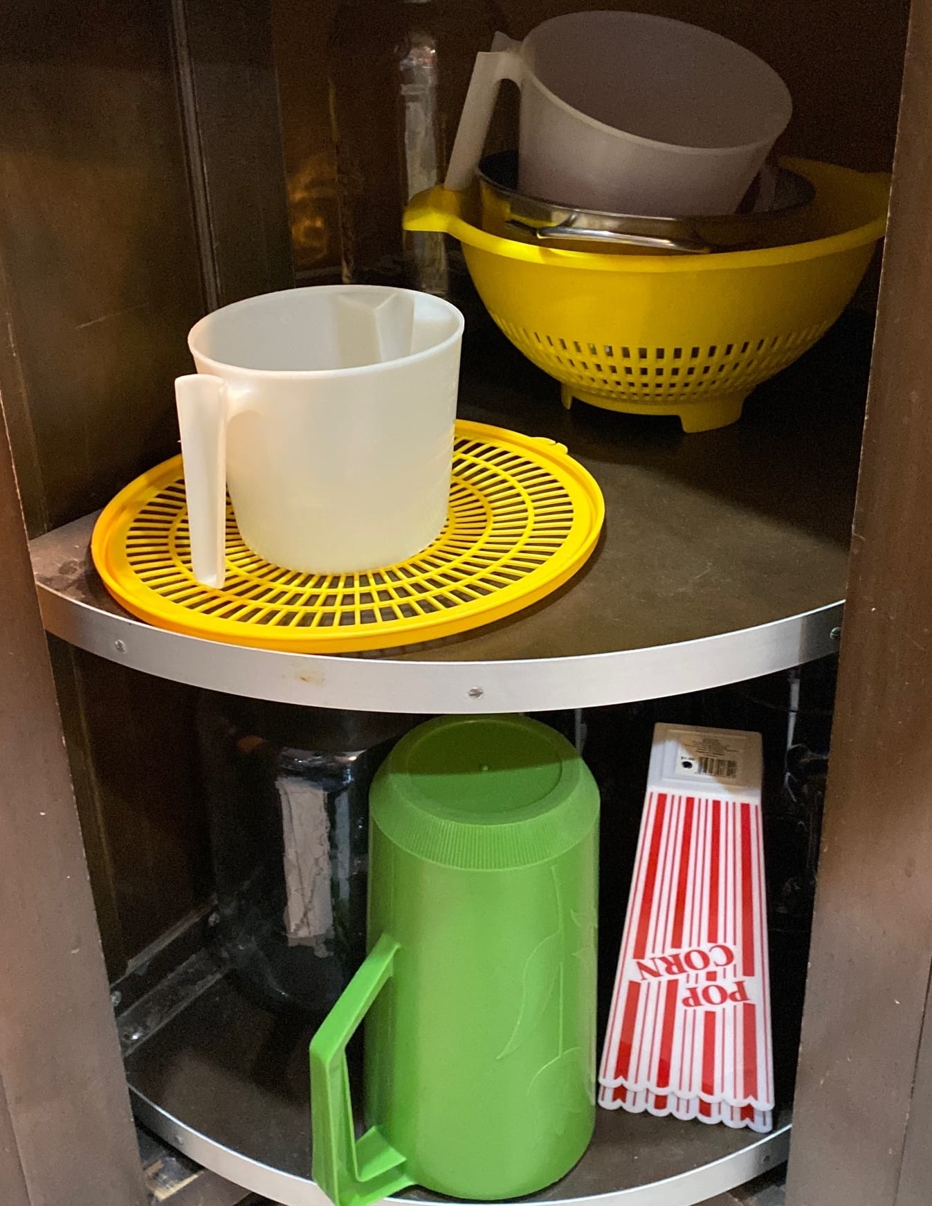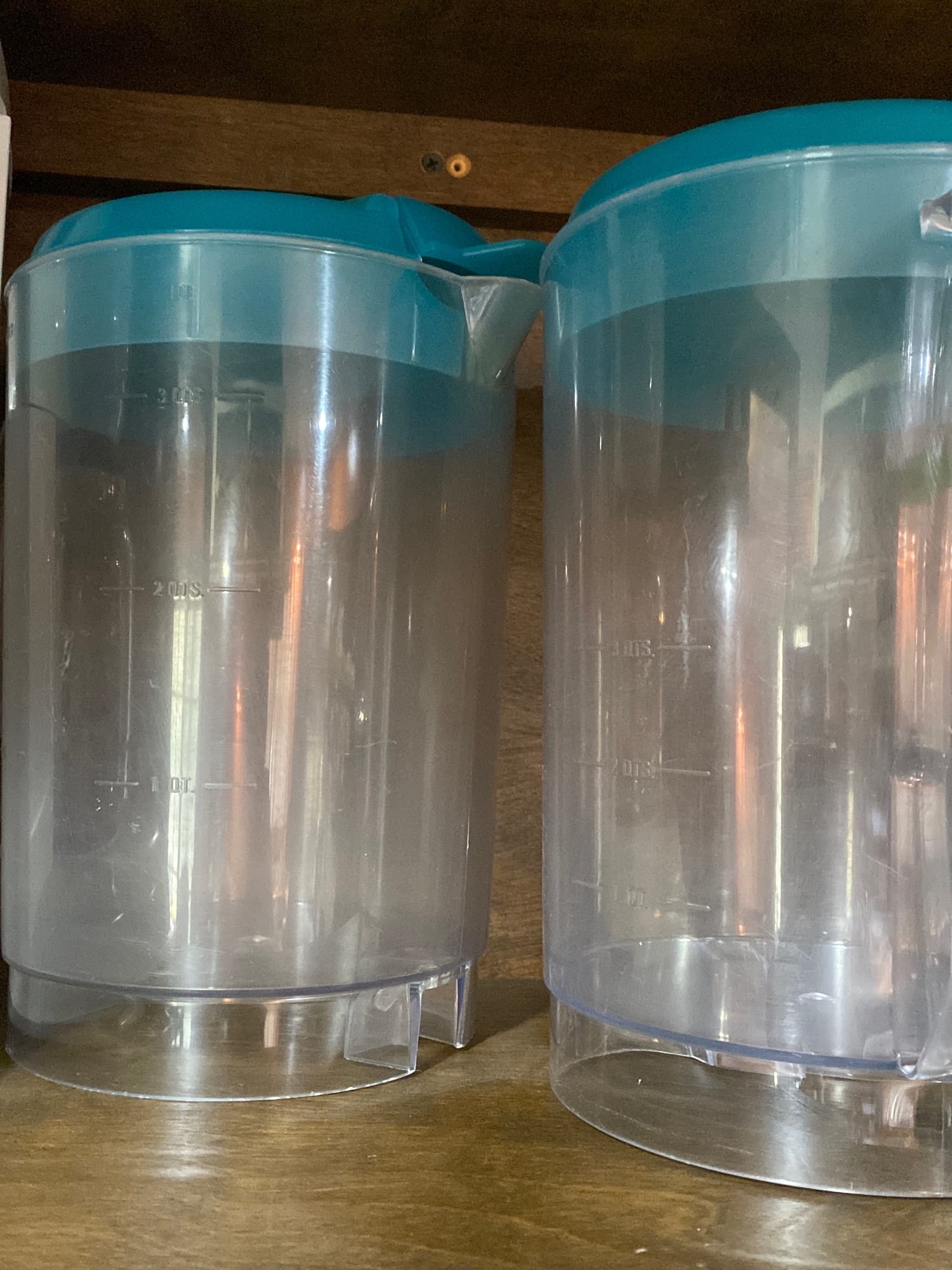 135 Plastic containers, Colander, popcorn container, pitcher, measuring cups, pot, contents as shown in pictures