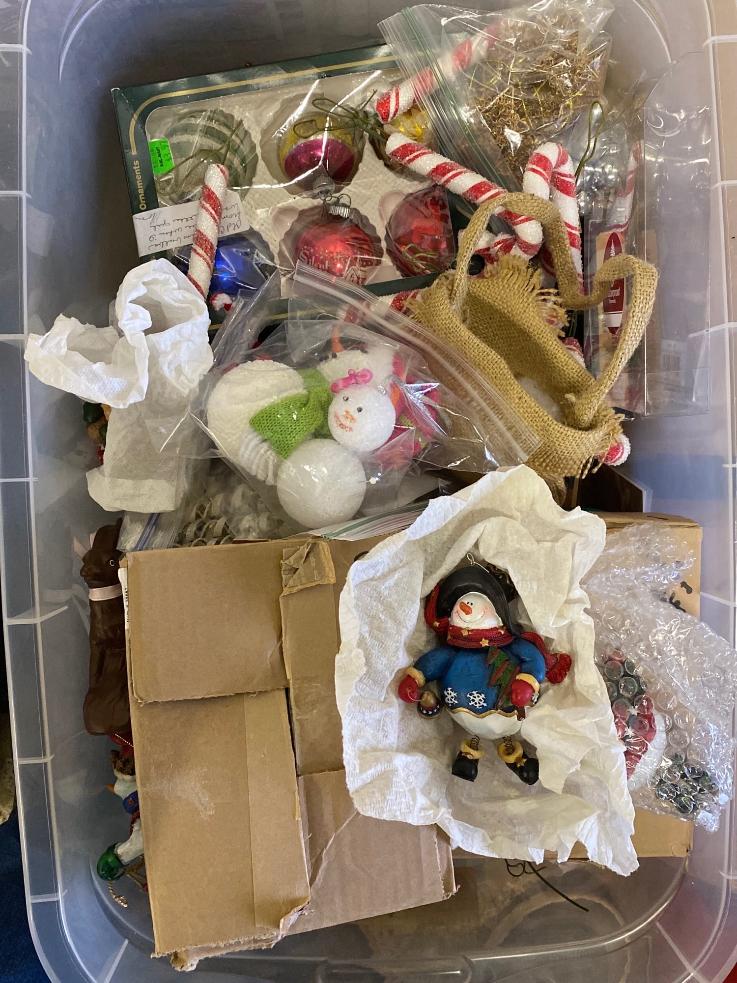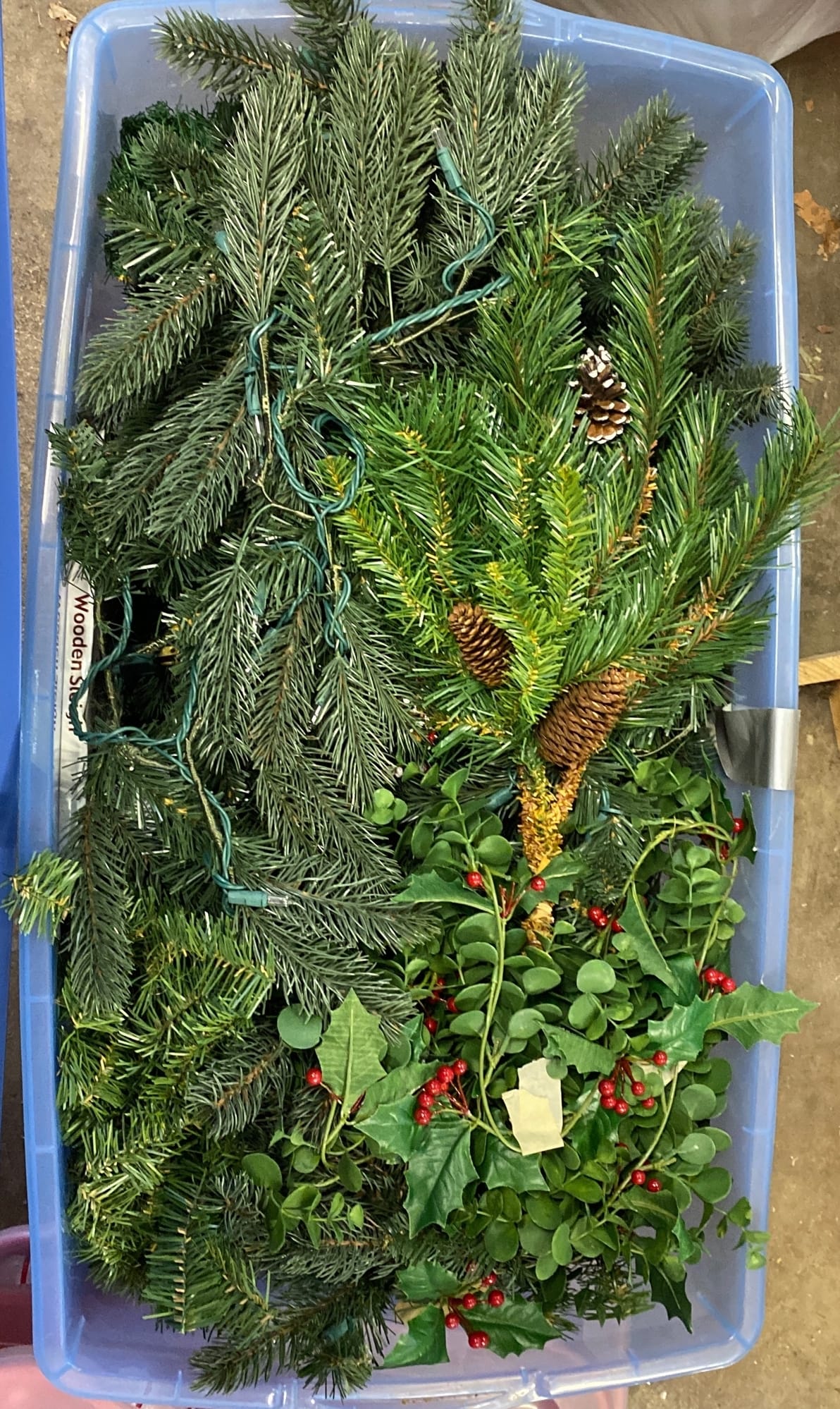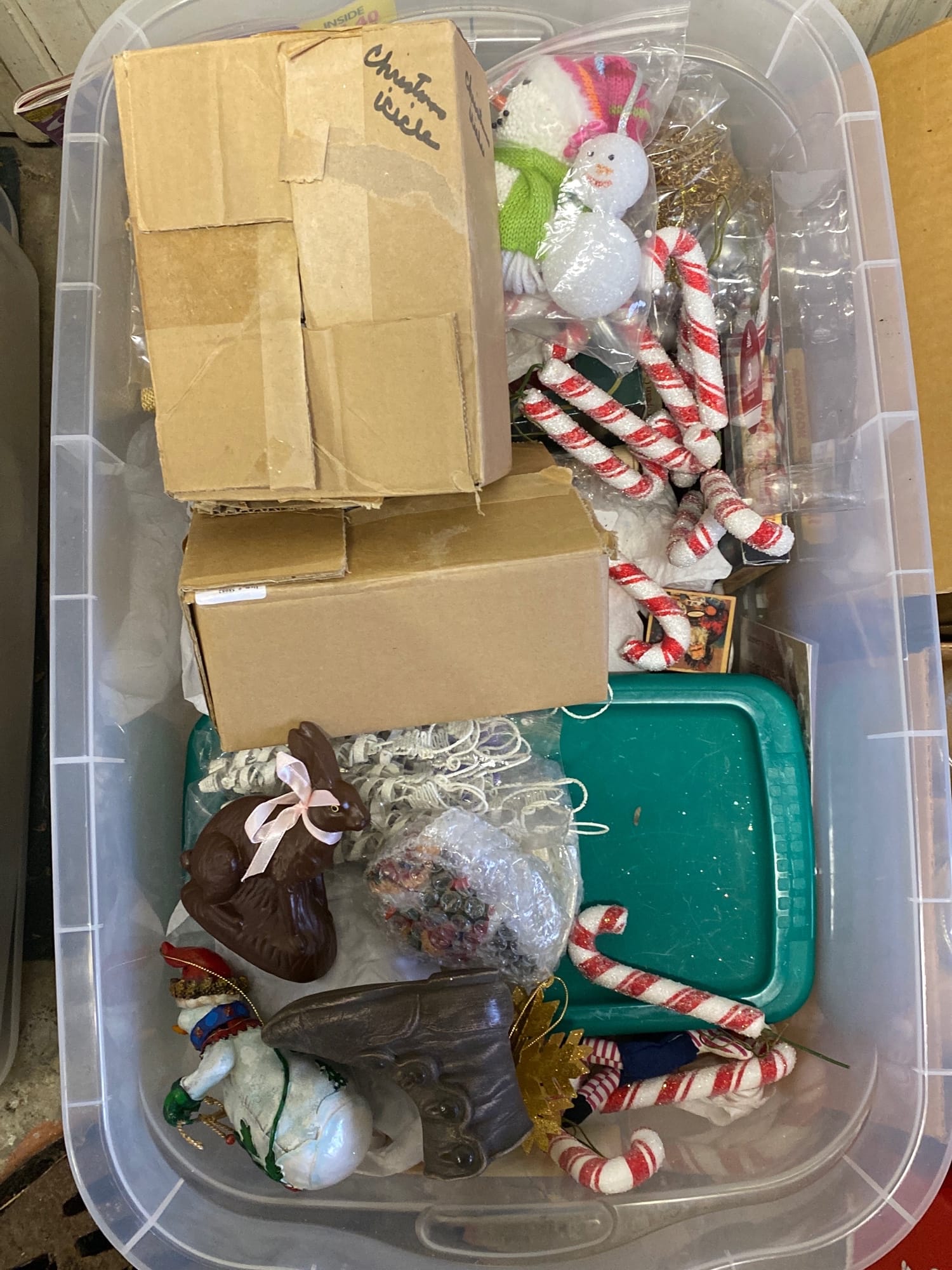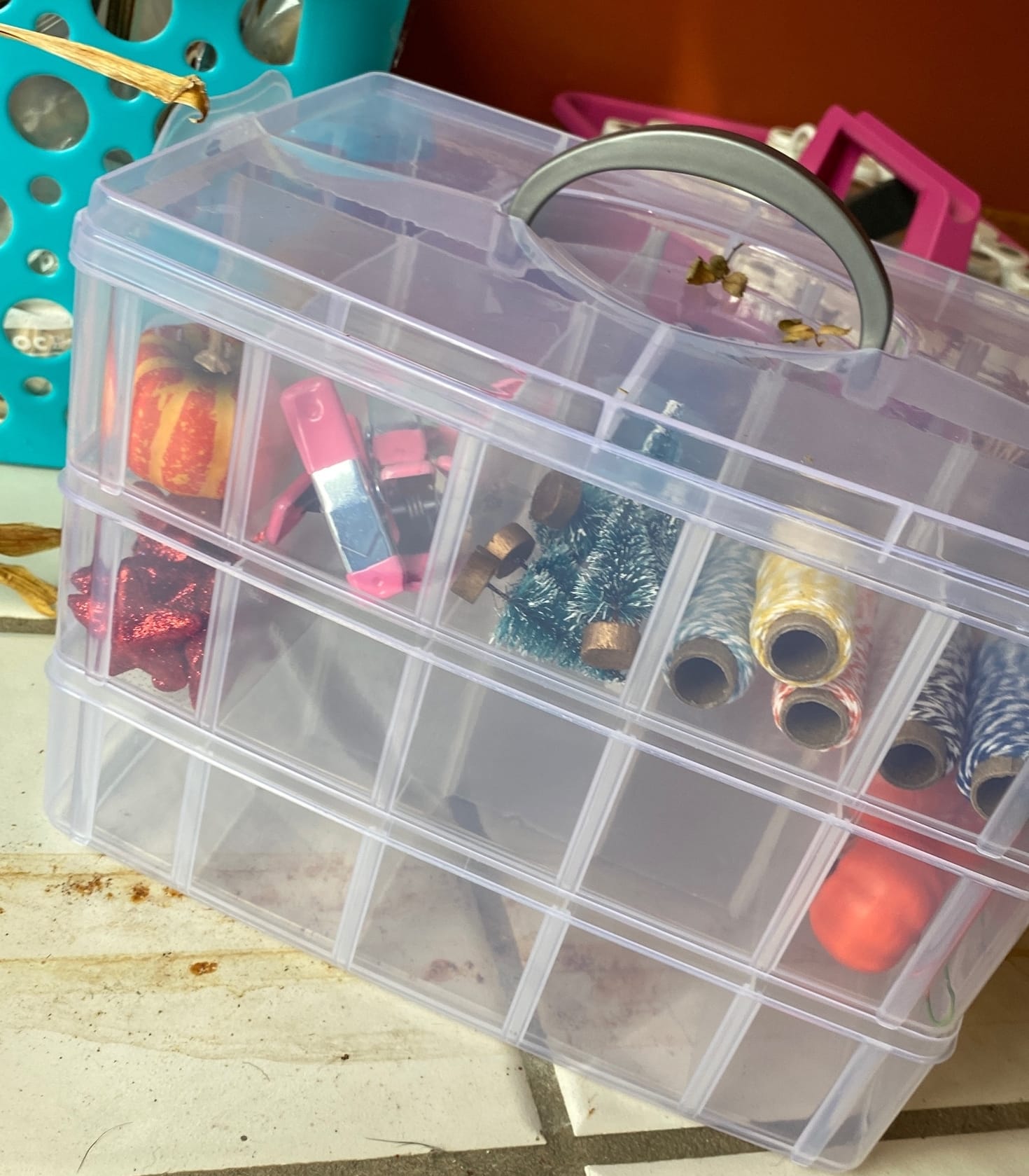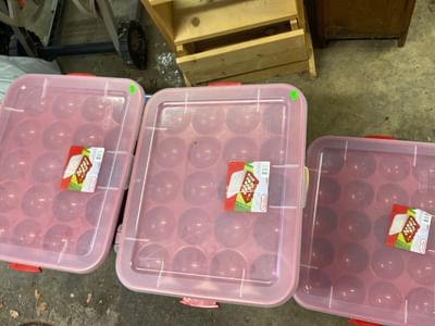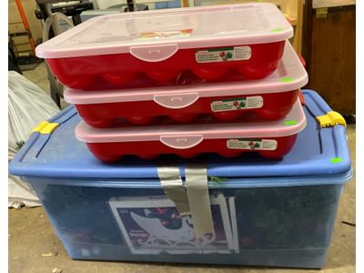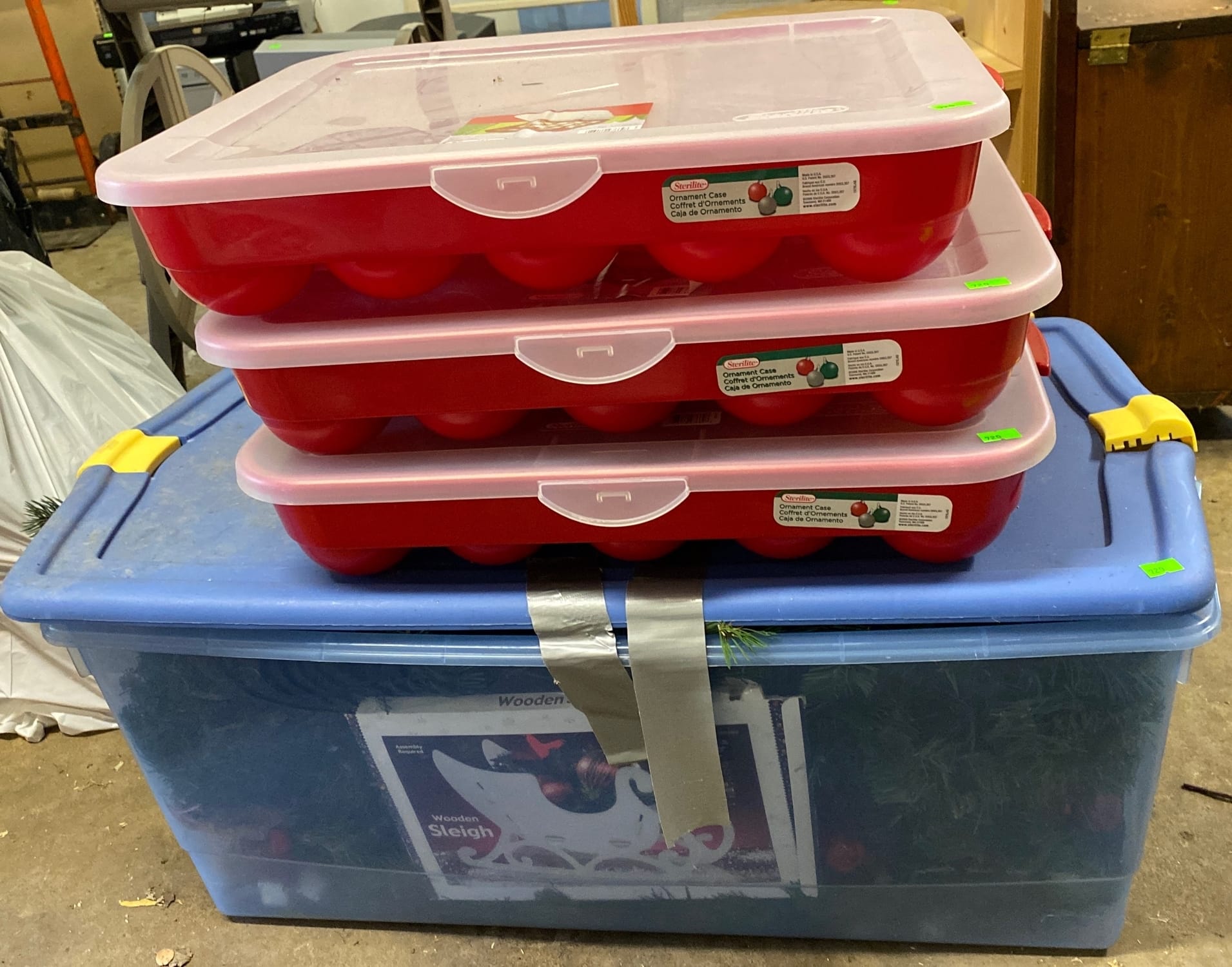 729 3 empty plastic ornament storage containers, plastic tote with greenery