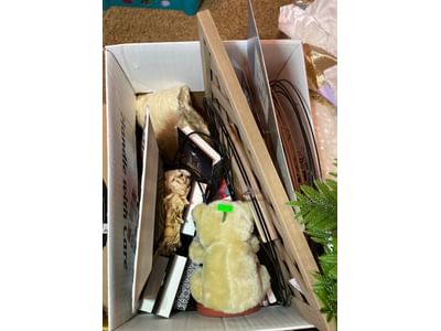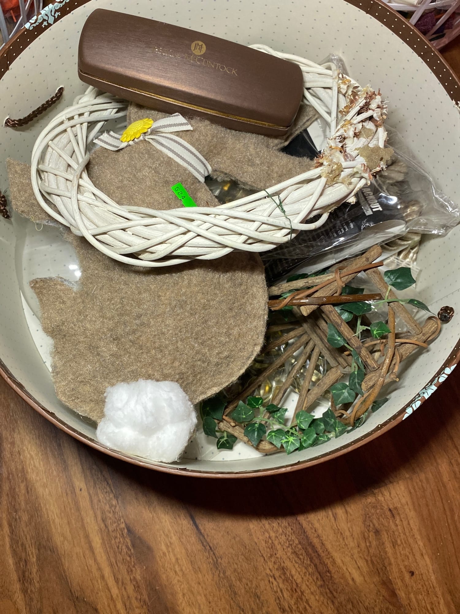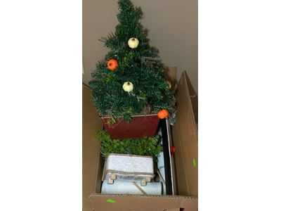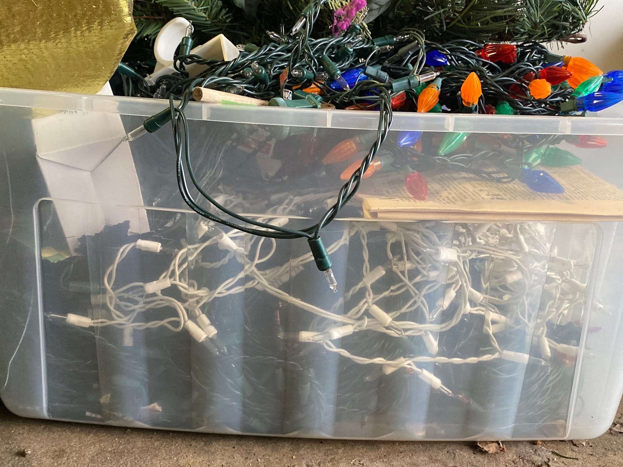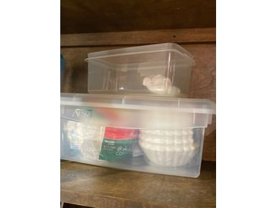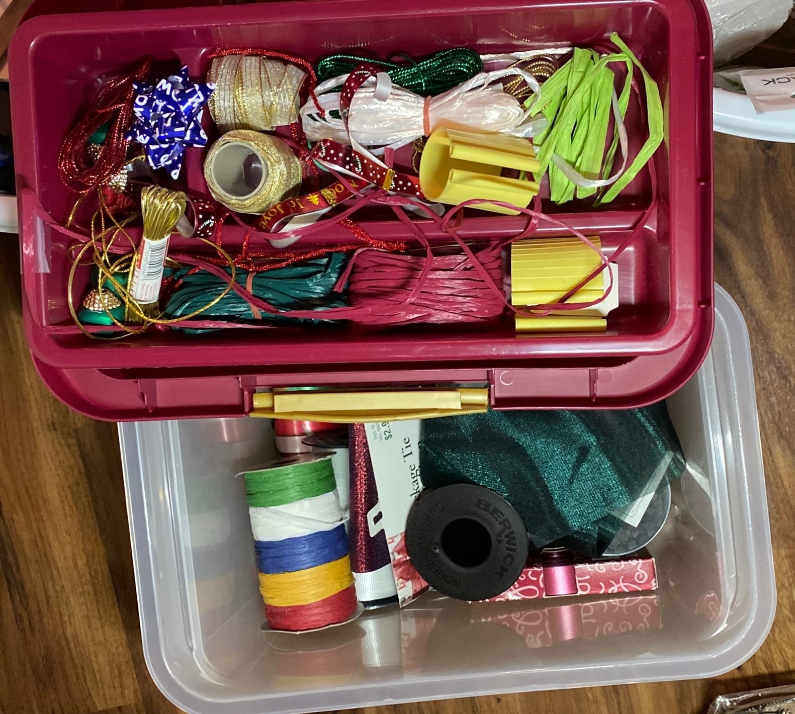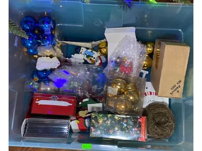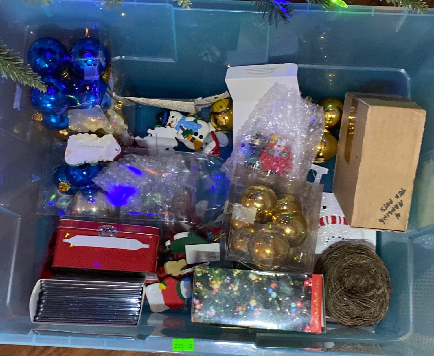 729 3 empty plastic ornament storage containers, plastic tote with greenery