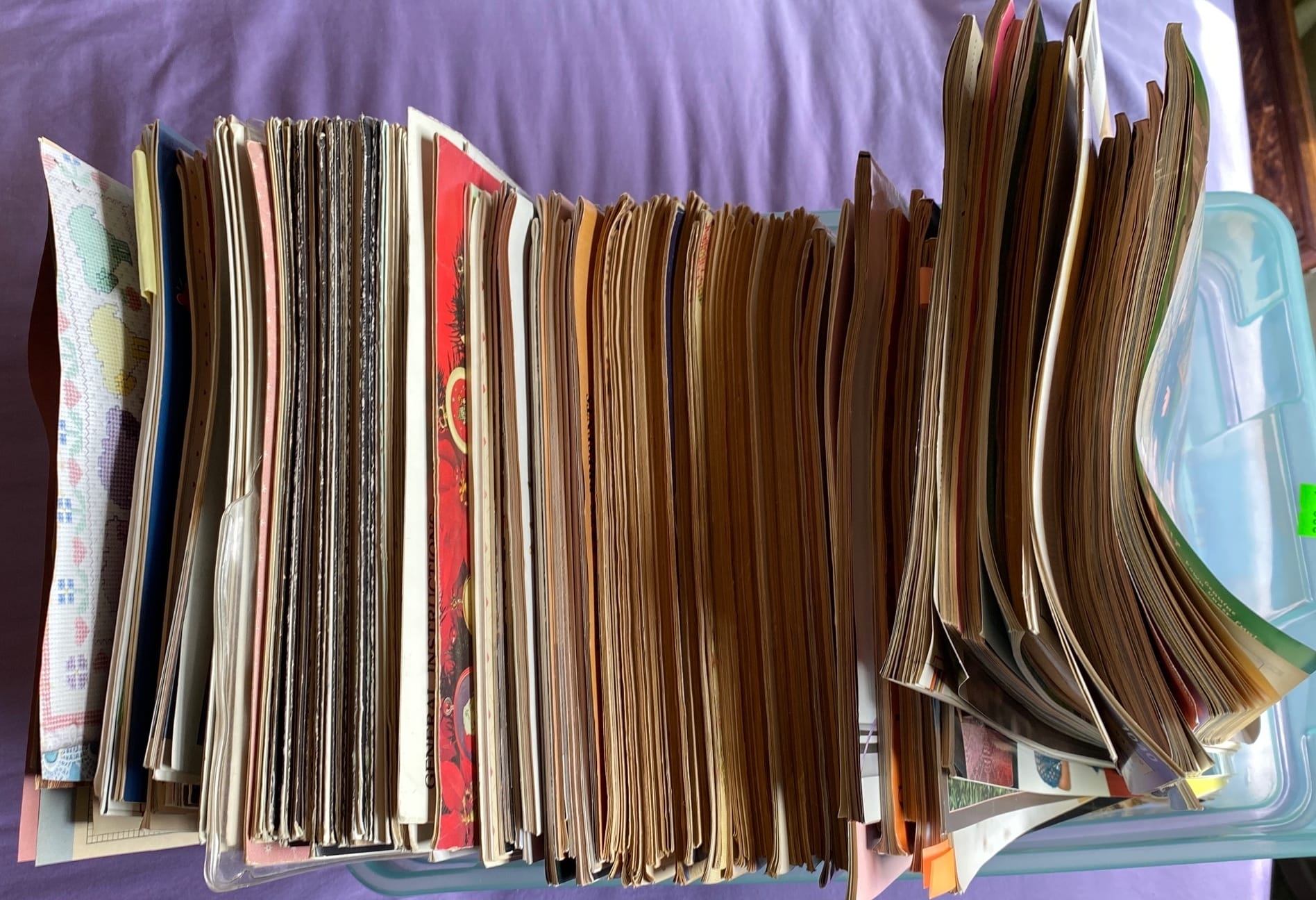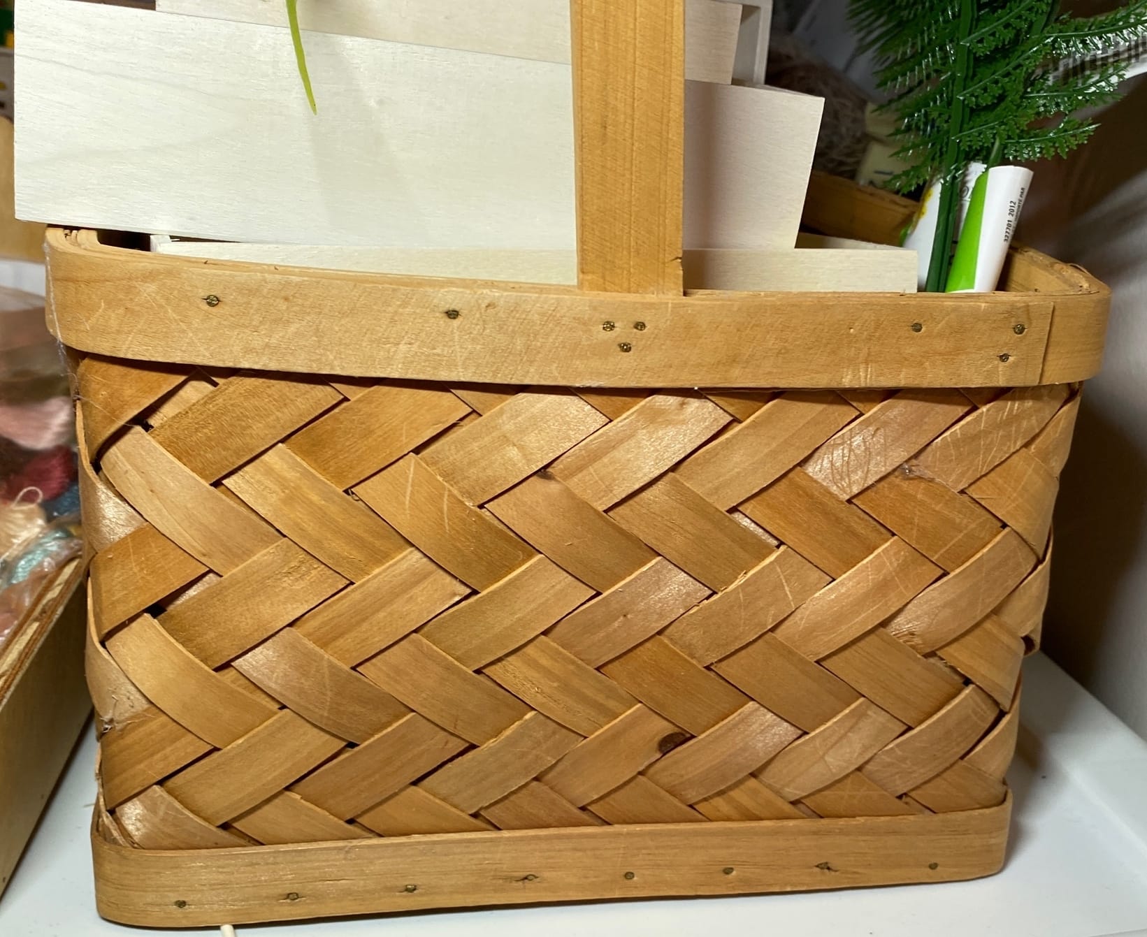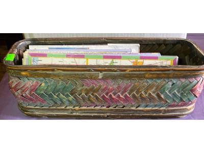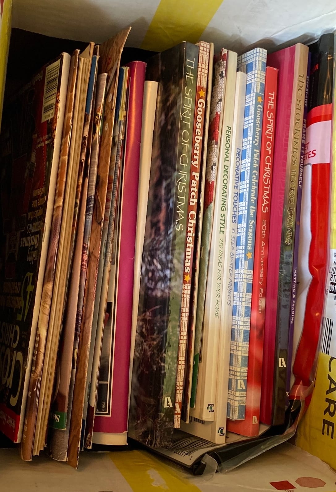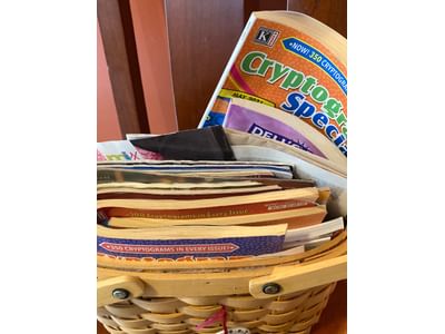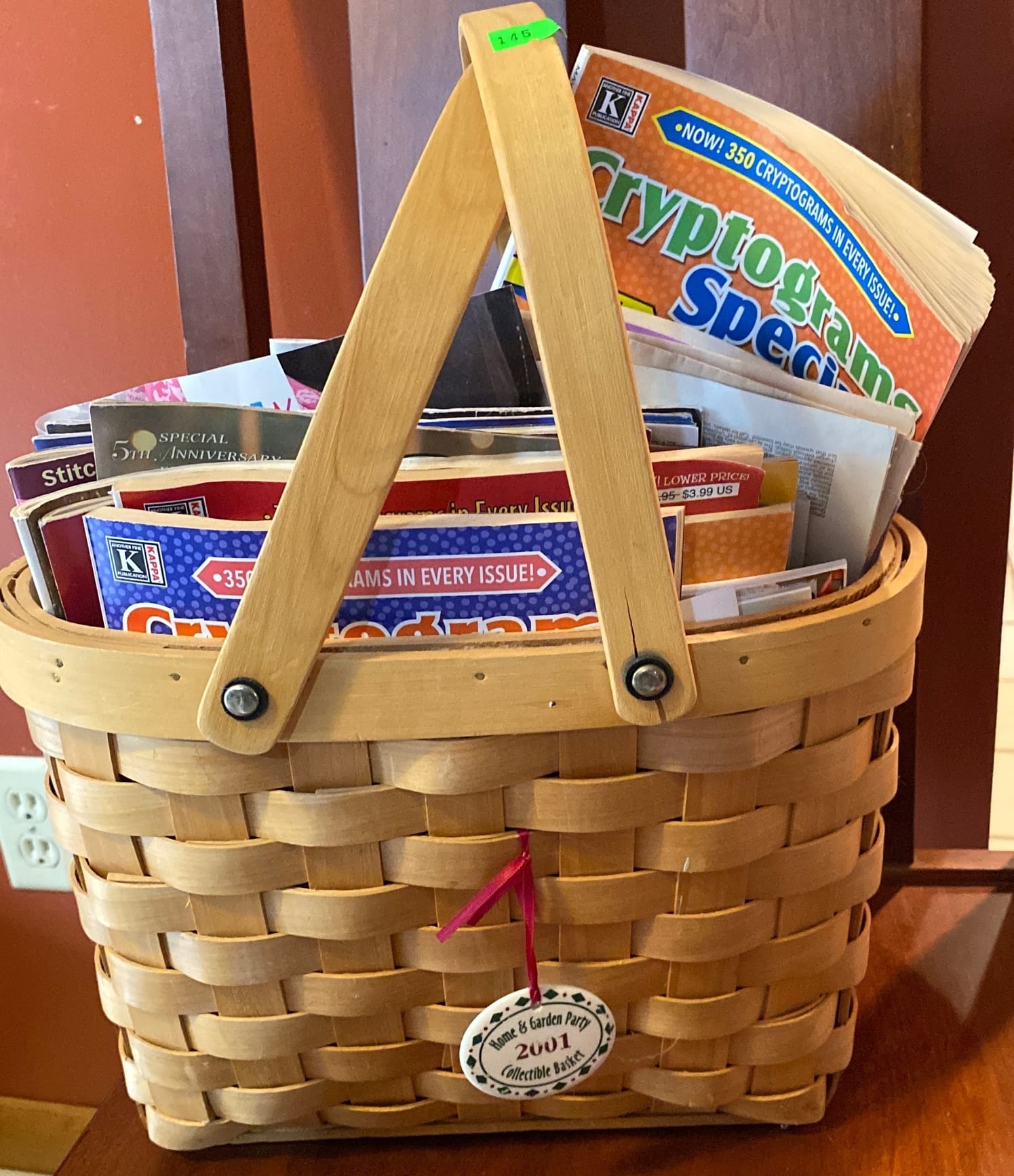 145 Puzzle books and craft magazines in home and garden wood basket 12x8x15