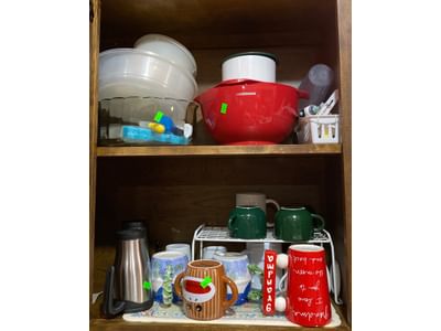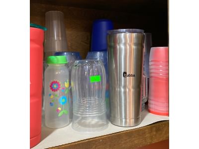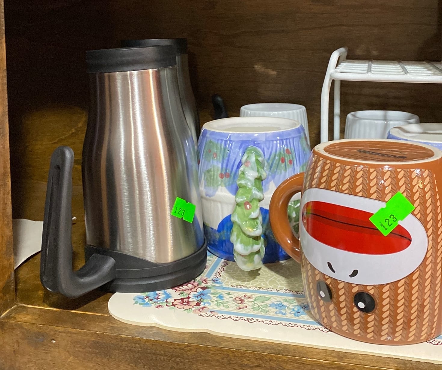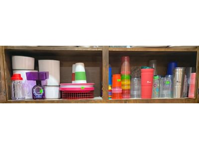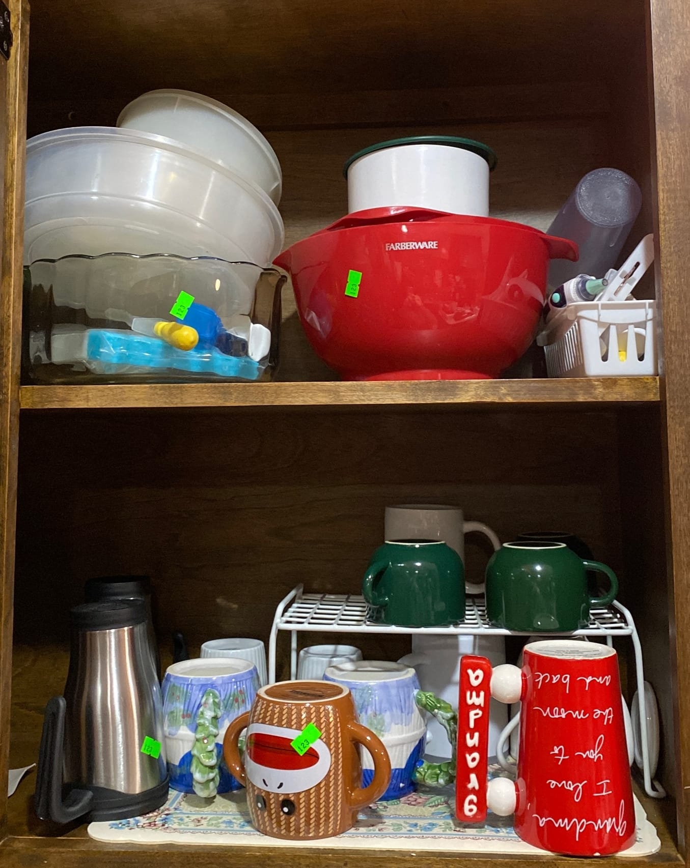 123 Coffee mugs, travel mugs, Farberware, rack and plastic containers contents as shown in pictures