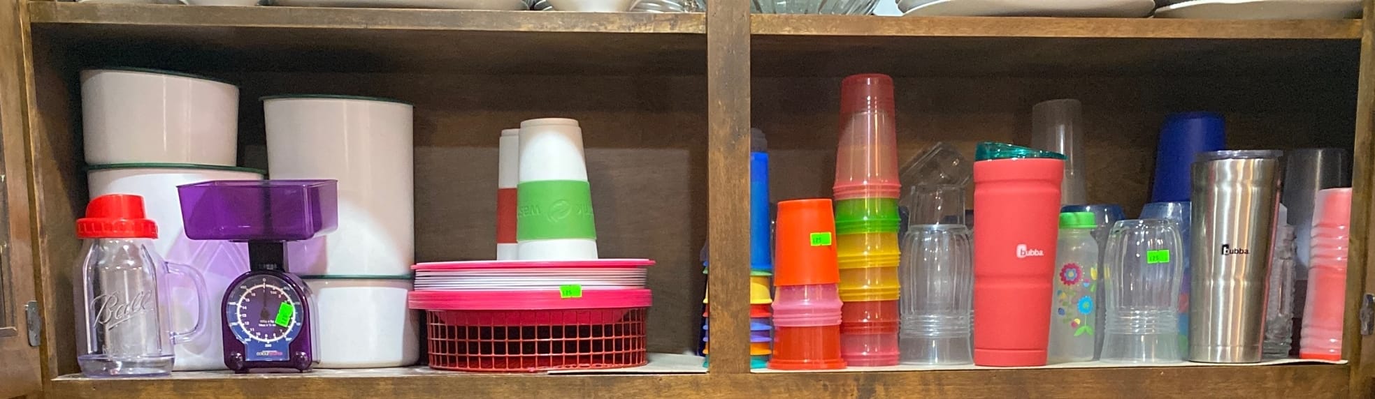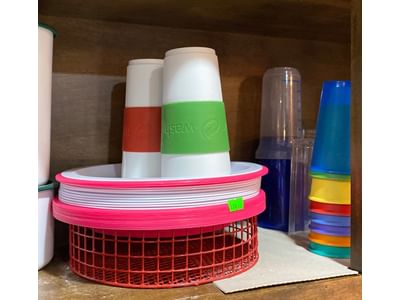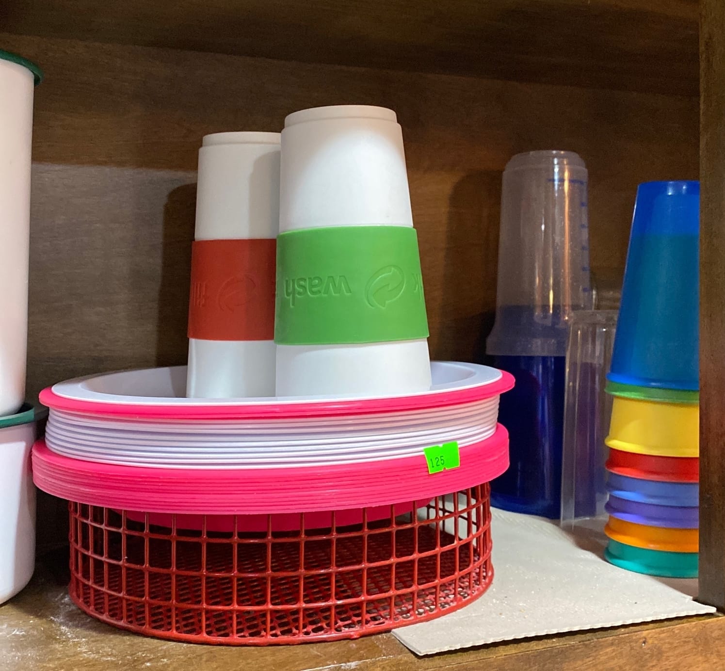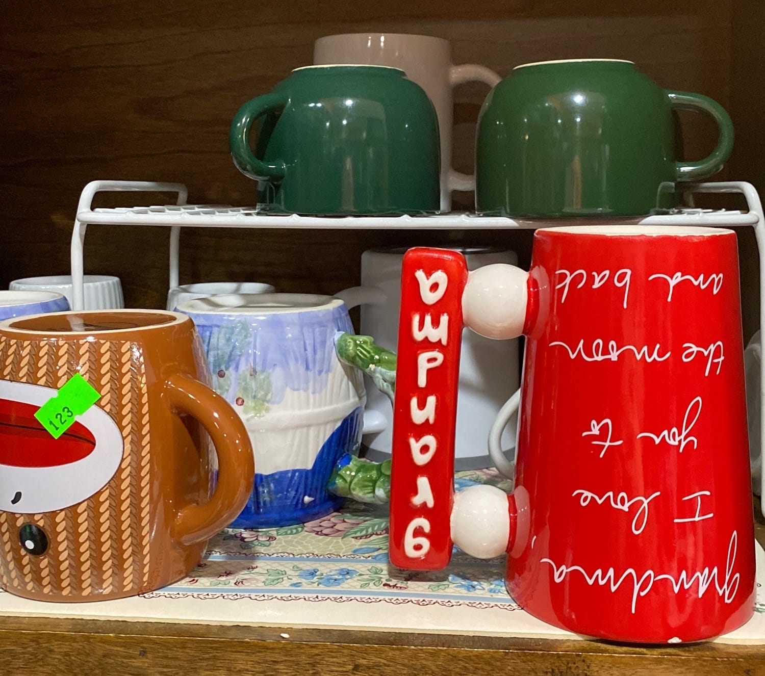 123 Coffee mugs, travel mugs, Farberware, rack and plastic containers contents as shown in pictures