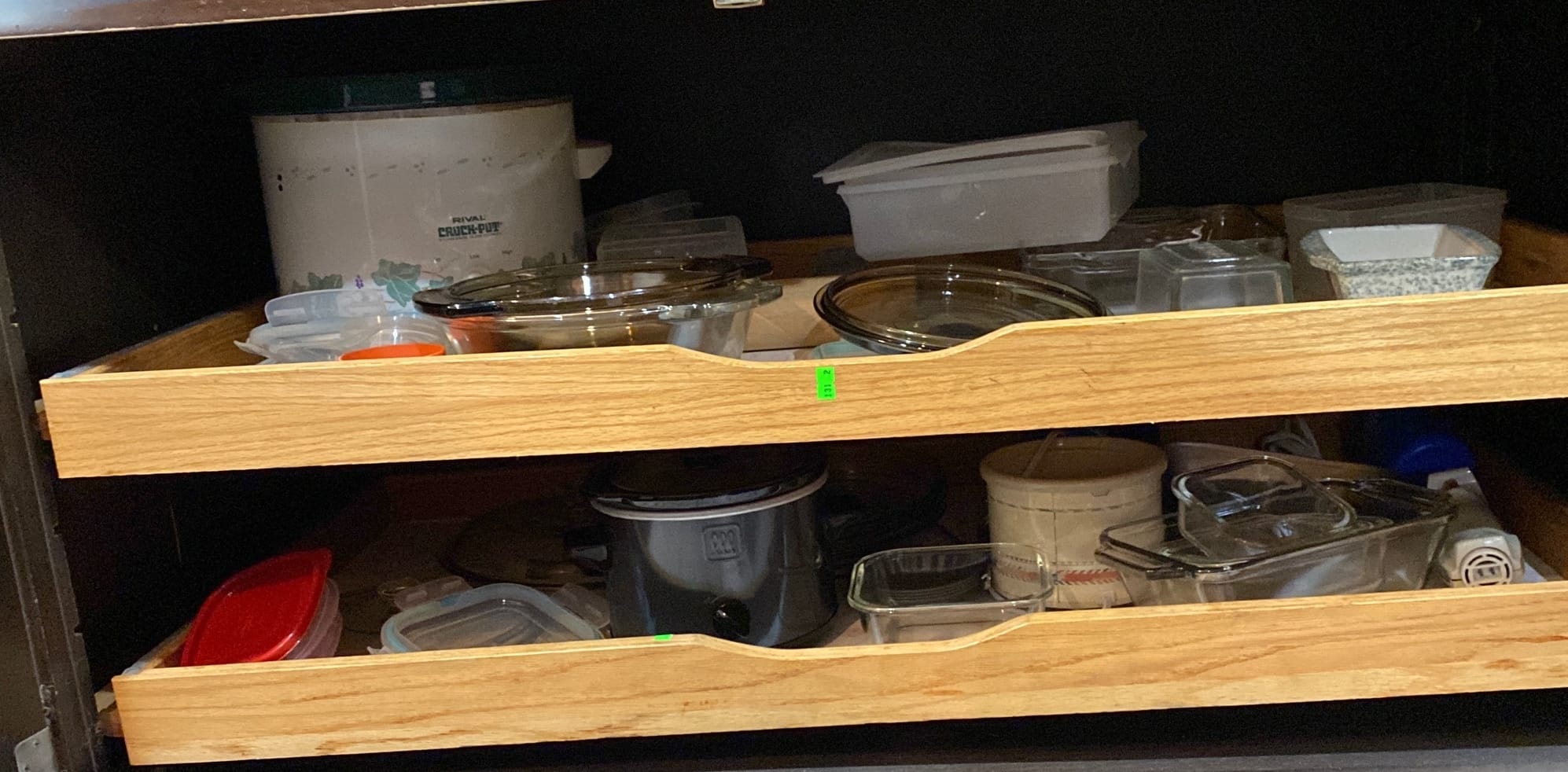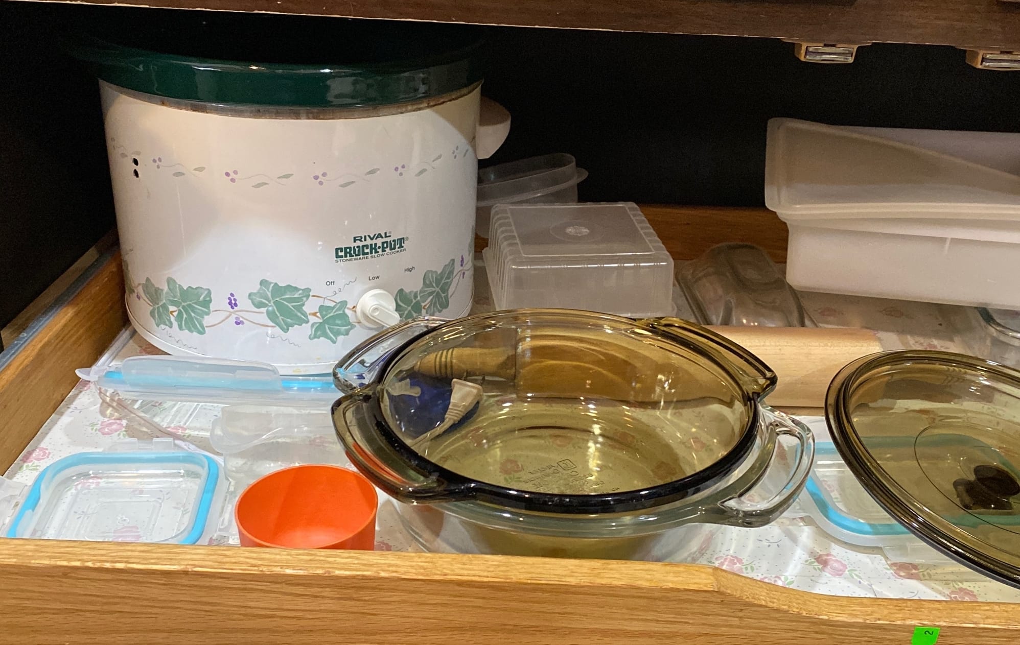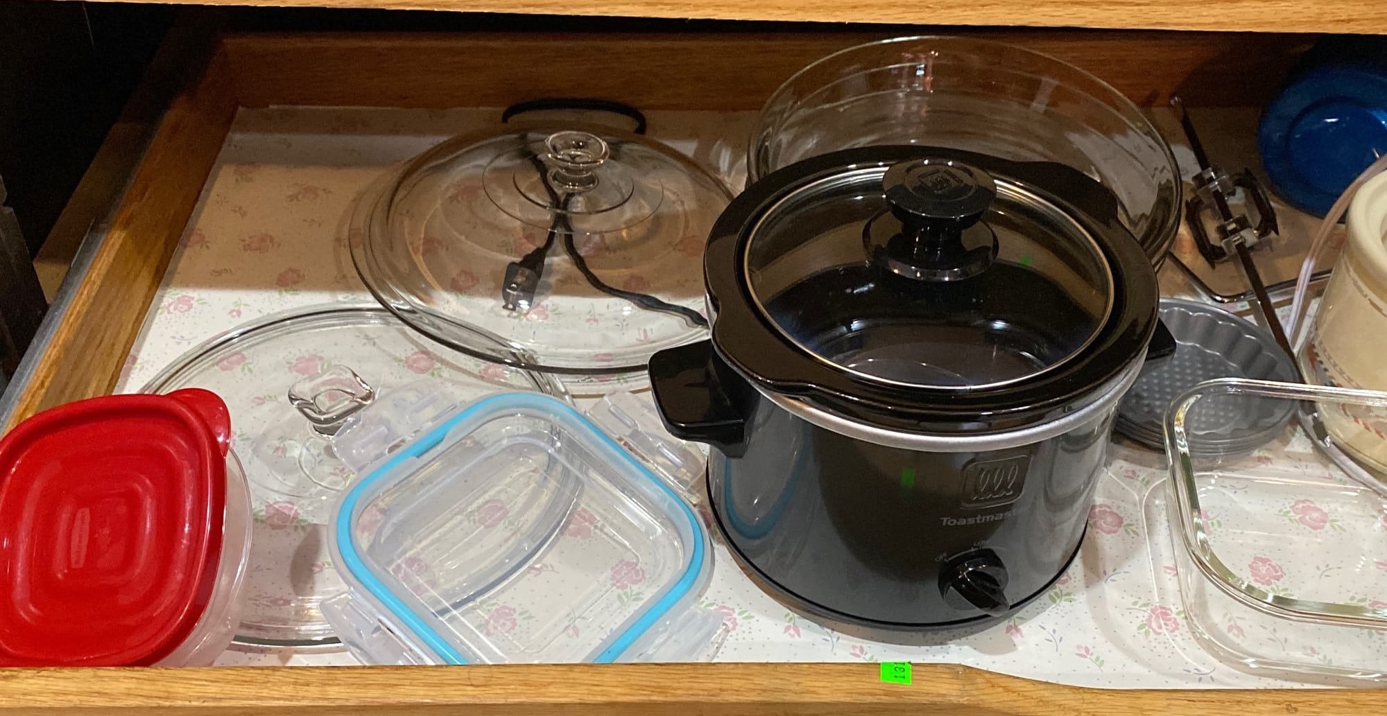 131 Rival crock pot, glass bakeware, toastmaster food warmer, storage containers, contents as shown in pictures