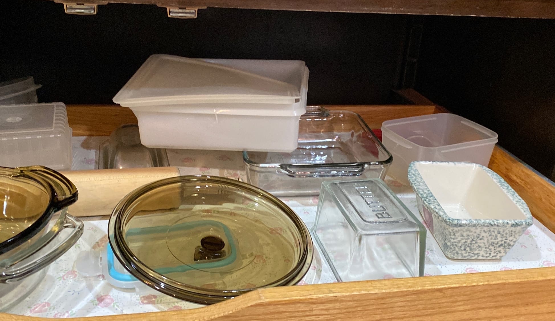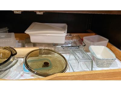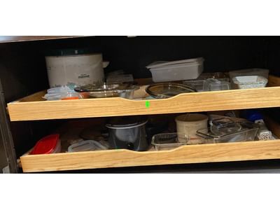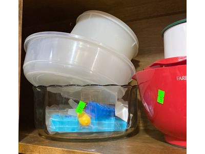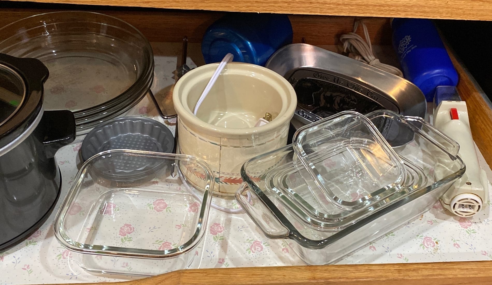131 Rival crock pot, glass bakeware, toastmaster food warmer, storage containers, contents as shown in pictures