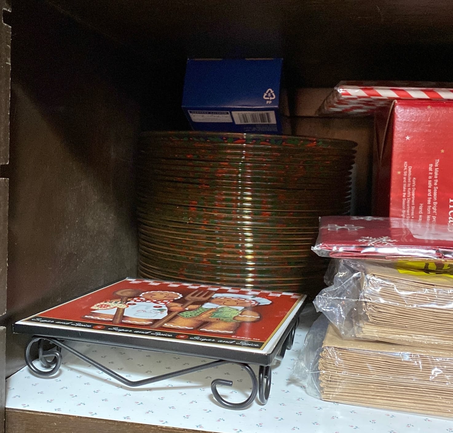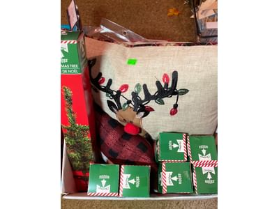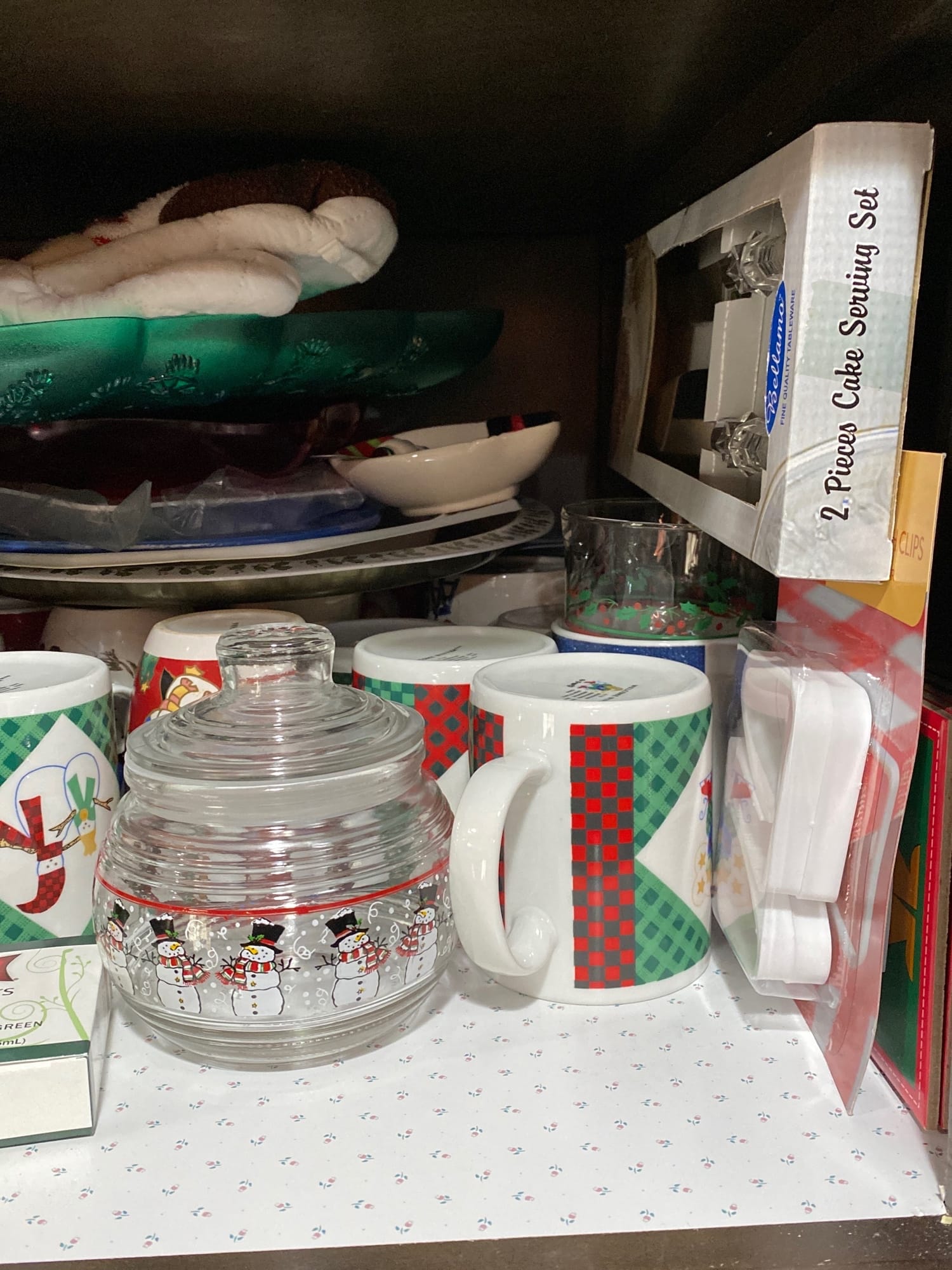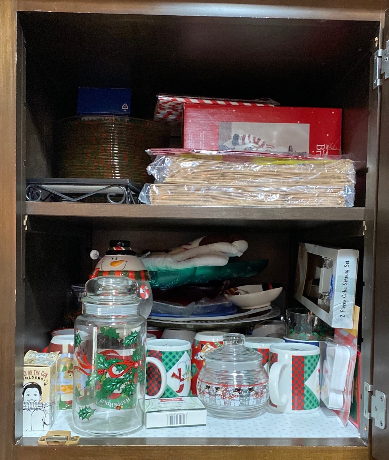 128 Holiday decorations, mugs, corn holders, office supplies, plates, contents as shown in pictures