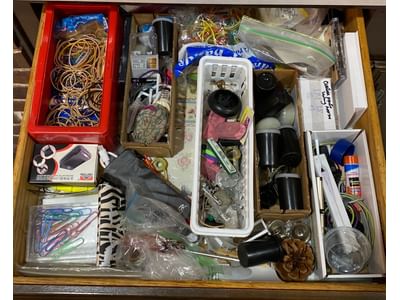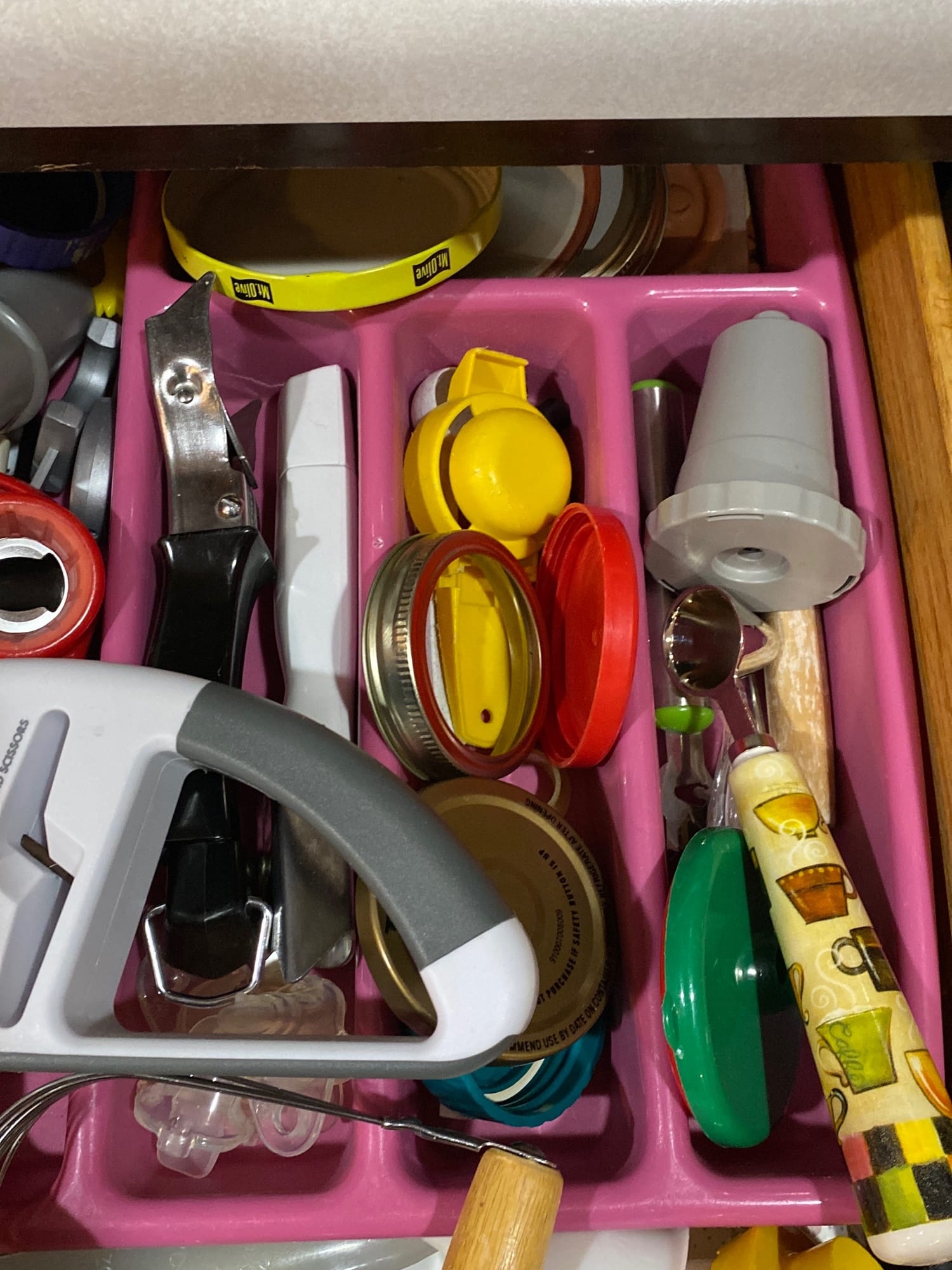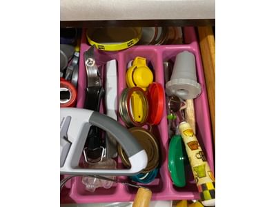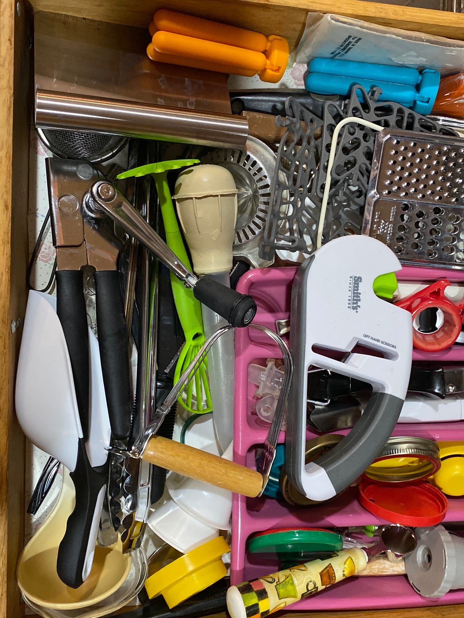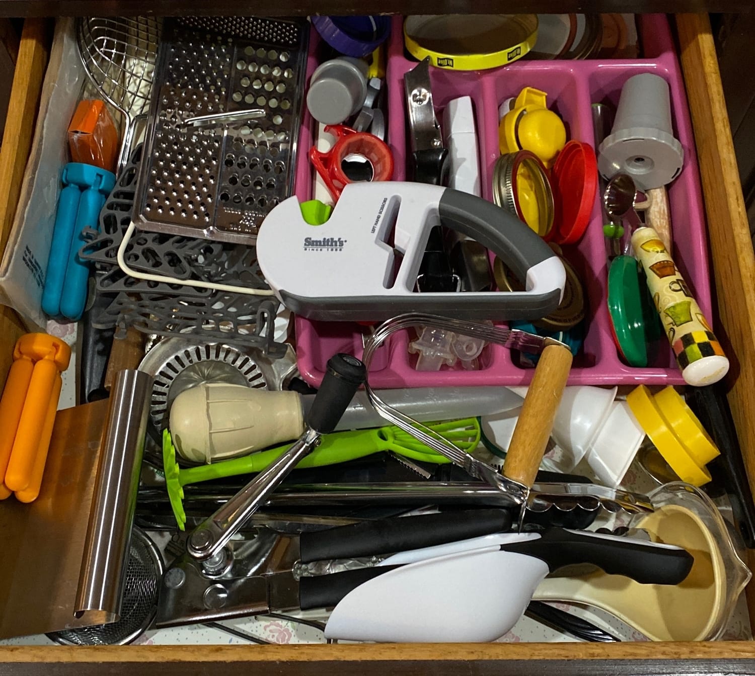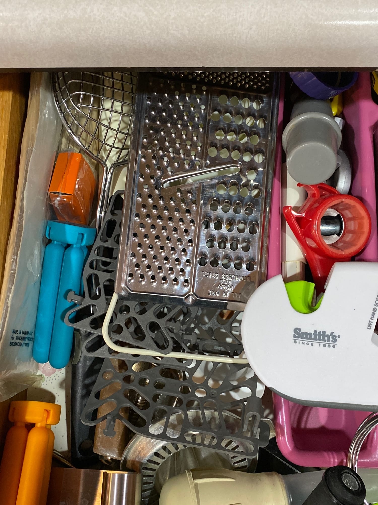 129 Smith's knife sharpener, cheese graters, can opener, Kitchen utensils, contents of drawer as shown in pictures