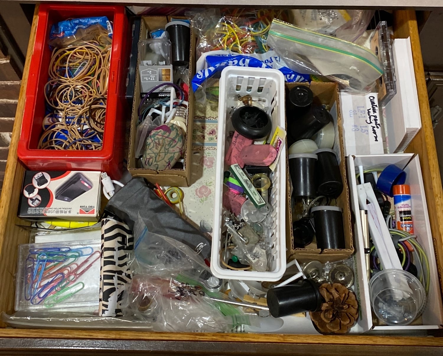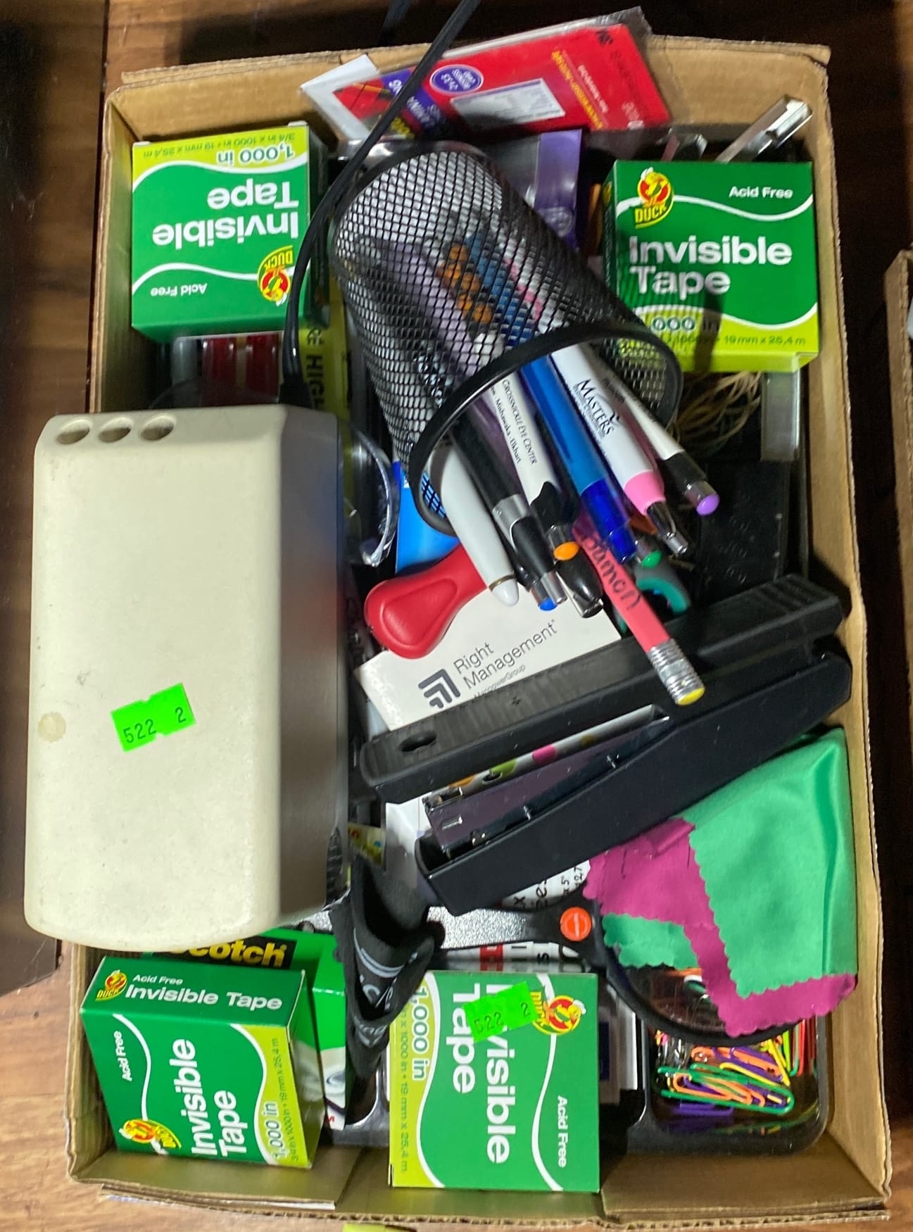 130 Office supplies inc. rubber bands, erasers, paper clips, tape, contents as shown in pictures