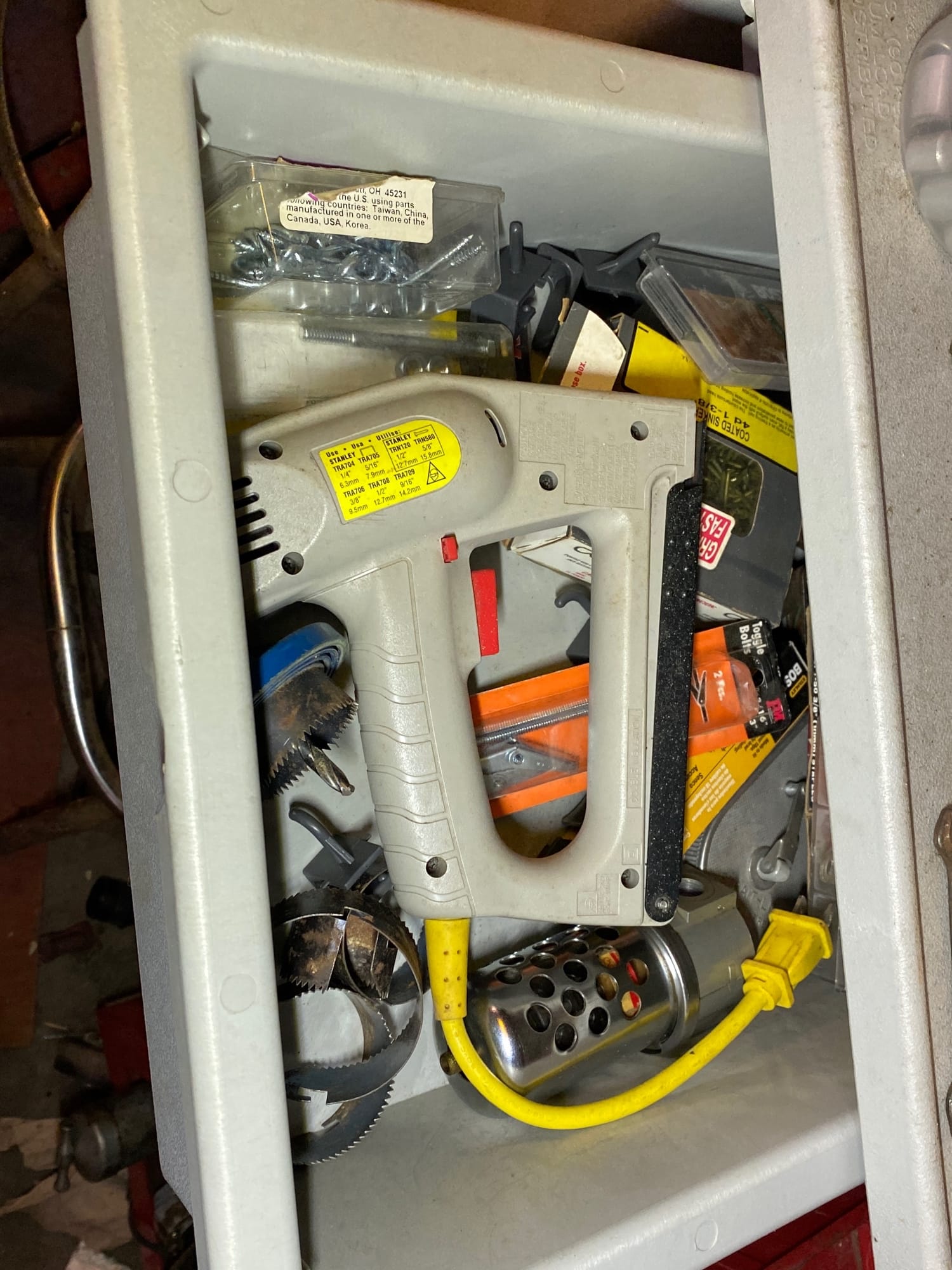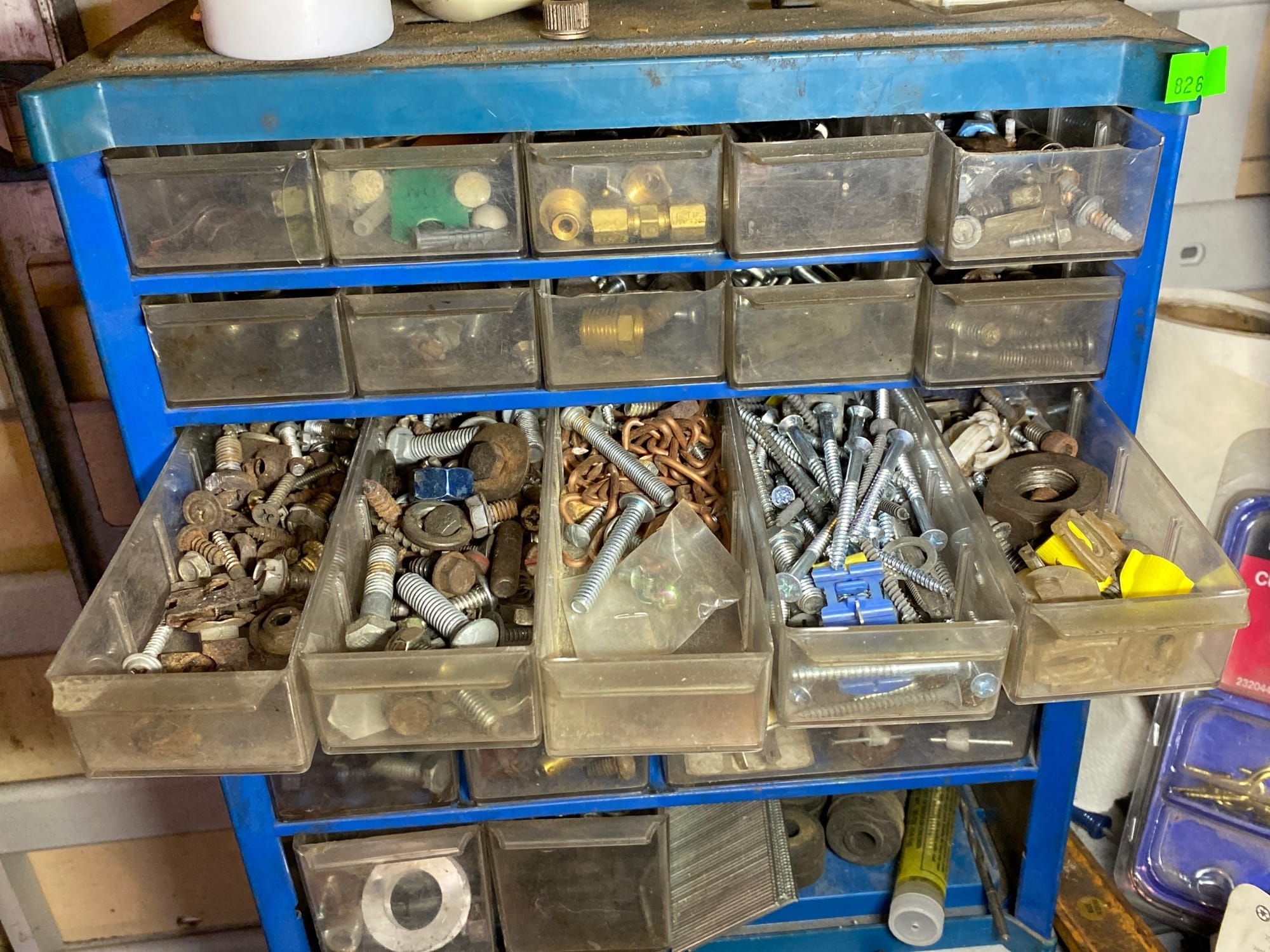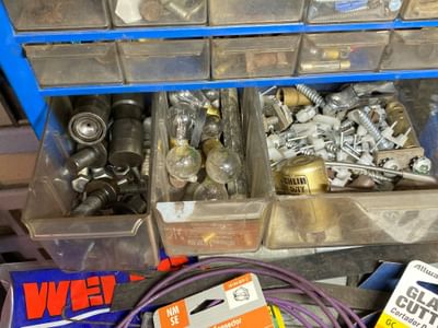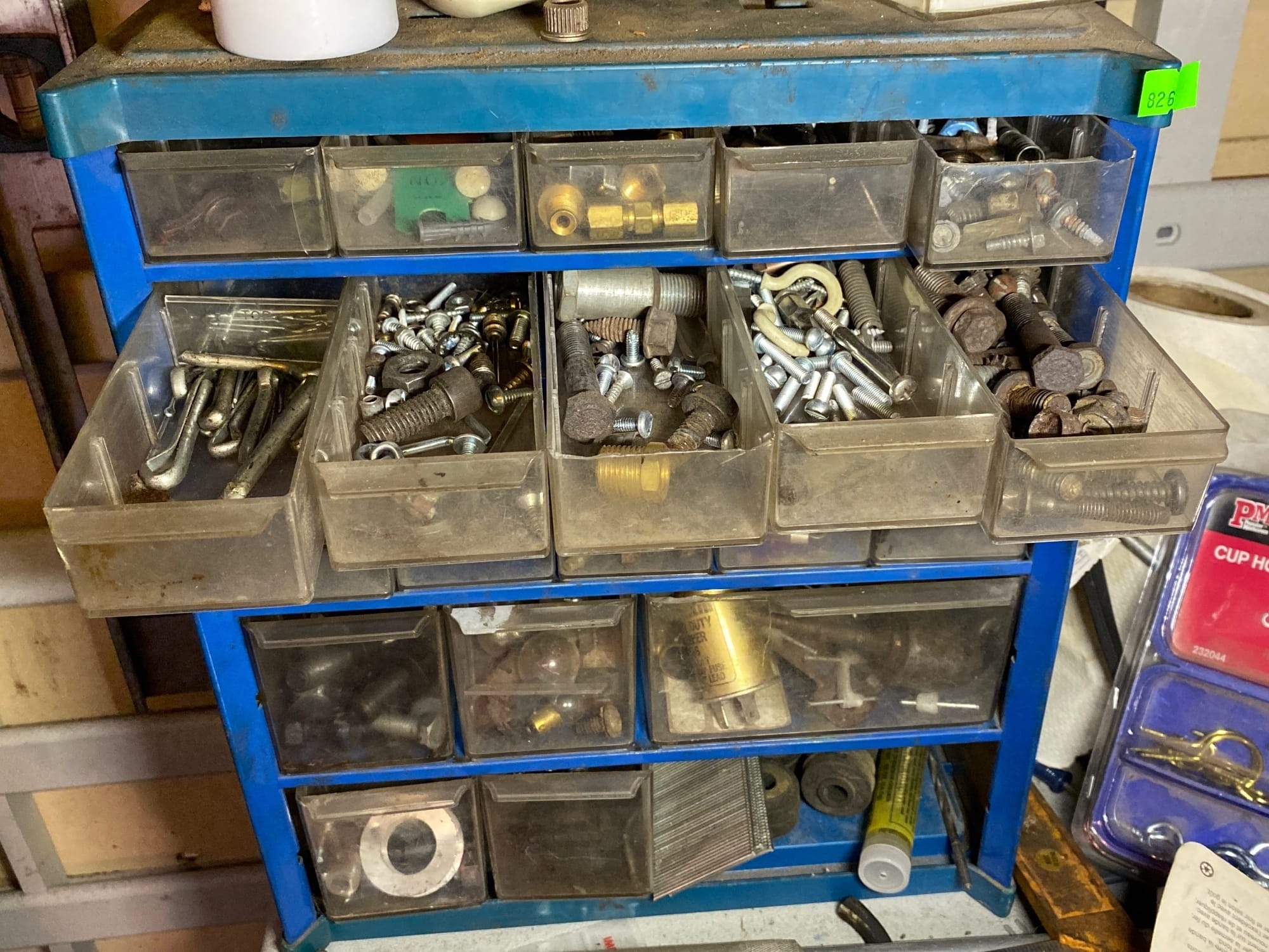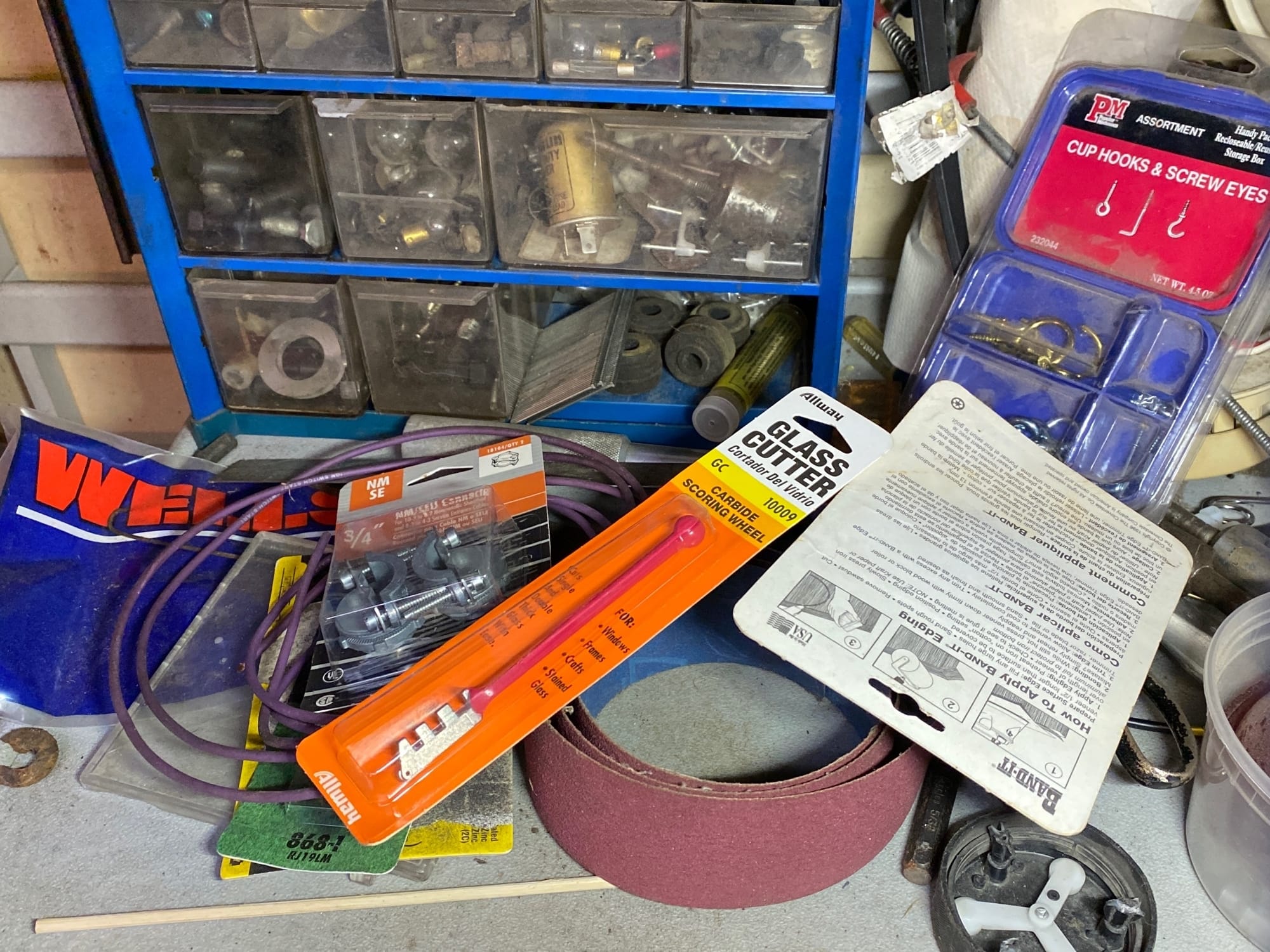 826 Organizer, misc. hardware, sand paper, level, glue, light bulbs, stools, staple gun, contents of workbench as shown in pictures