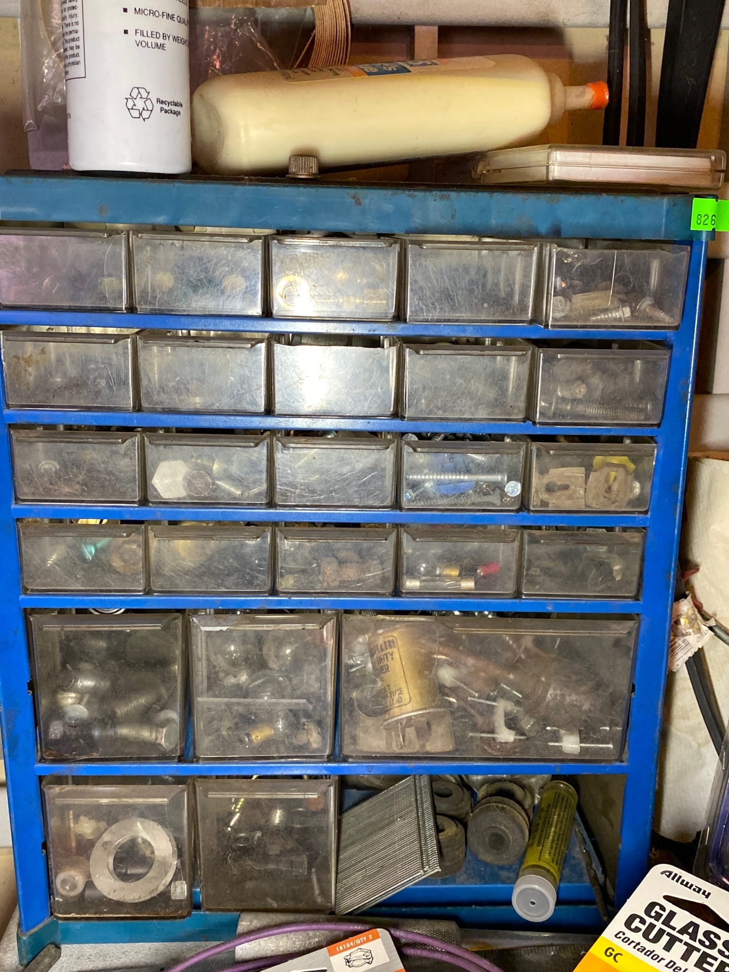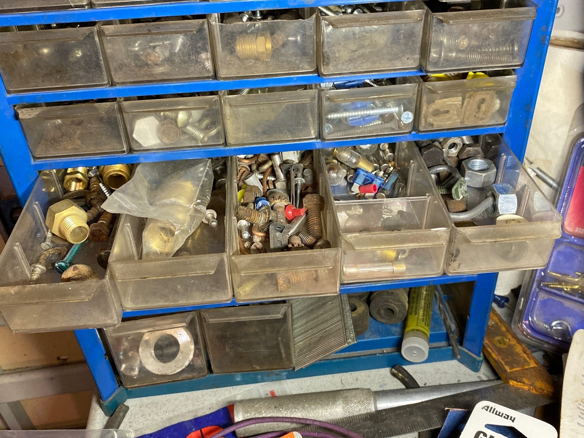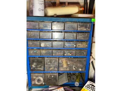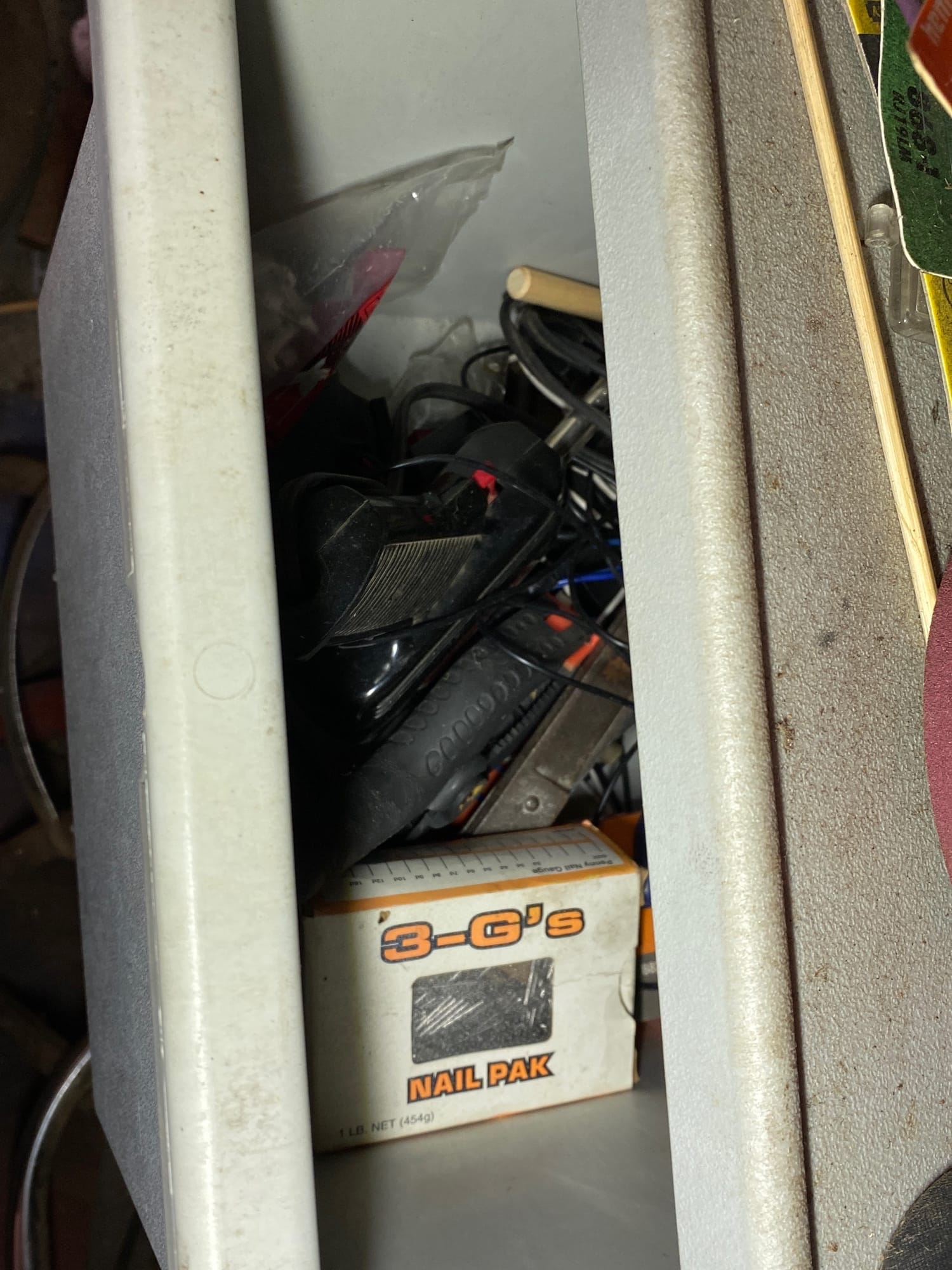 826 Organizer, misc. hardware, sand paper, level, glue, light bulbs, stools, staple gun, contents of workbench as shown in pictures
