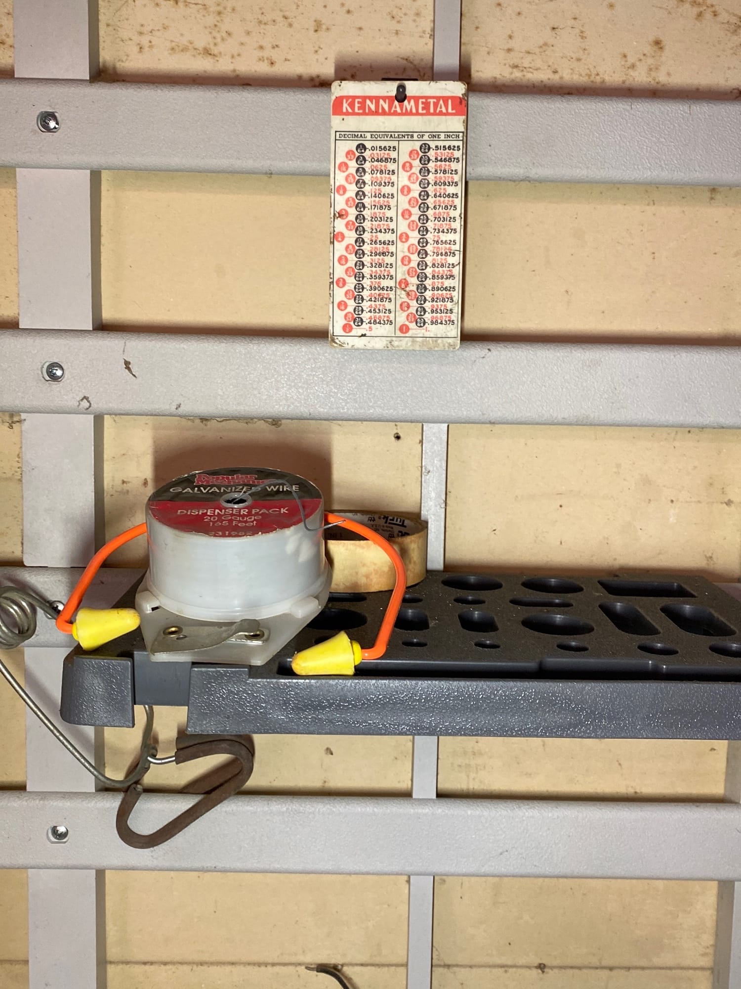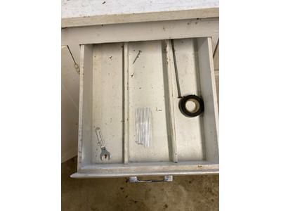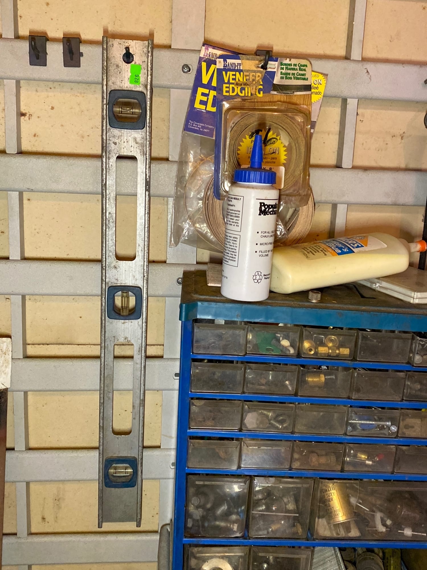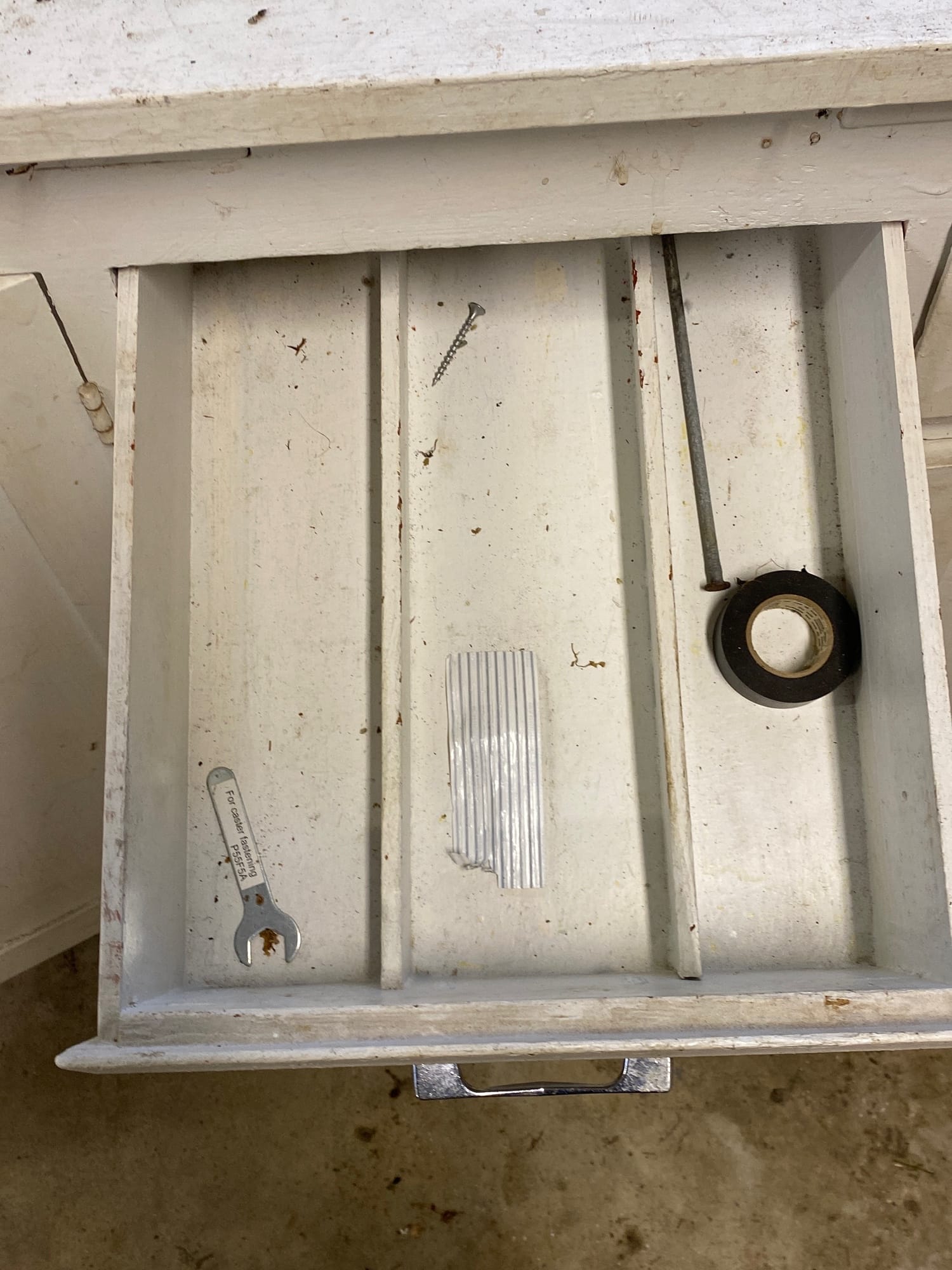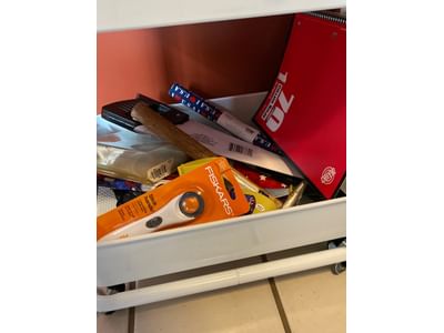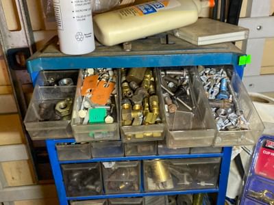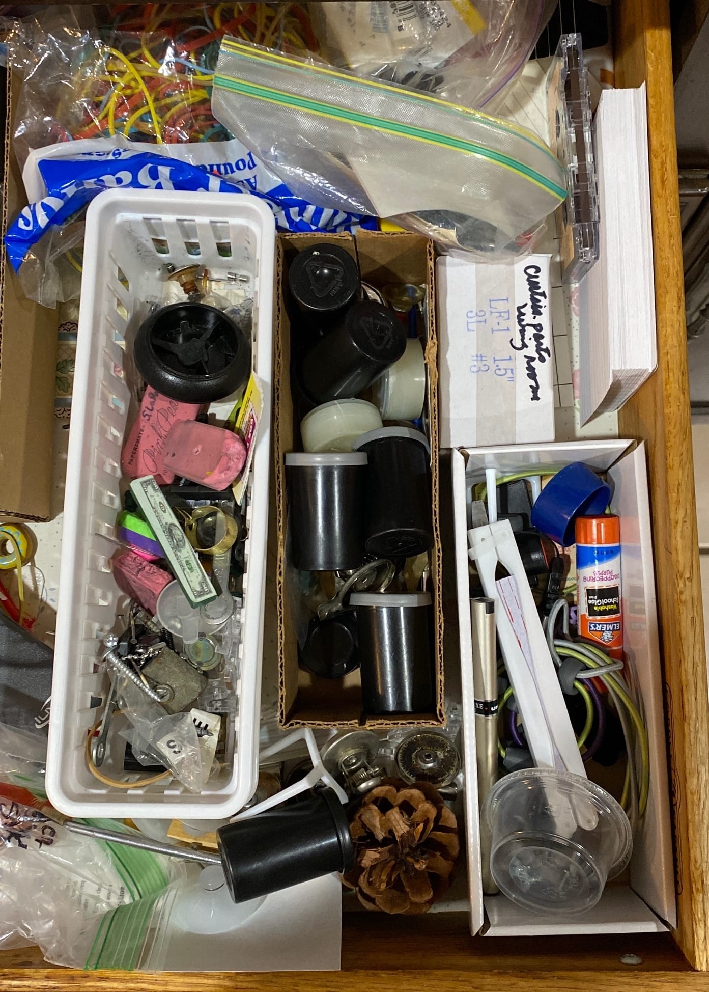 826 Organizer, misc. hardware, sand paper, level, glue, light bulbs, stools, staple gun, contents of workbench as shown in pictures