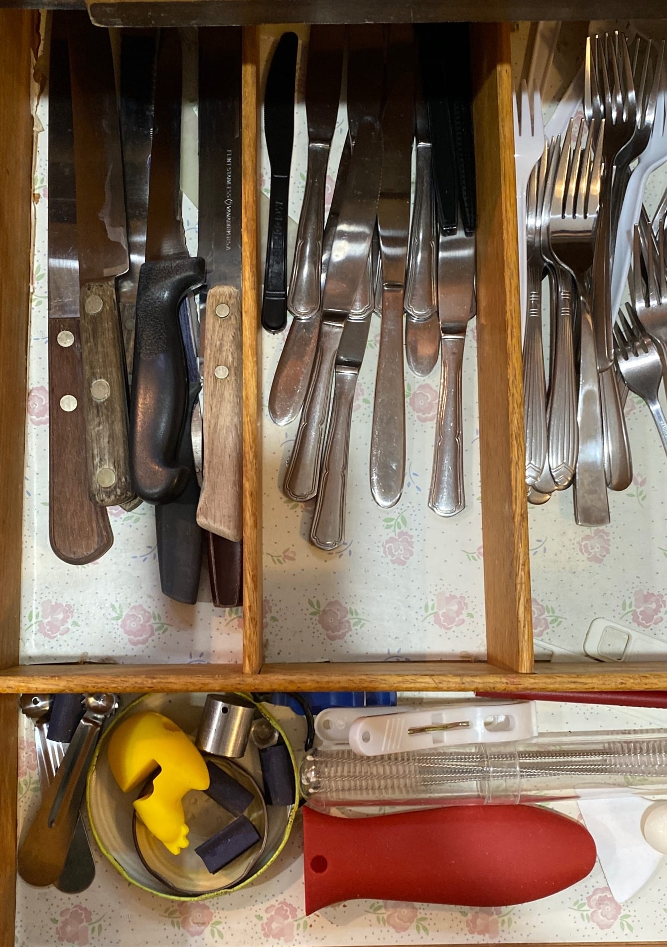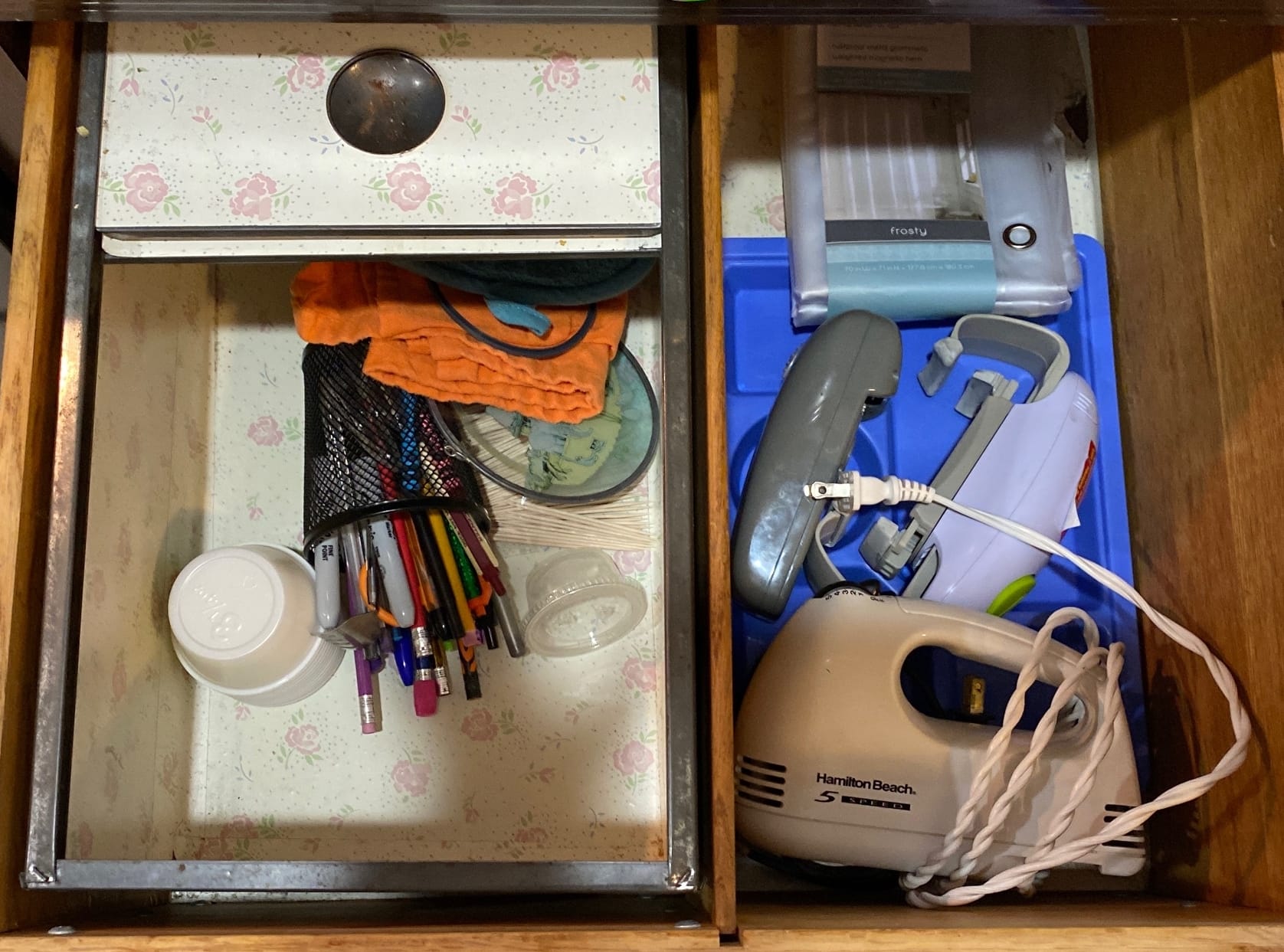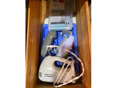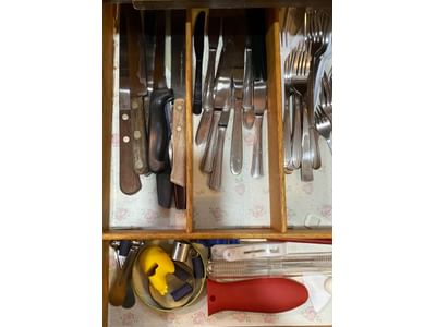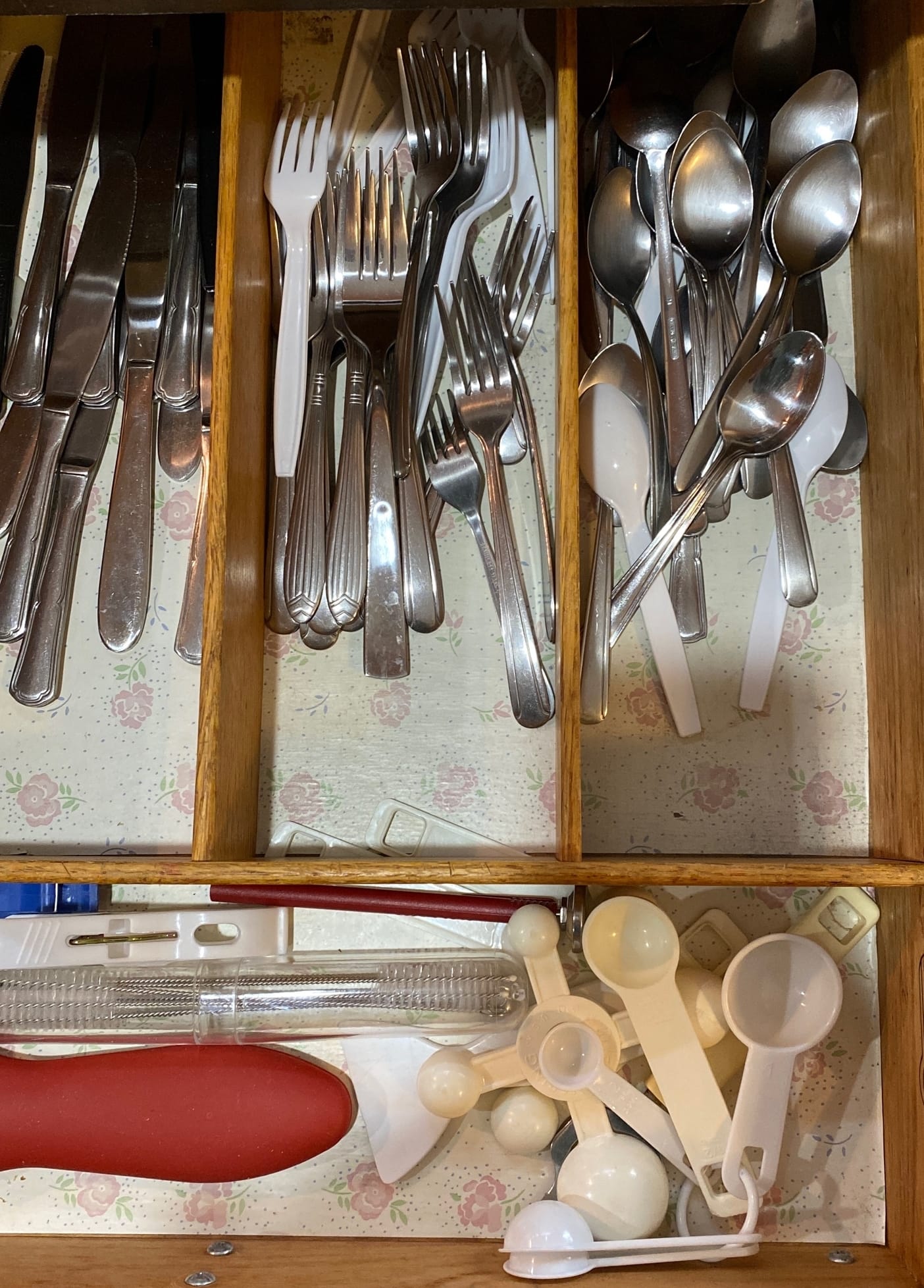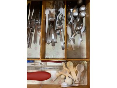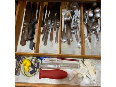 132 Utensils, measuring spoons, brush cleaners, contents of drawer as shown in pictures