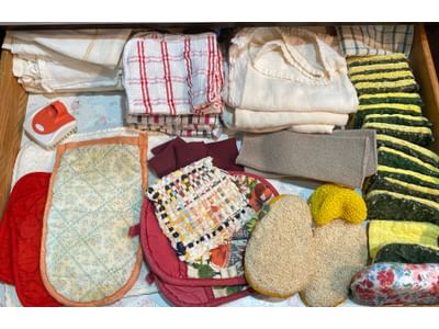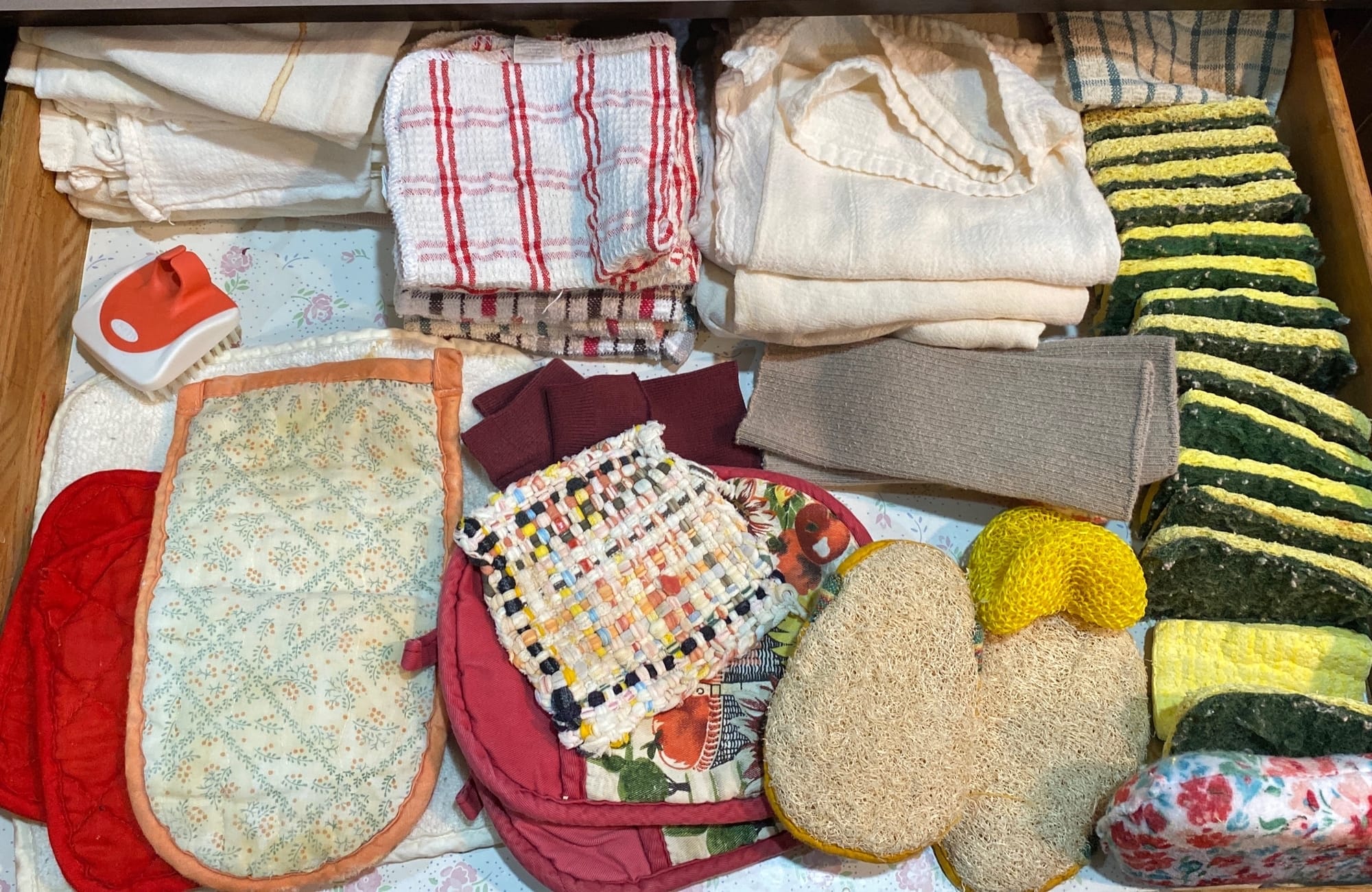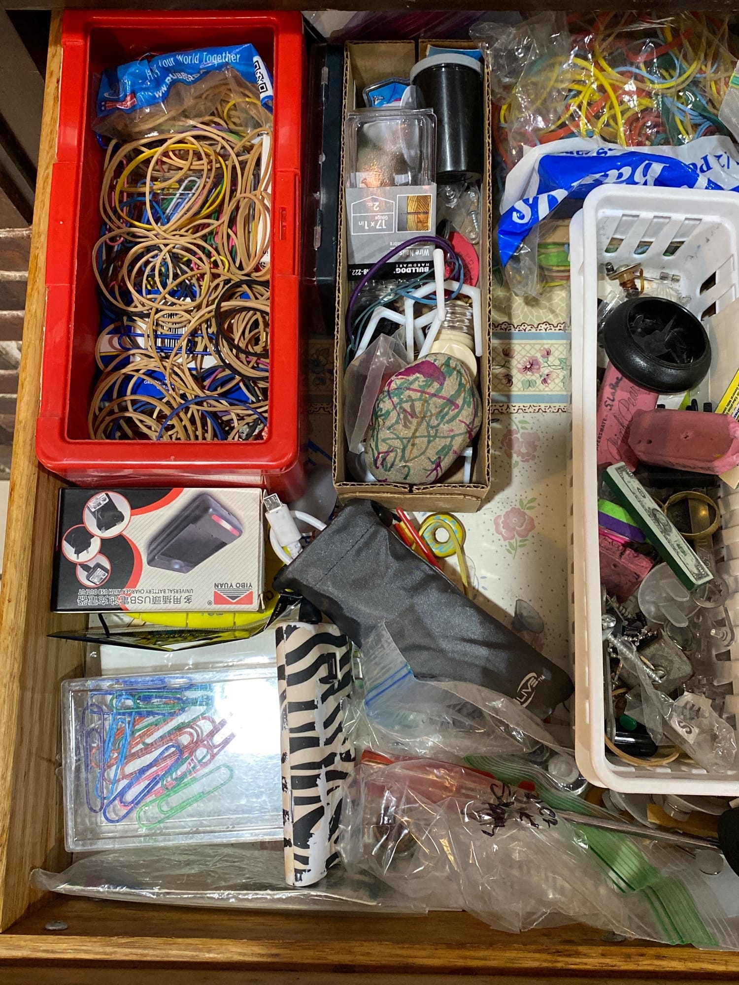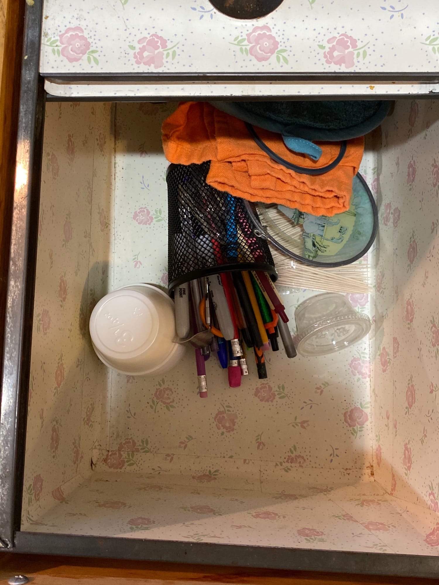 132 Utensils, measuring spoons, brush cleaners, contents of drawer as shown in pictures