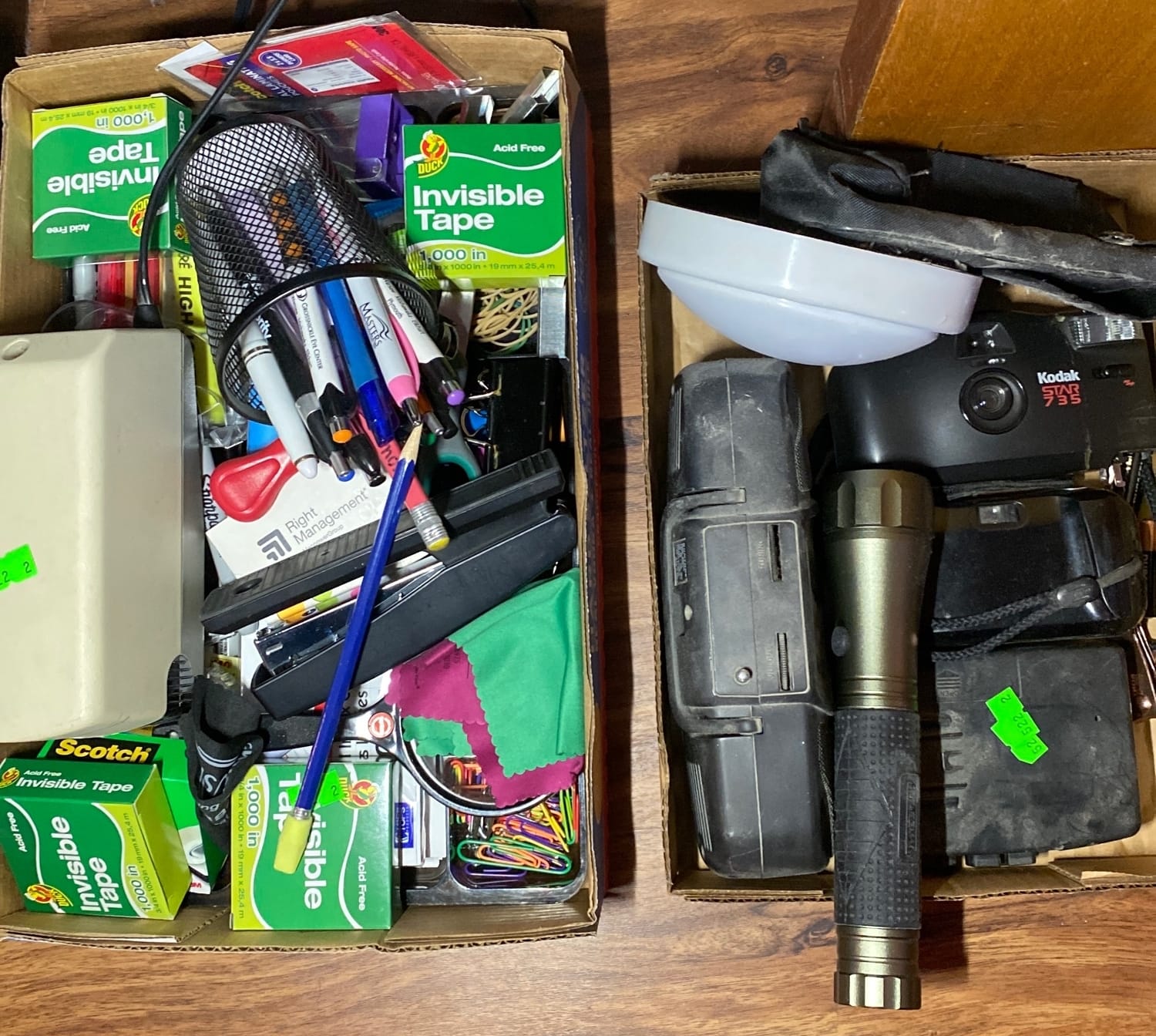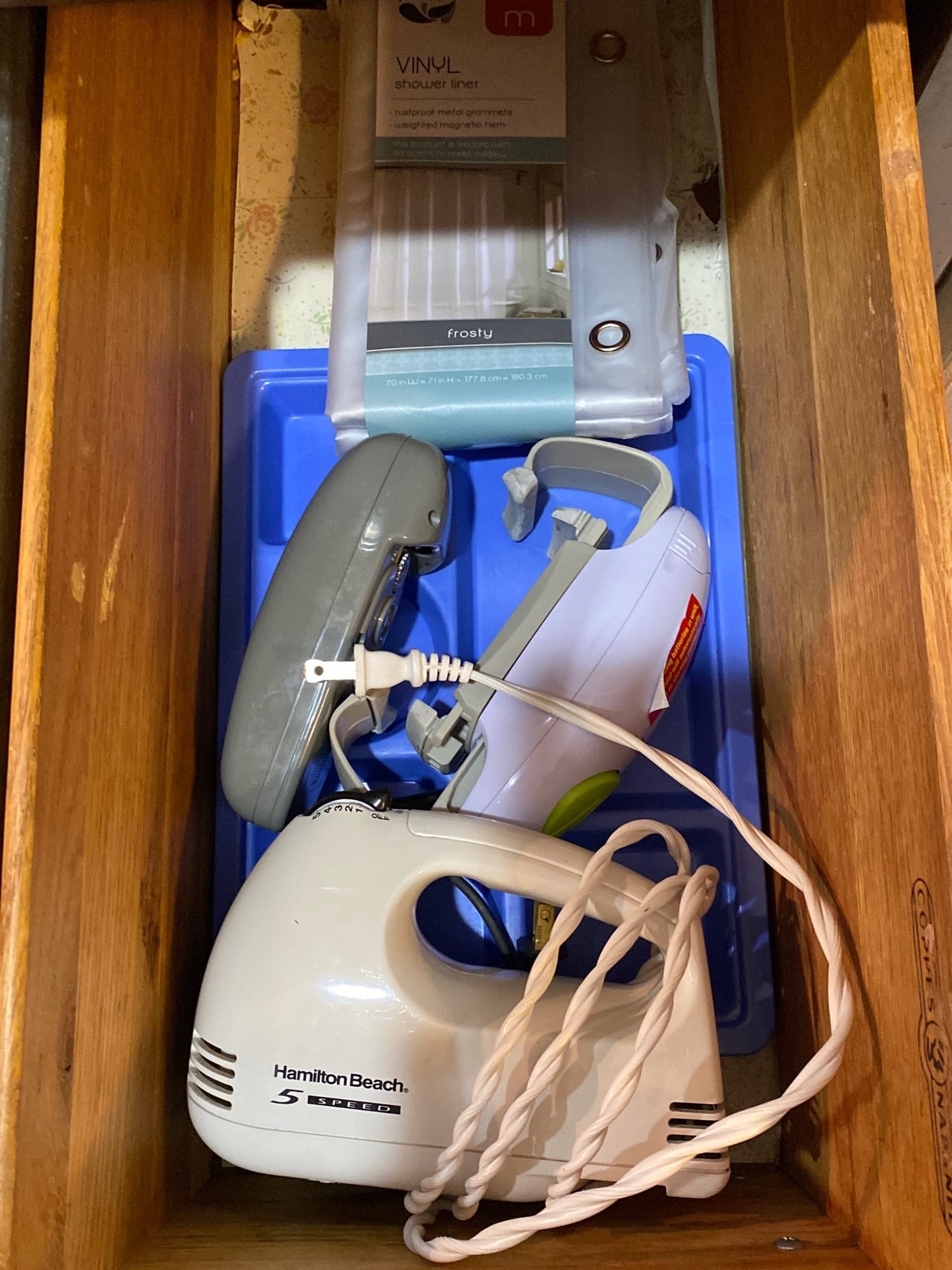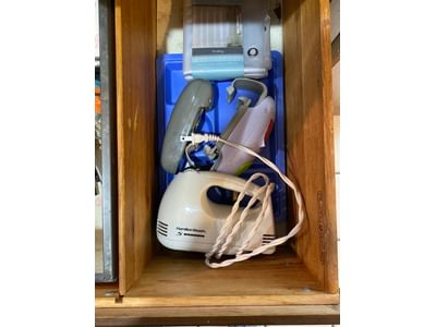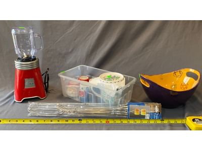 133 Can openers, Hamilton Beach hand mixer, office supplies, vinyl shower liner, divided plate, contents as shown in pictures