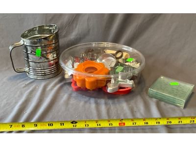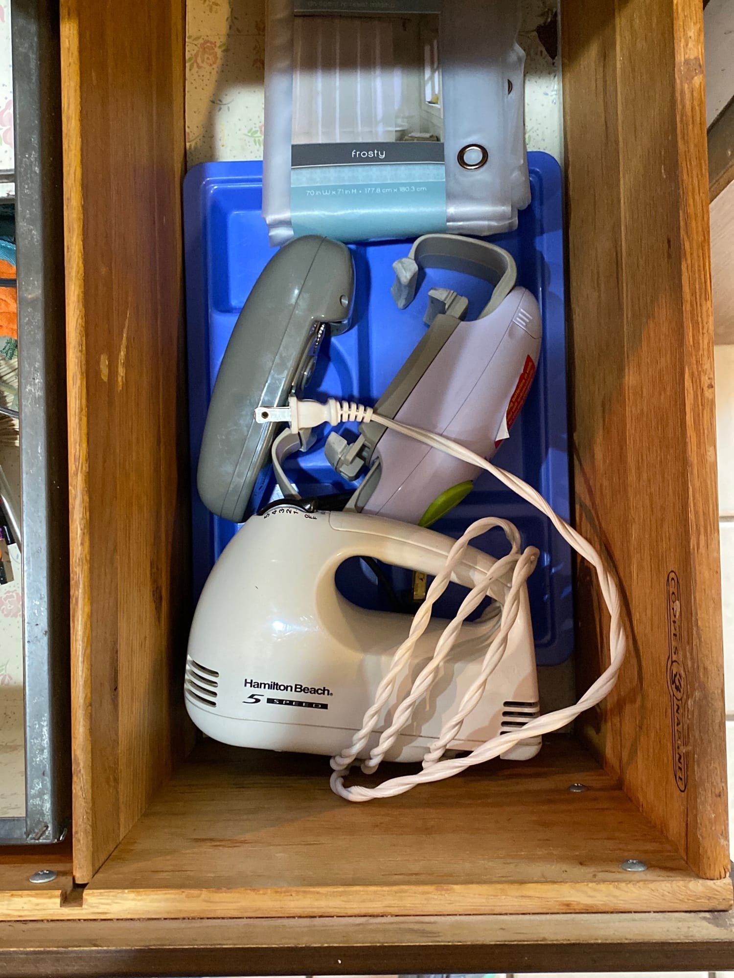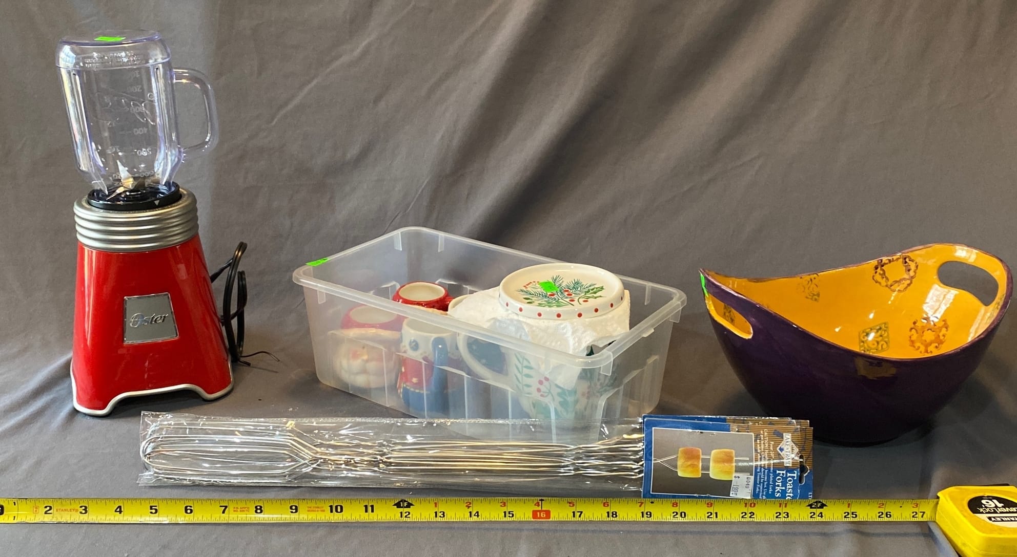 139 Oster mixer, toaster forks, holiday misc, pottery bowl