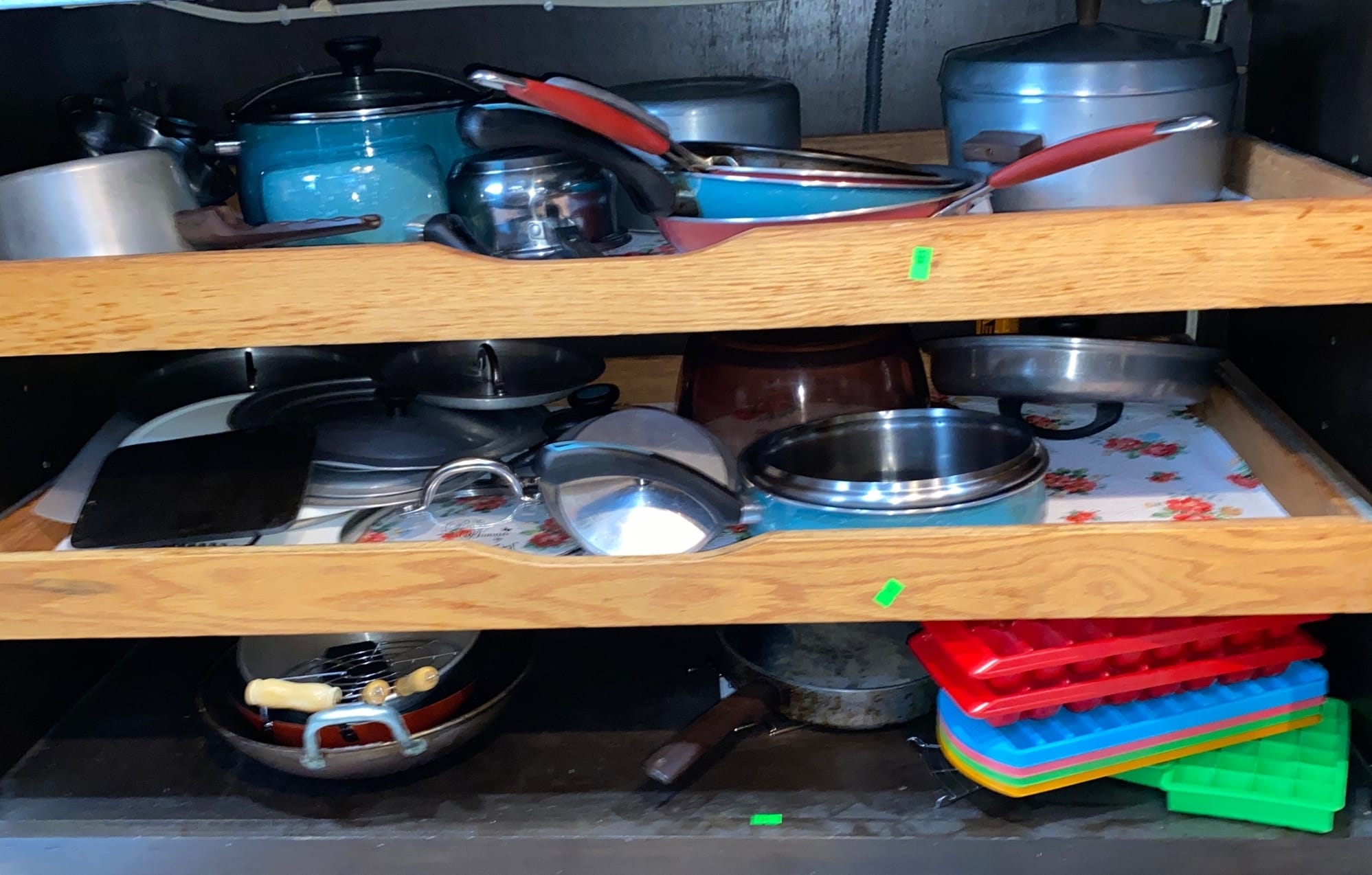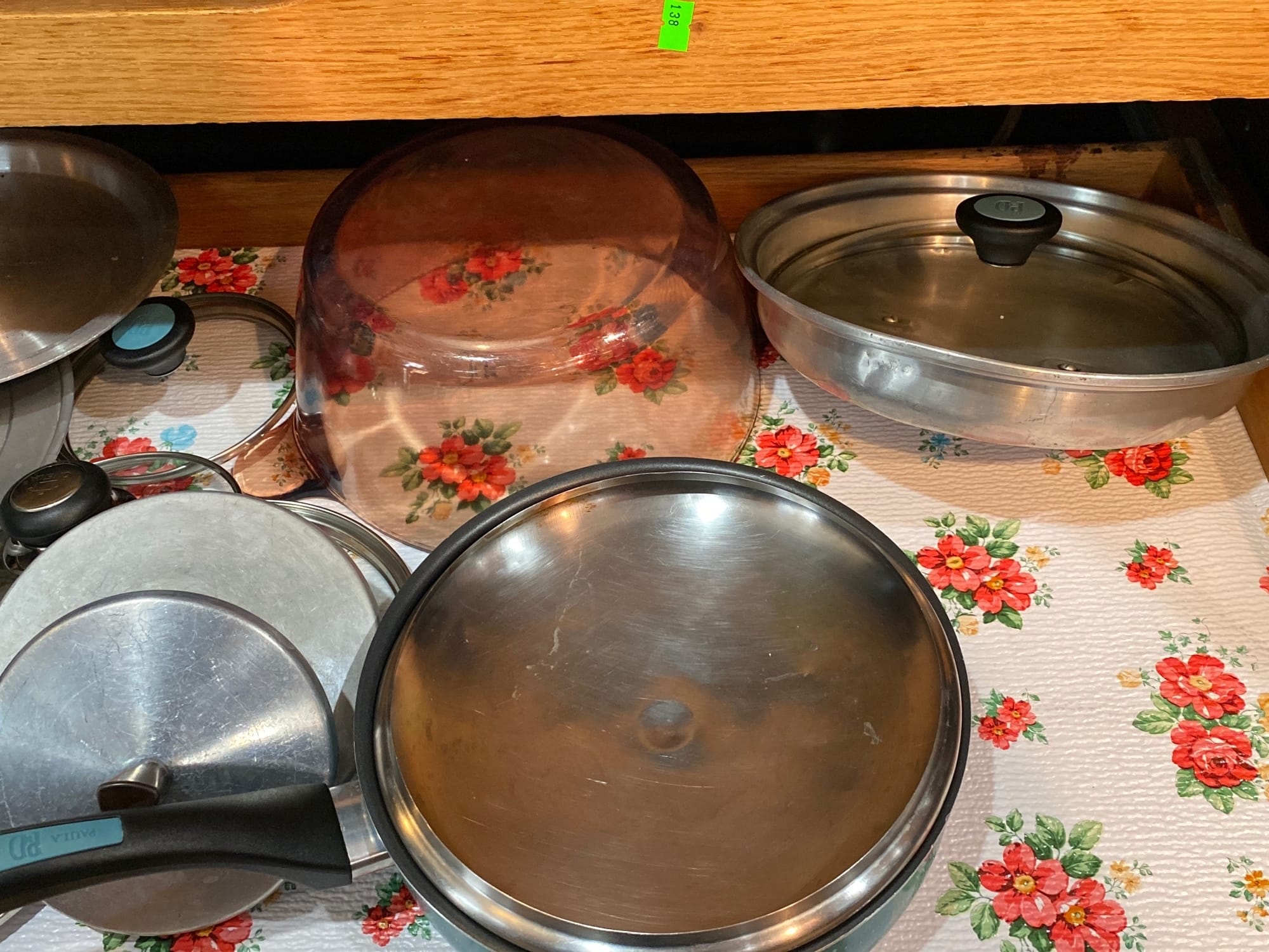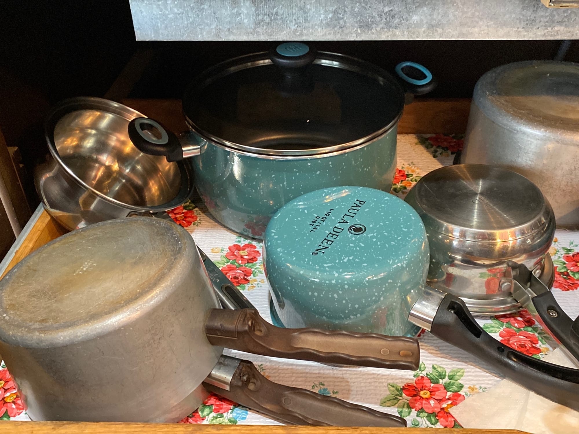 138 Paula Dean & Rachel Ray skillets, ice cube trays, pots, lids, contents as shown in pictures