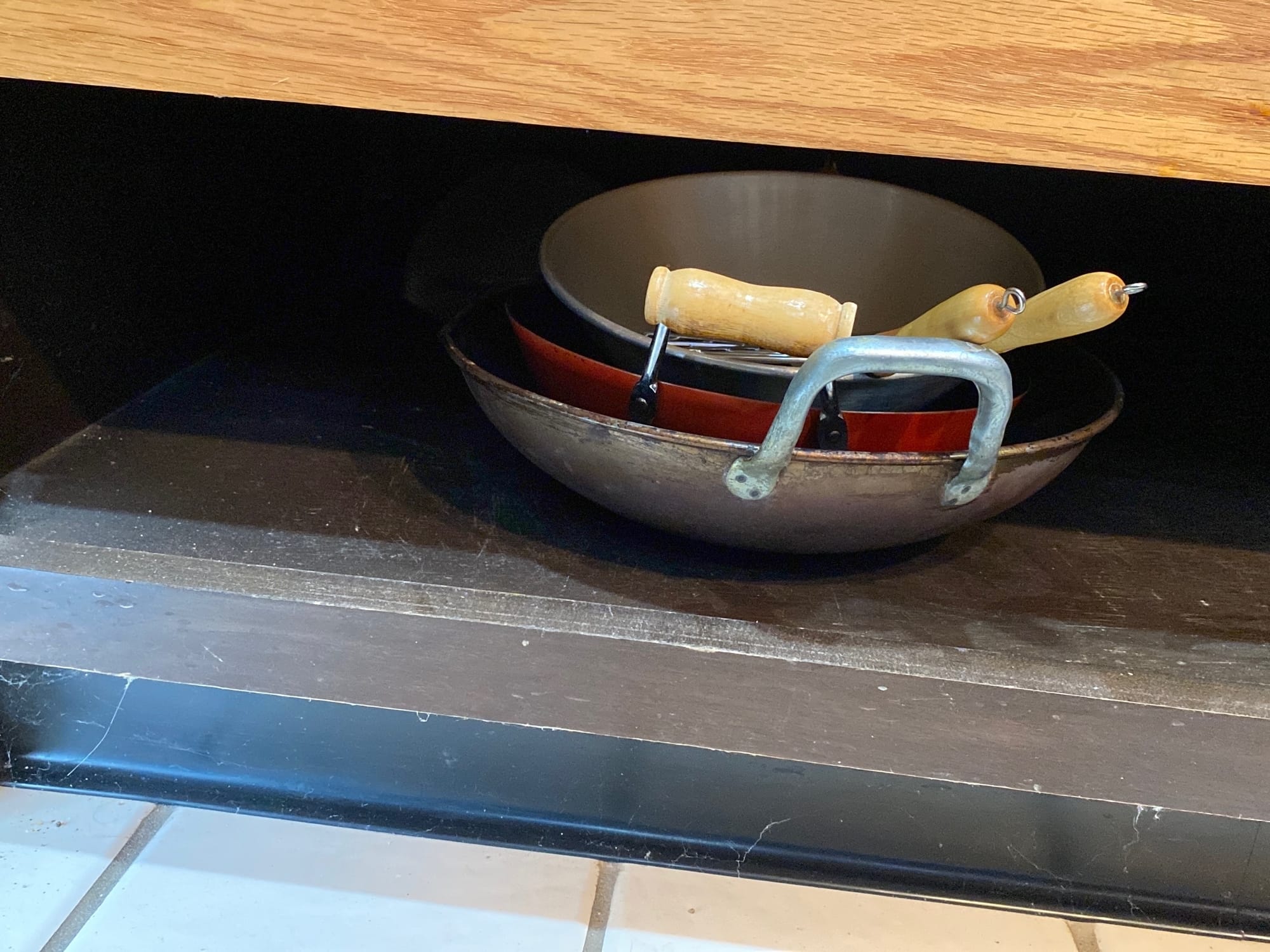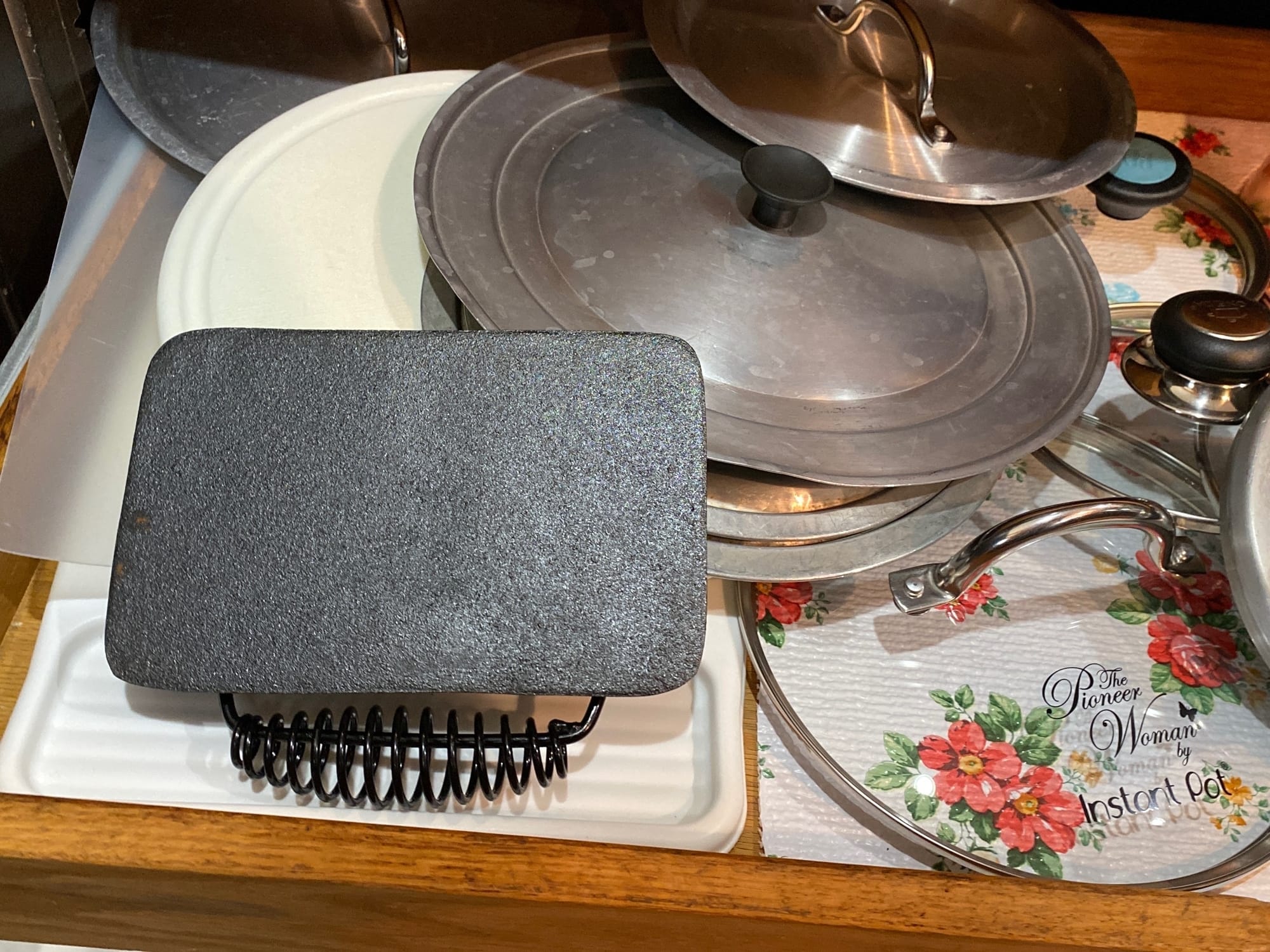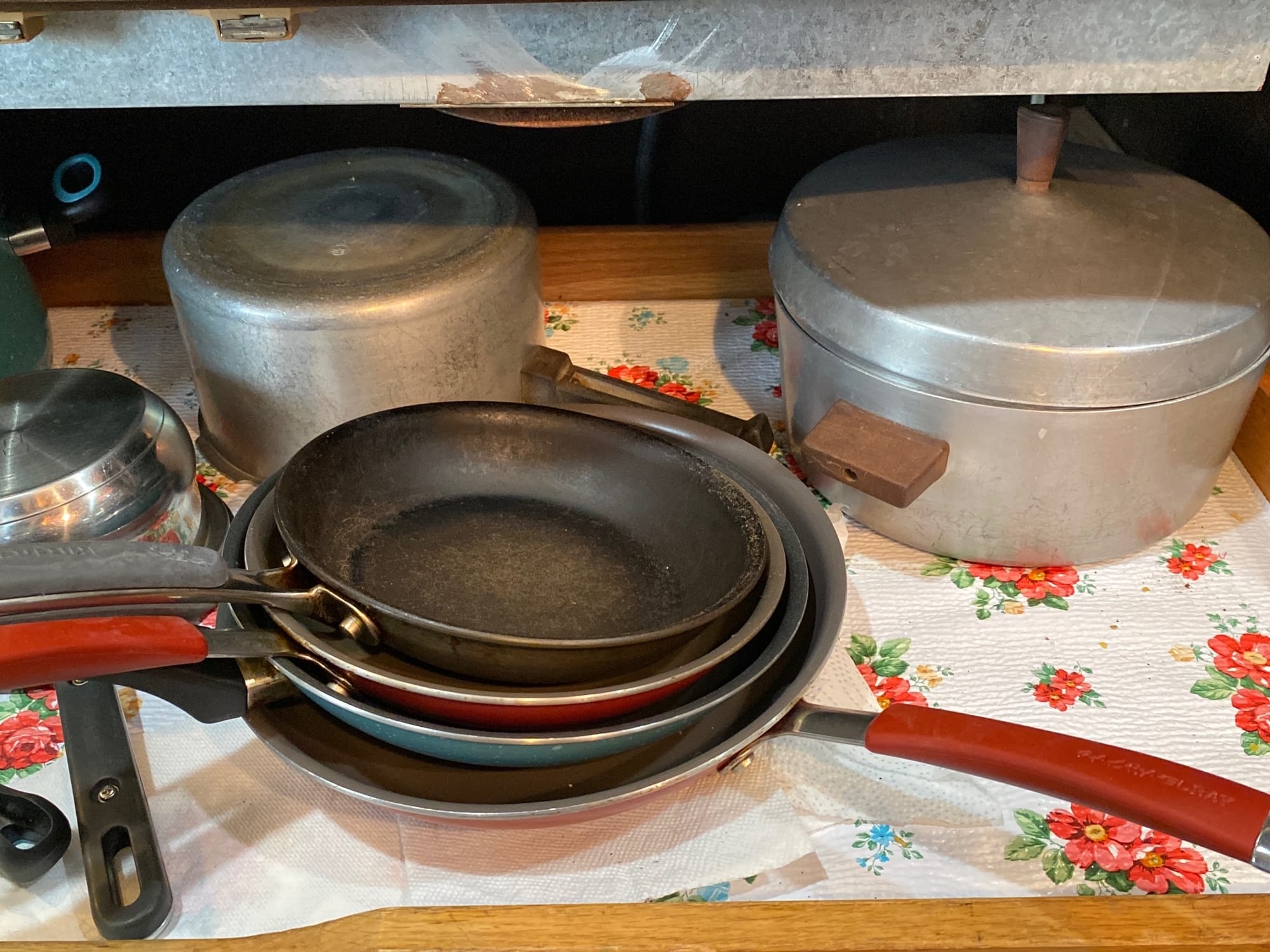 138 Paula Dean & Rachel Ray skillets, ice cube trays, pots, lids, contents as shown in pictures