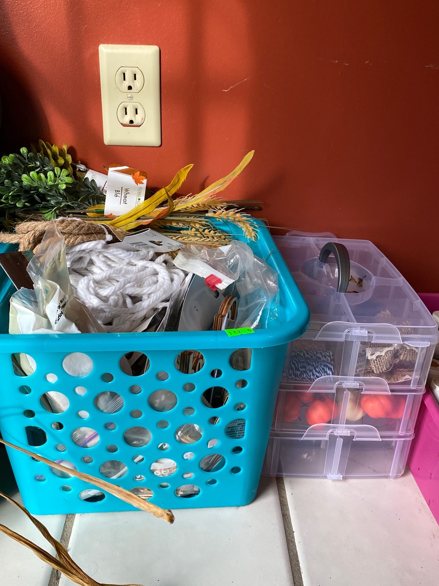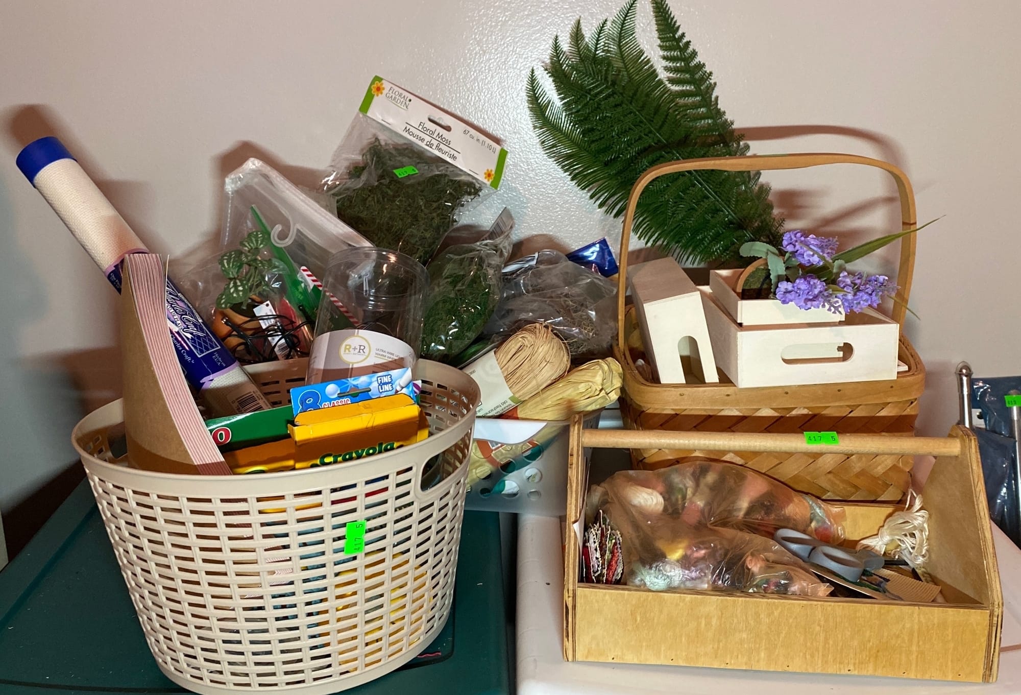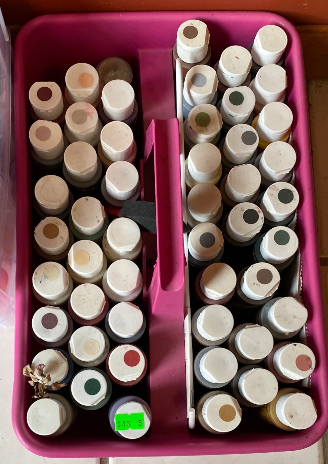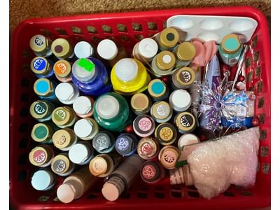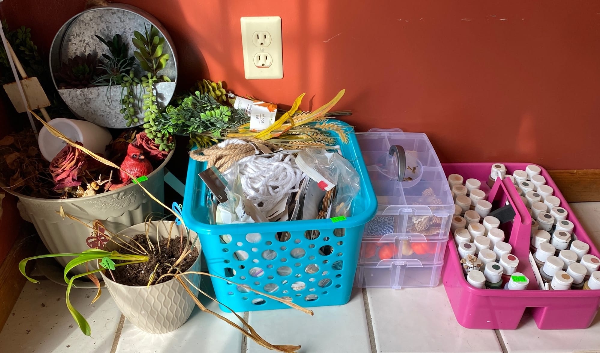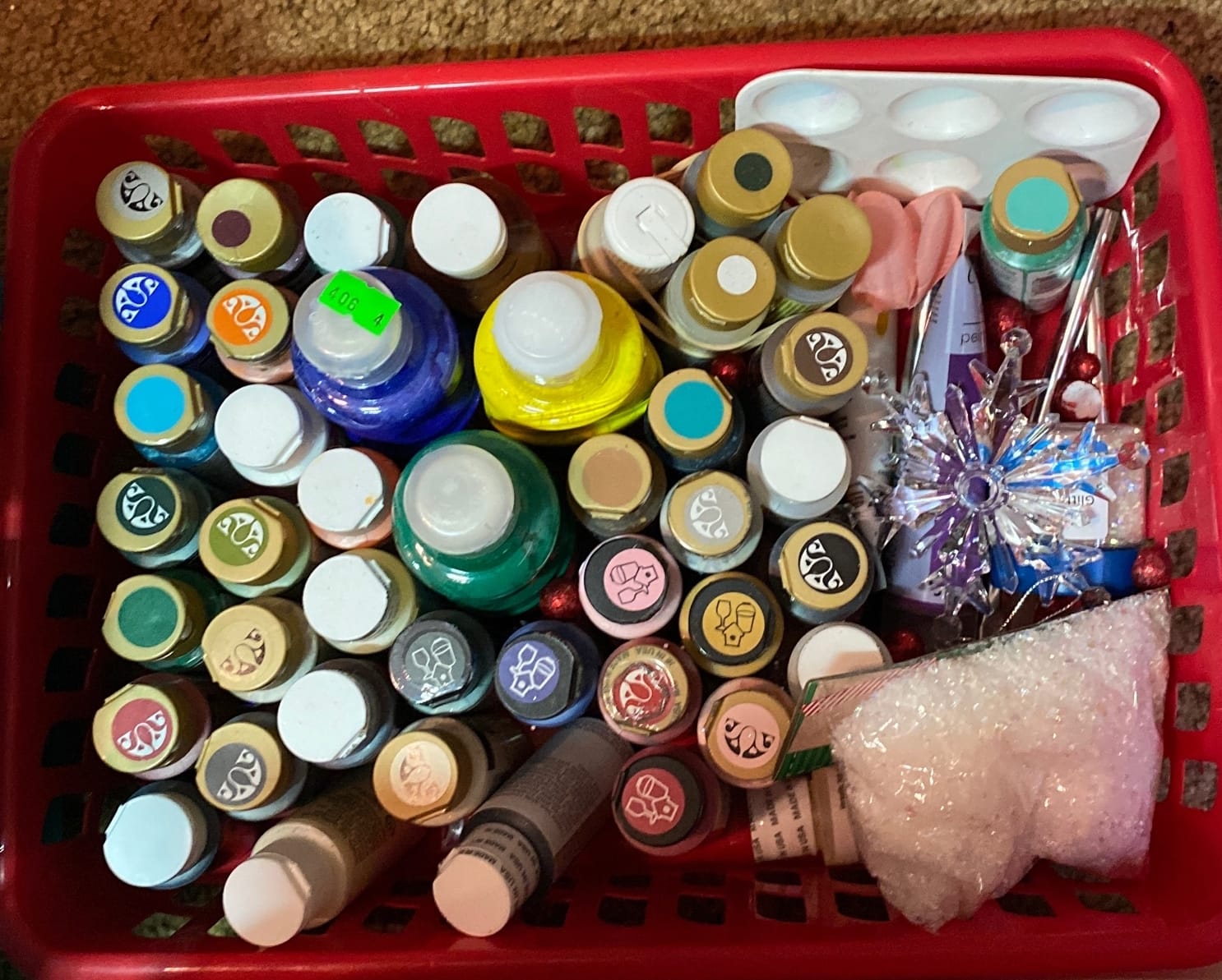 143 Craft supplies, acrylic paints, plants, plant decor, baskets, plastic organizers, misc.