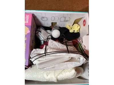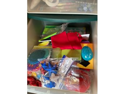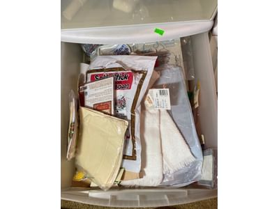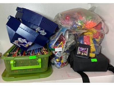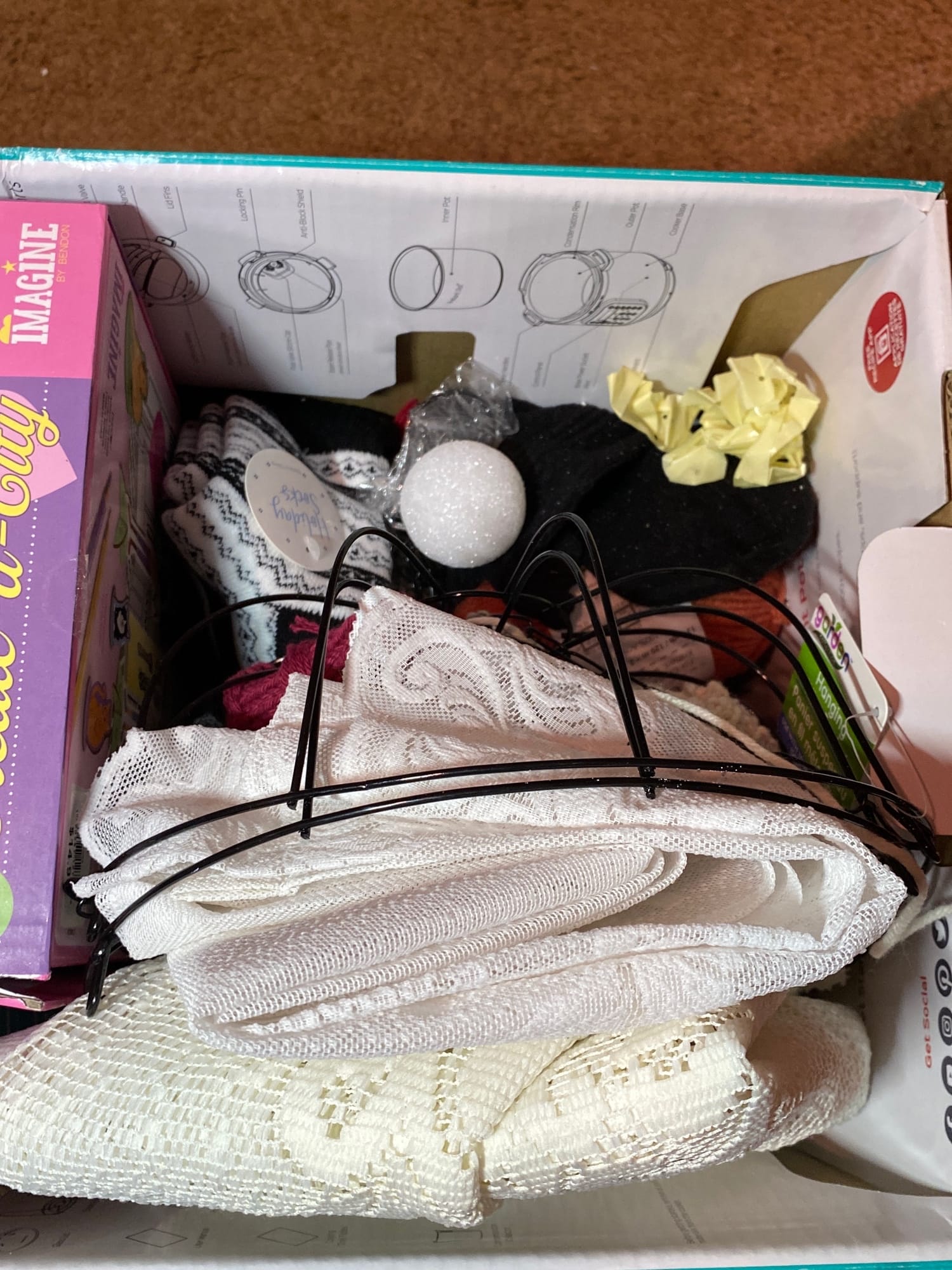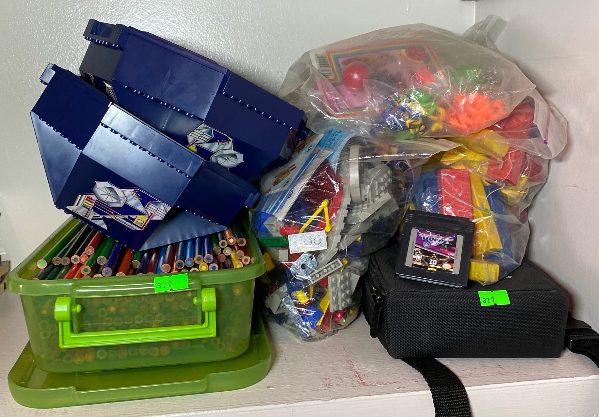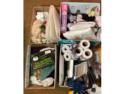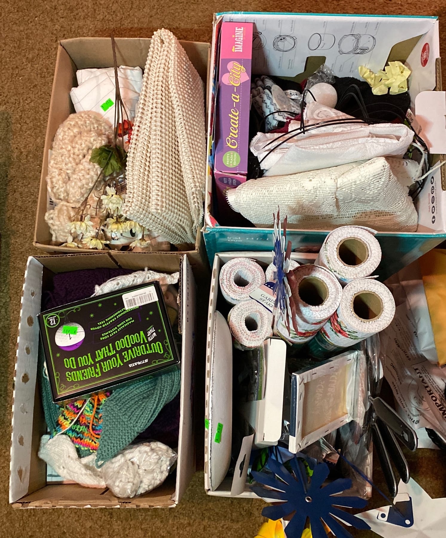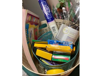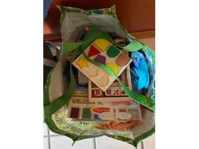 144 Craft supplies, tote bag with games and child clothing, handsaw, office supplies