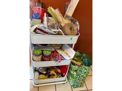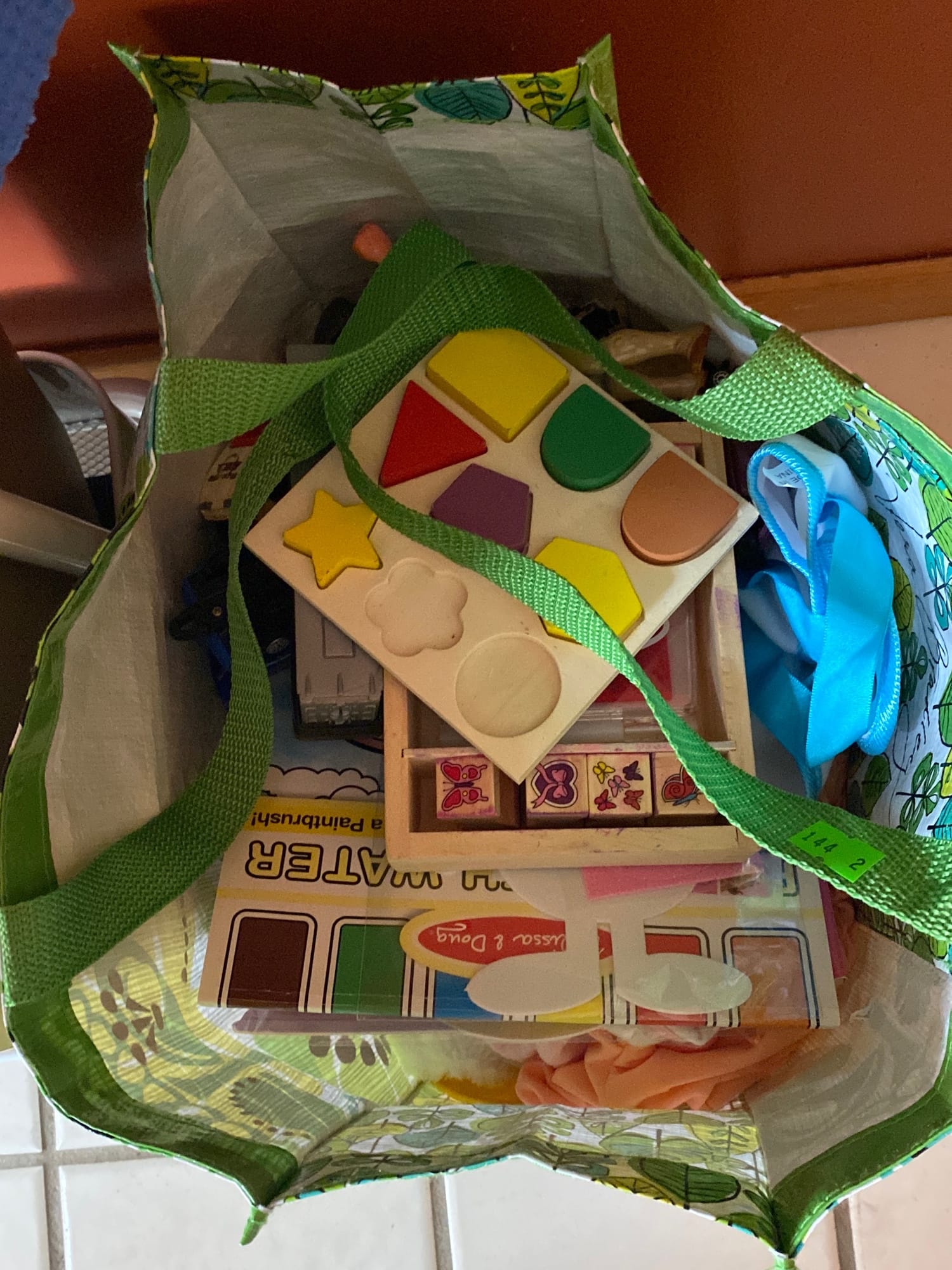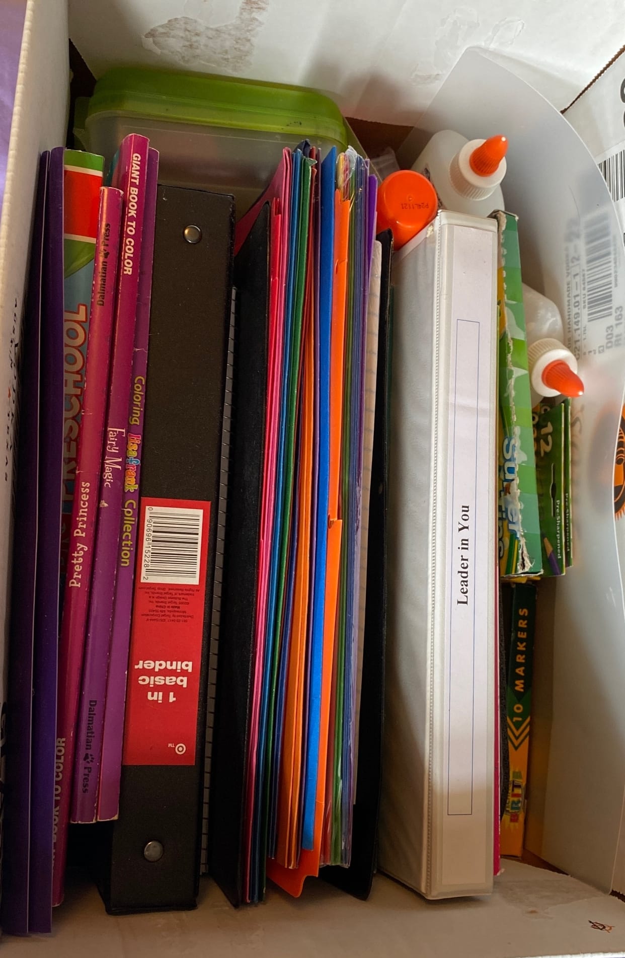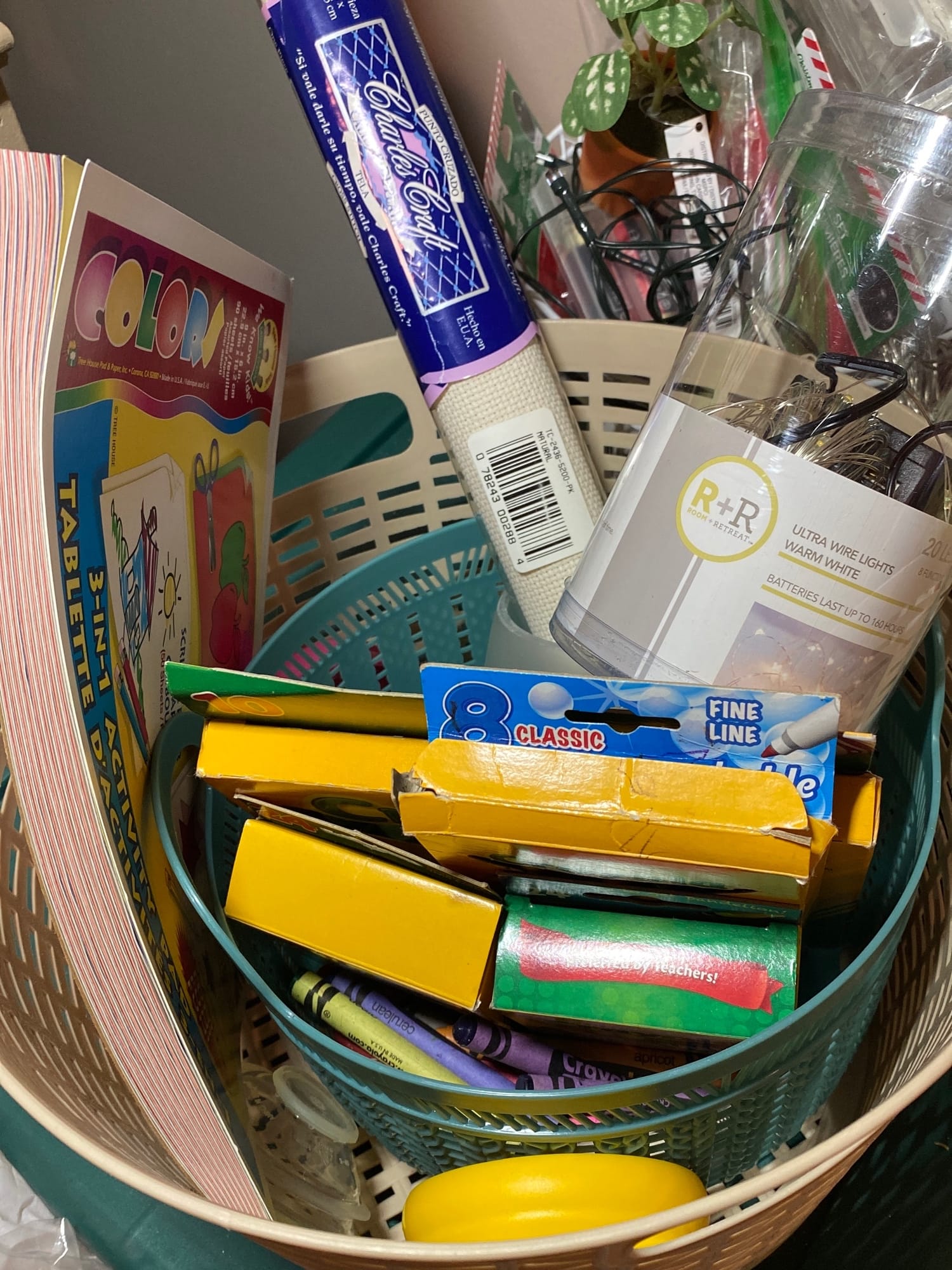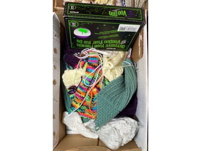 144 Craft supplies, tote bag with games and child clothing, handsaw, office supplies