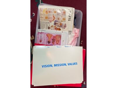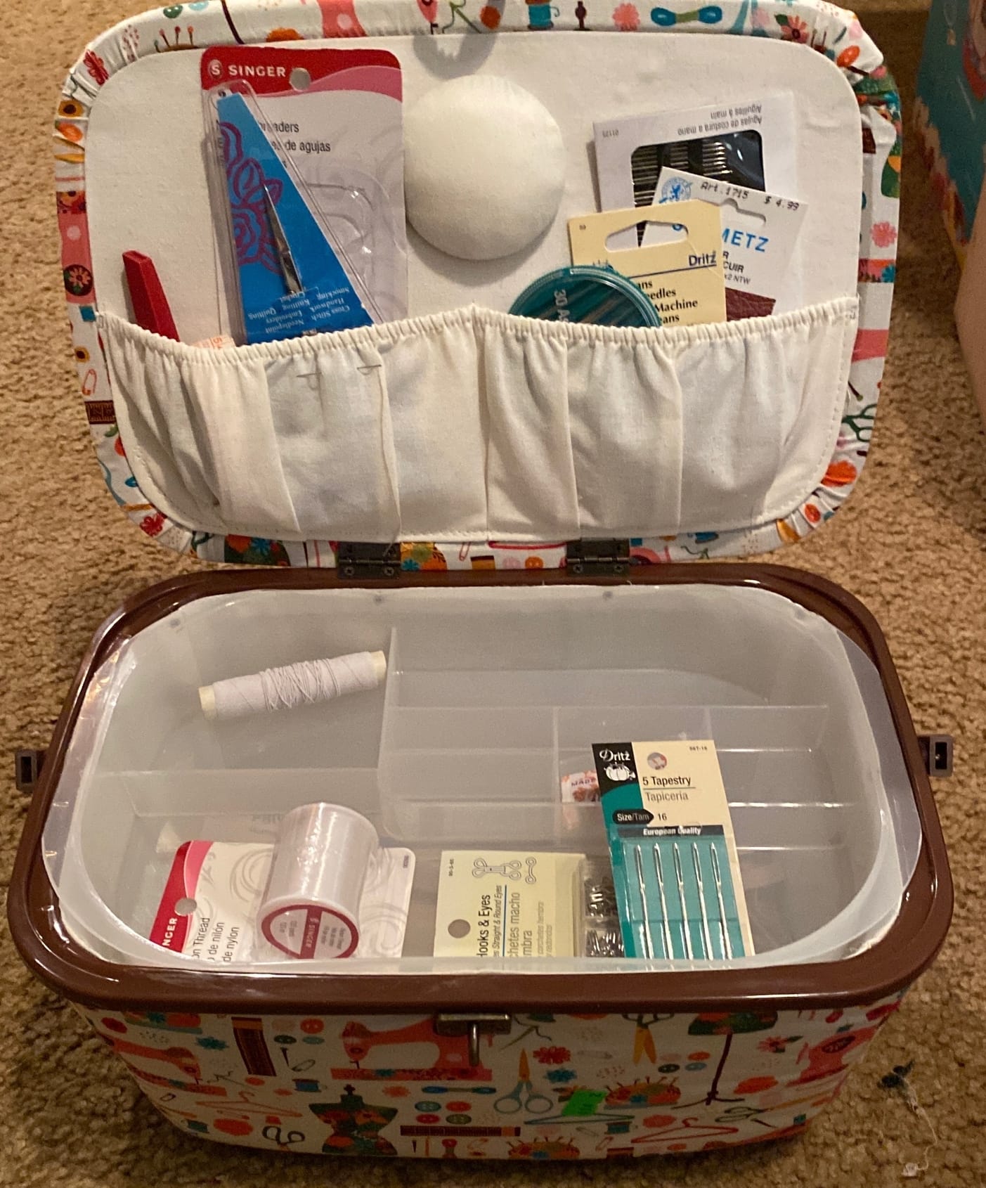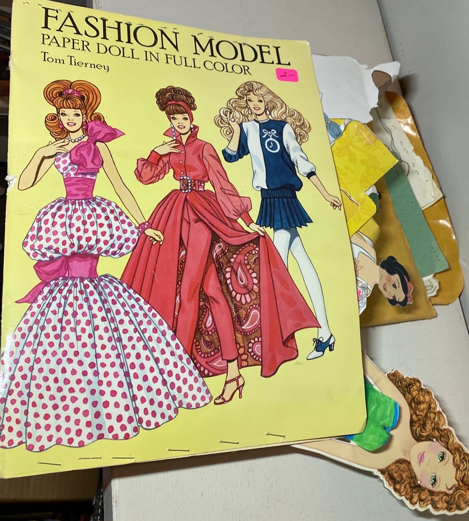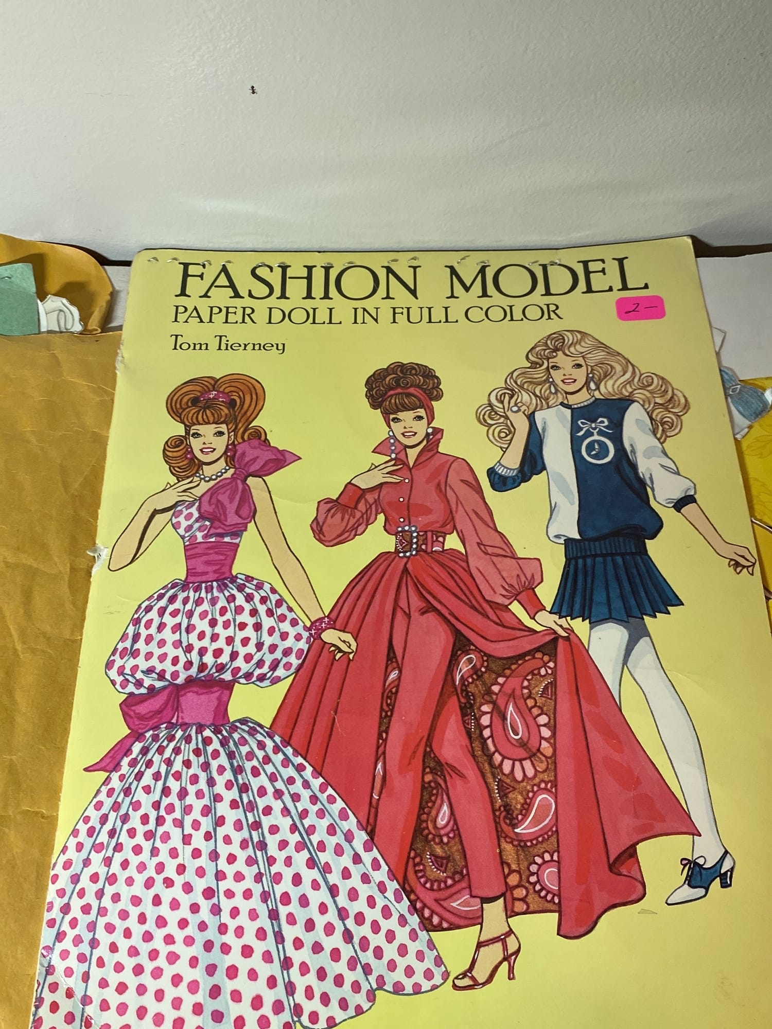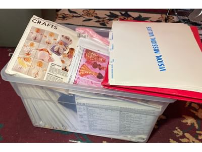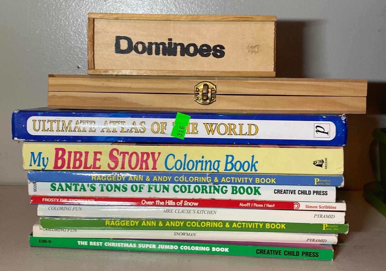 144 Craft supplies, tote bag with games and child clothing, handsaw, office supplies