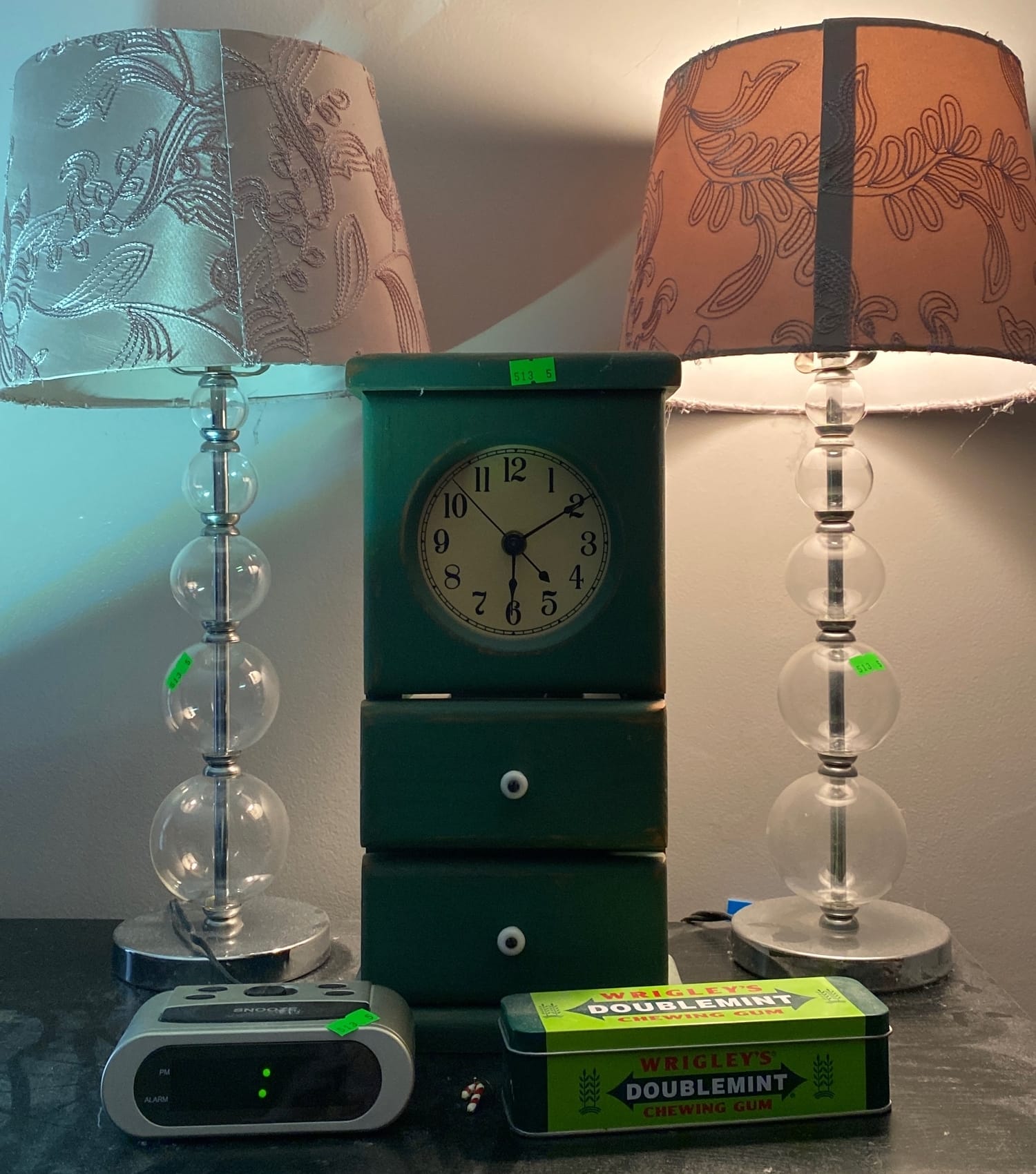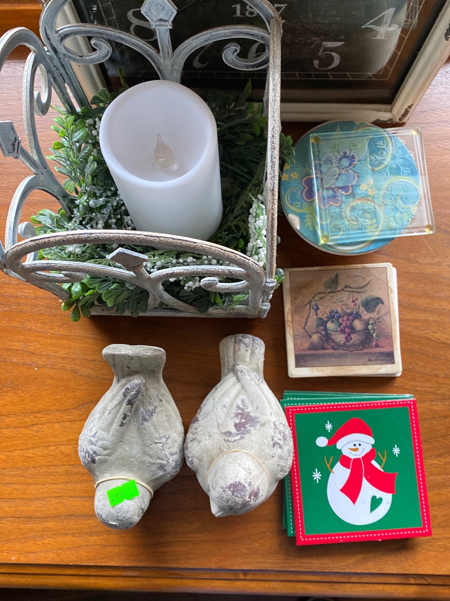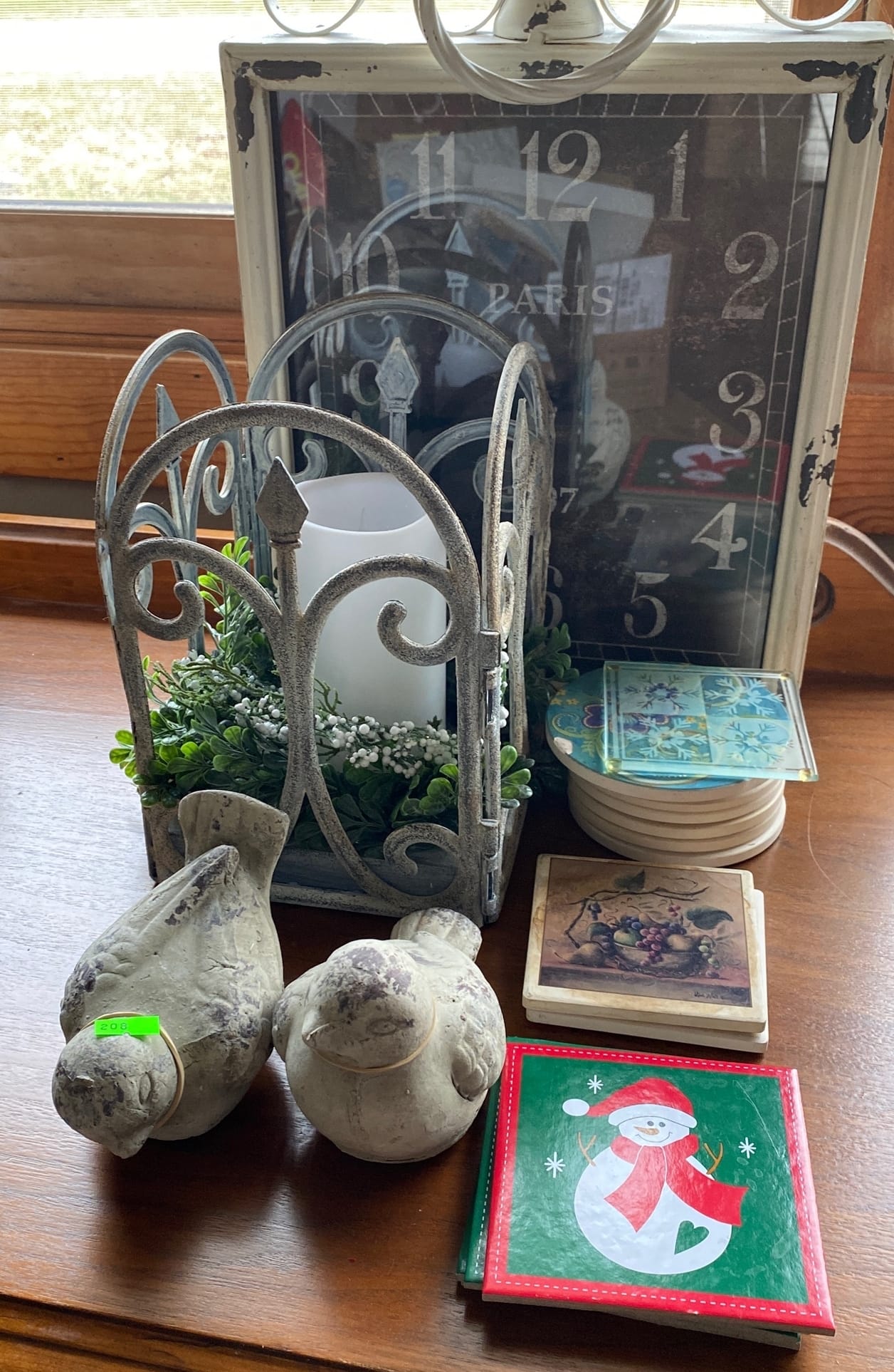 208 Paris decor battery operated clock, coasters, plastic candle holder, stone birds
