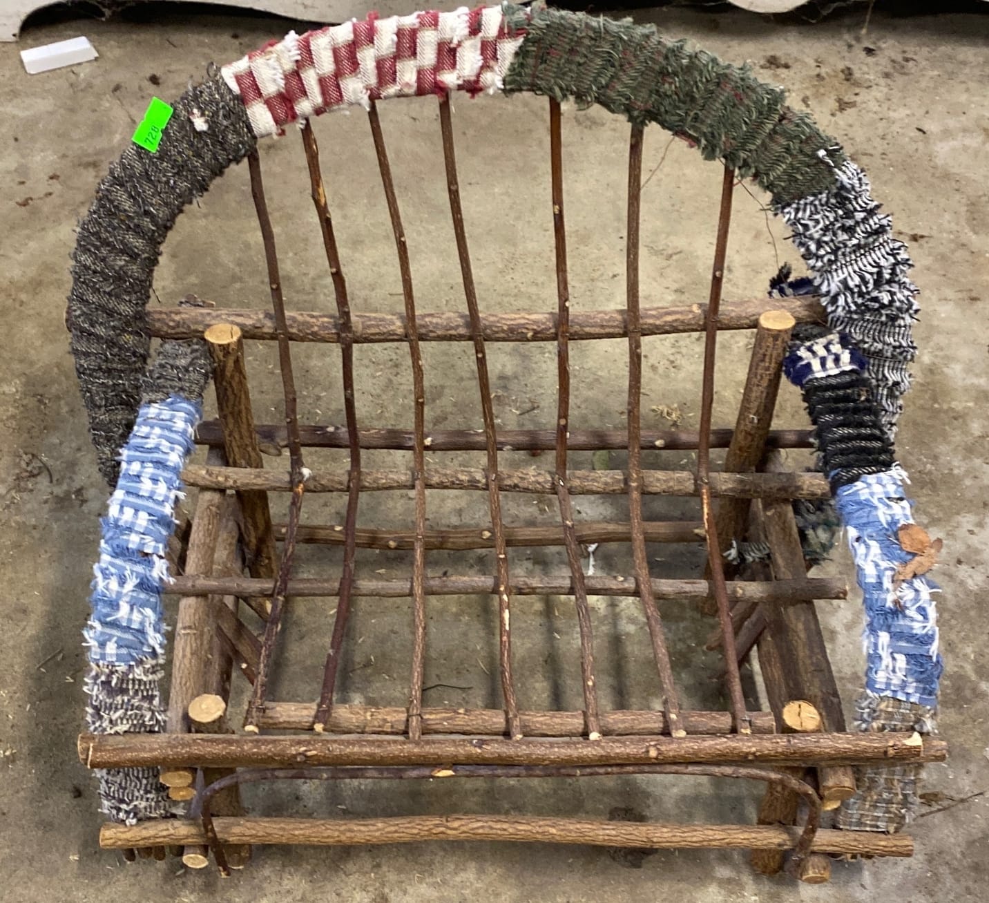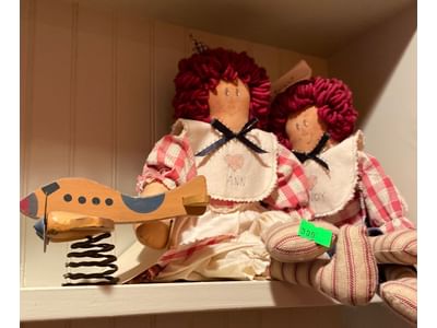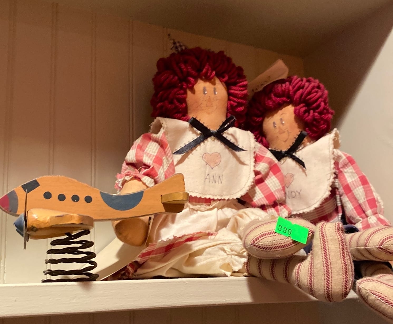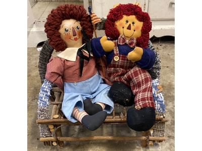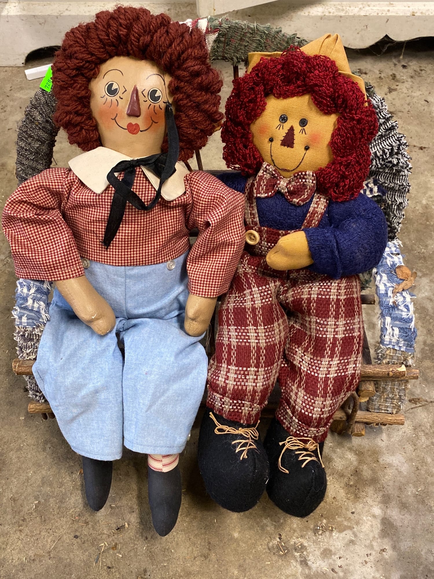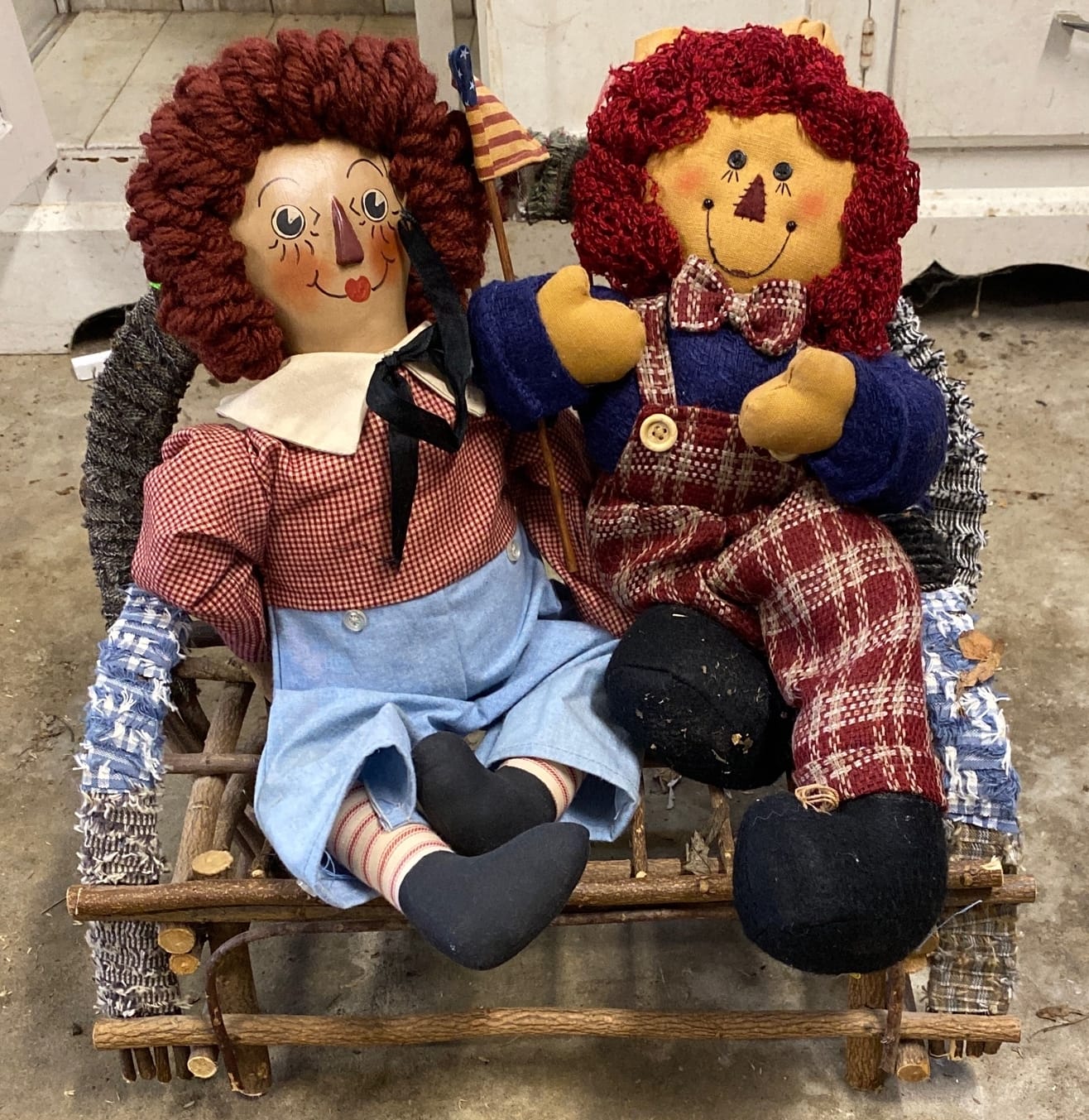728 Raggedy Ann and Andy dolls on twig bench 16x13x10