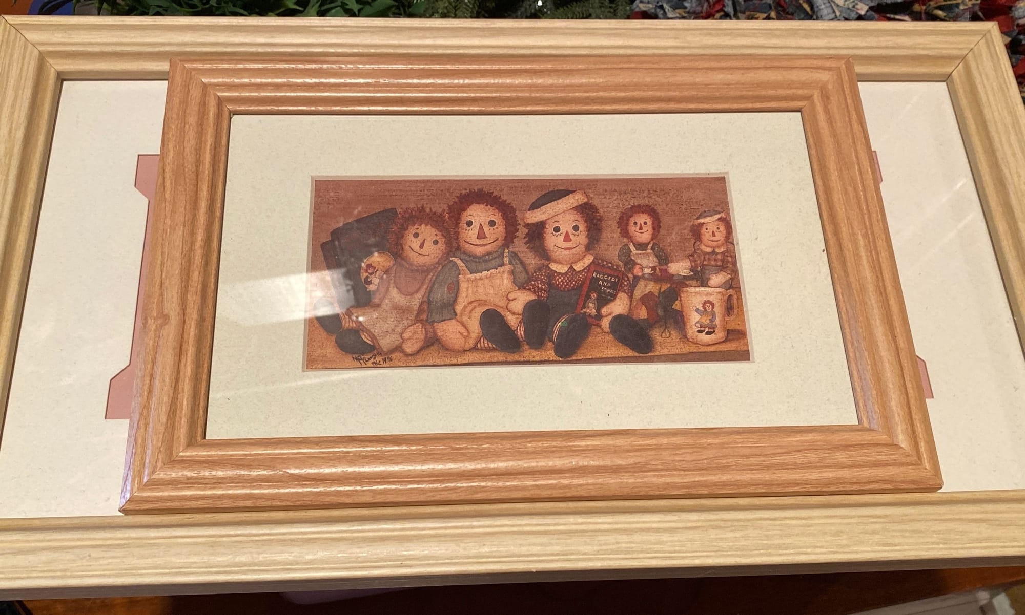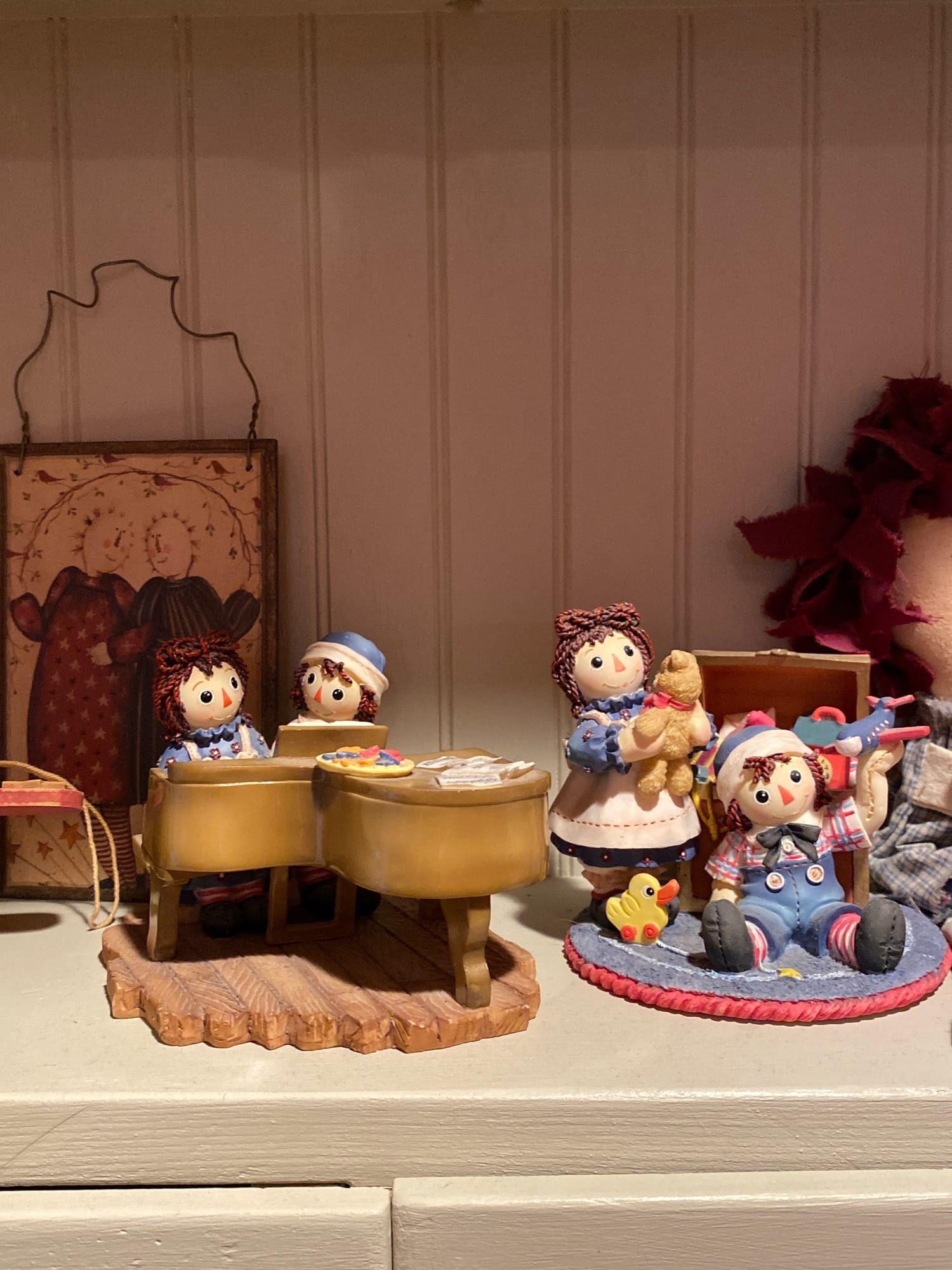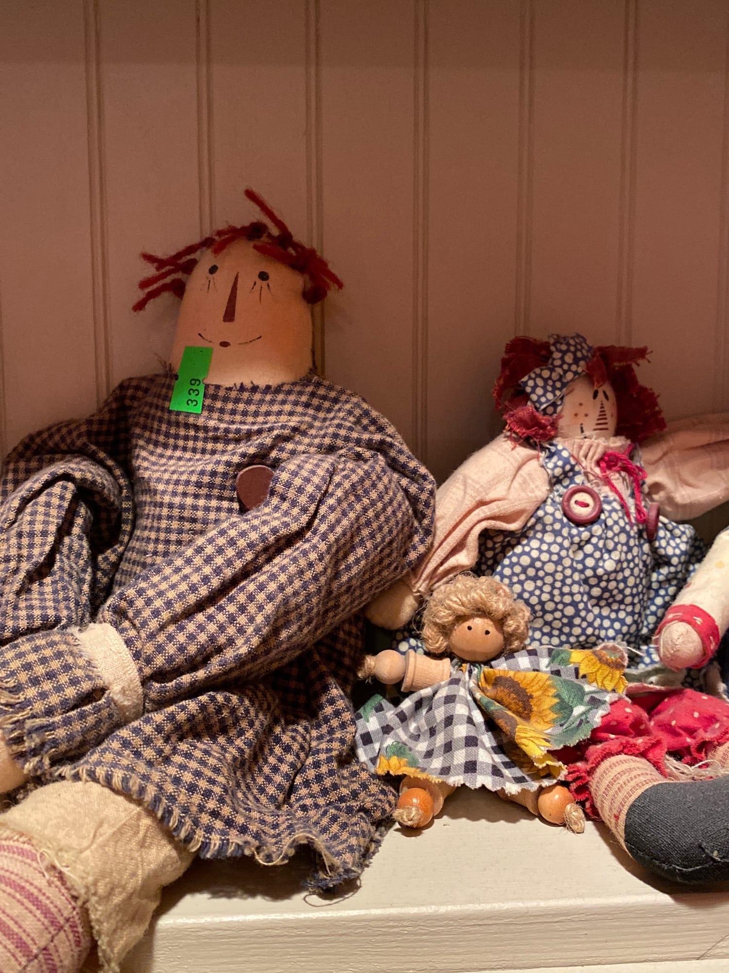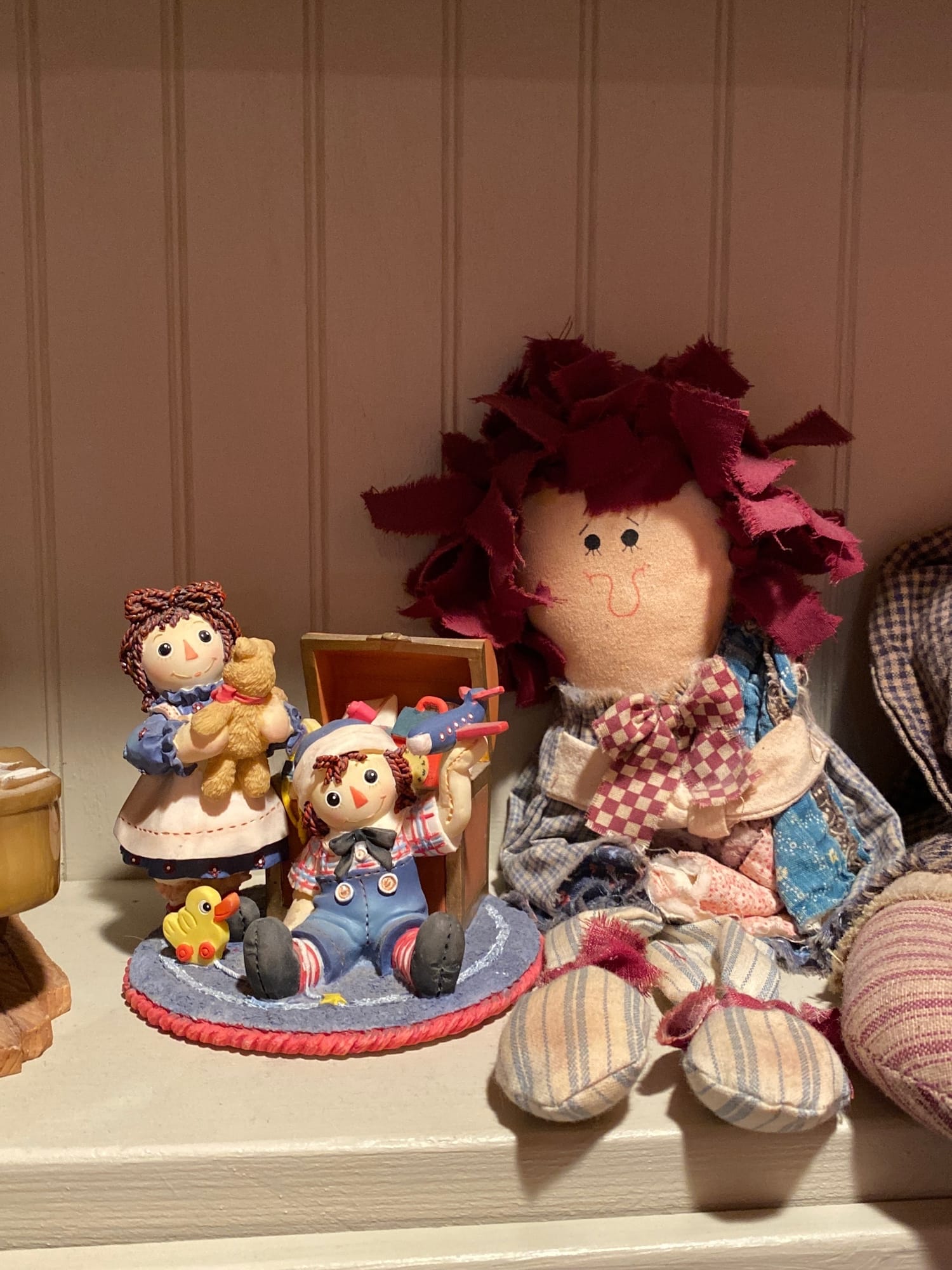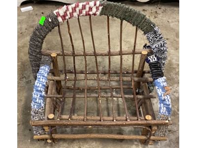 728 Raggedy Ann and Andy dolls on twig bench 16x13x10