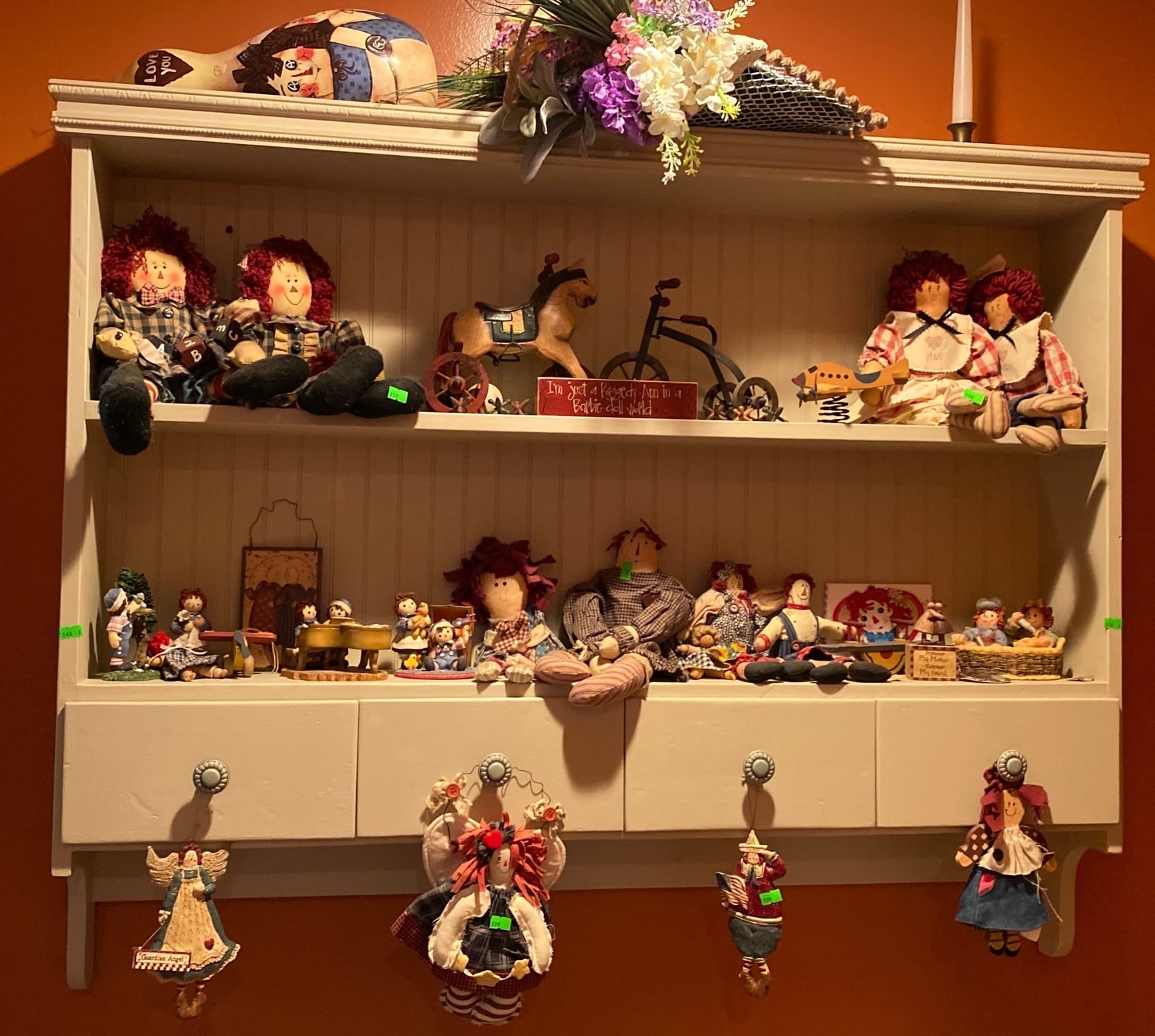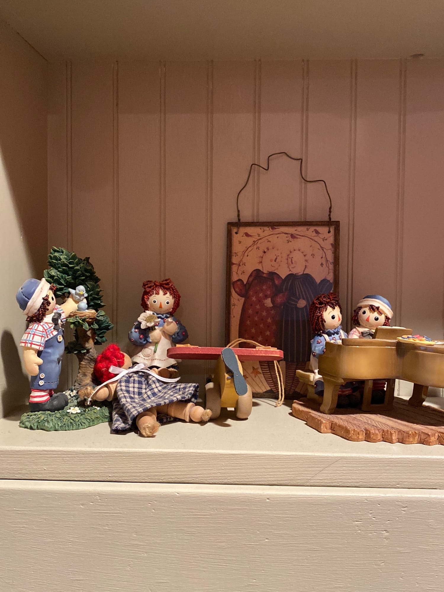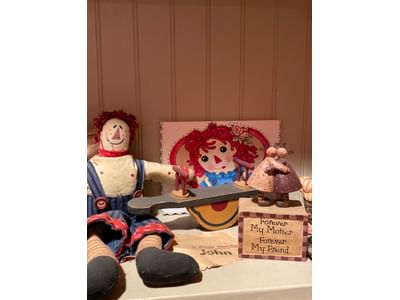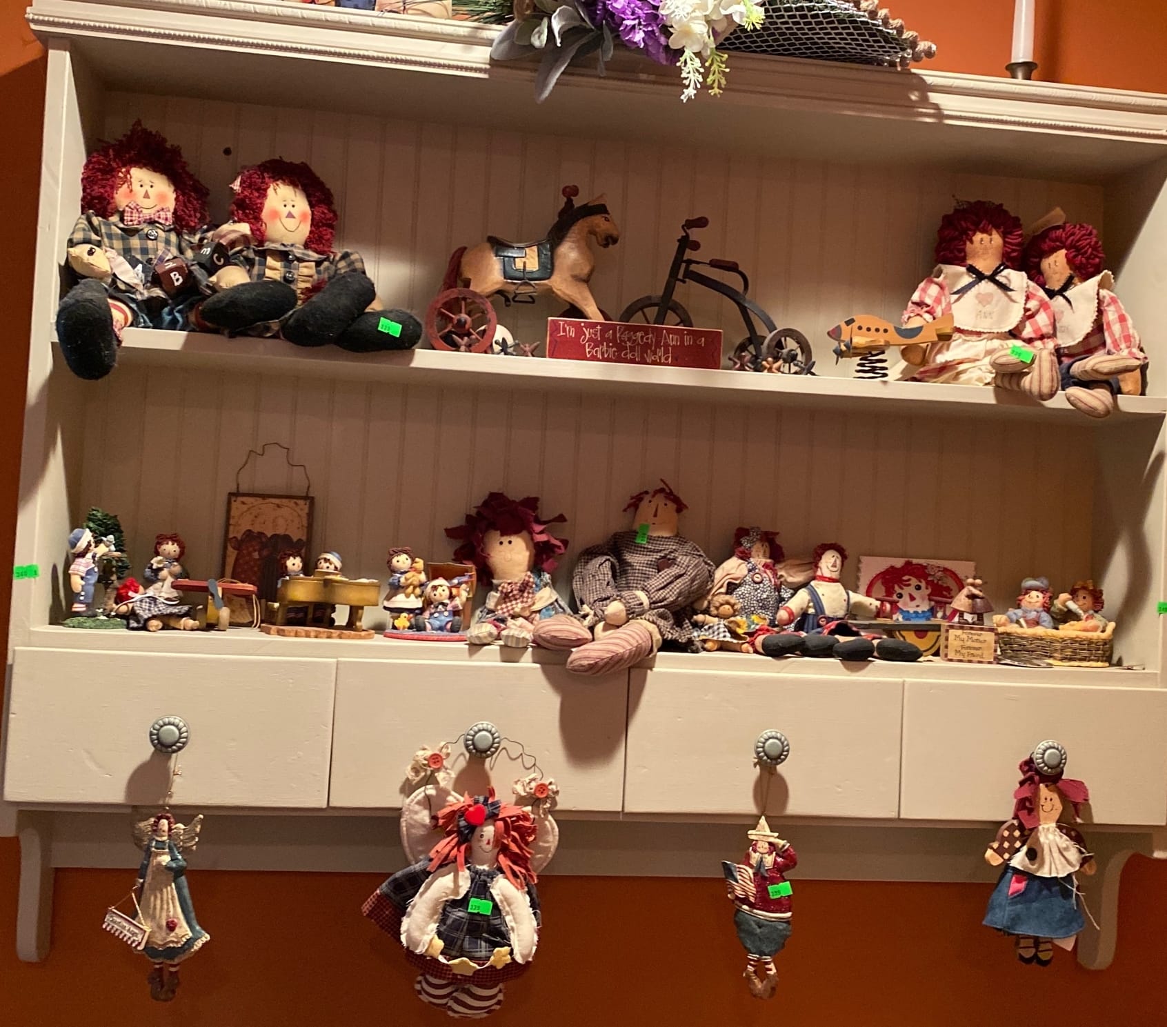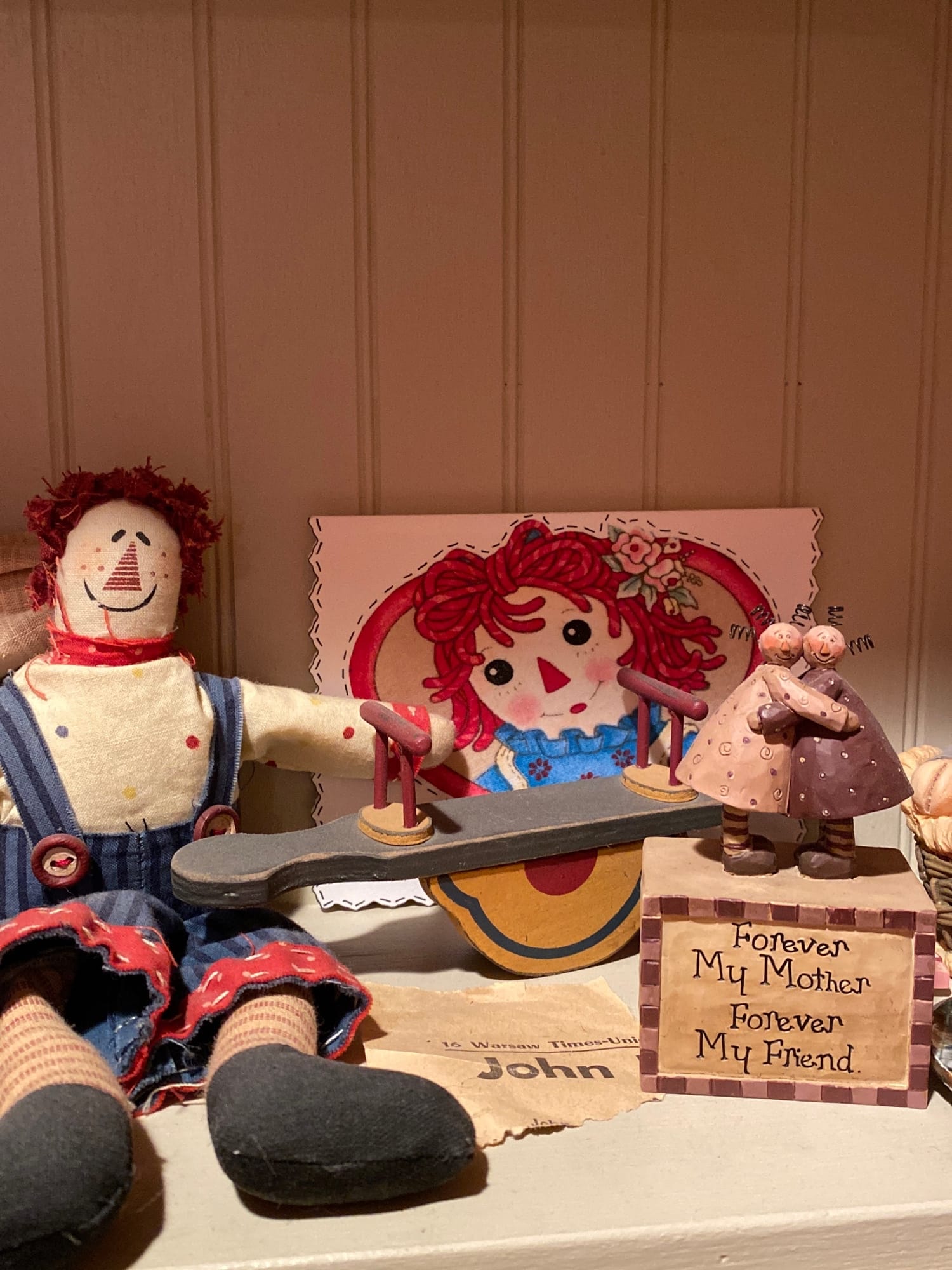 728 Raggedy Ann and Andy dolls on twig bench 16x13x10