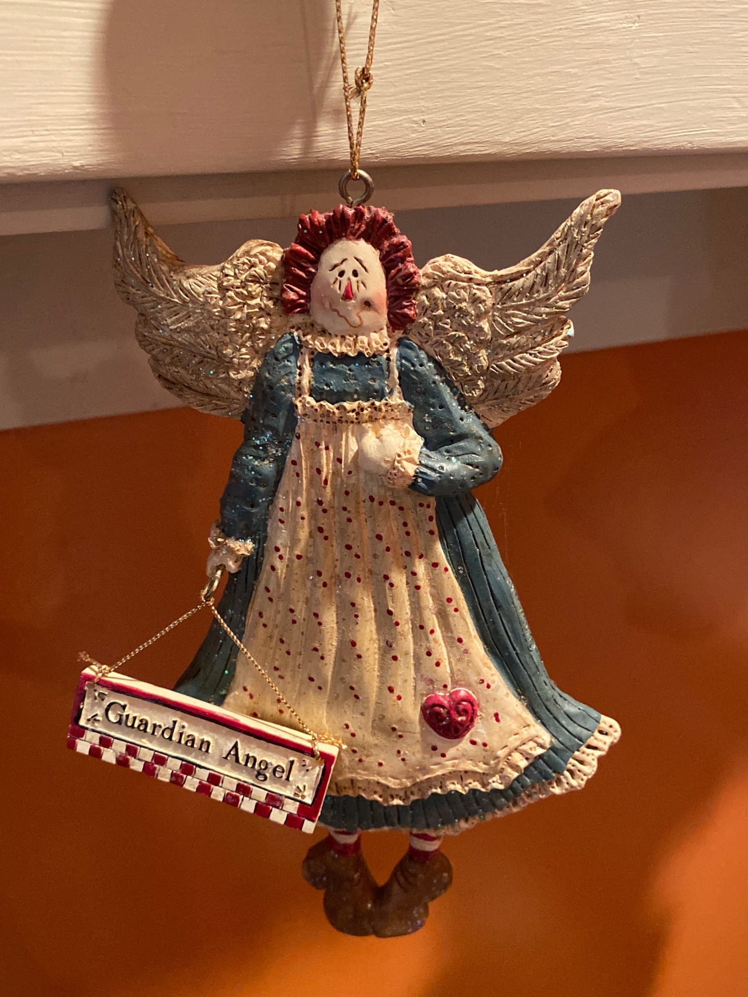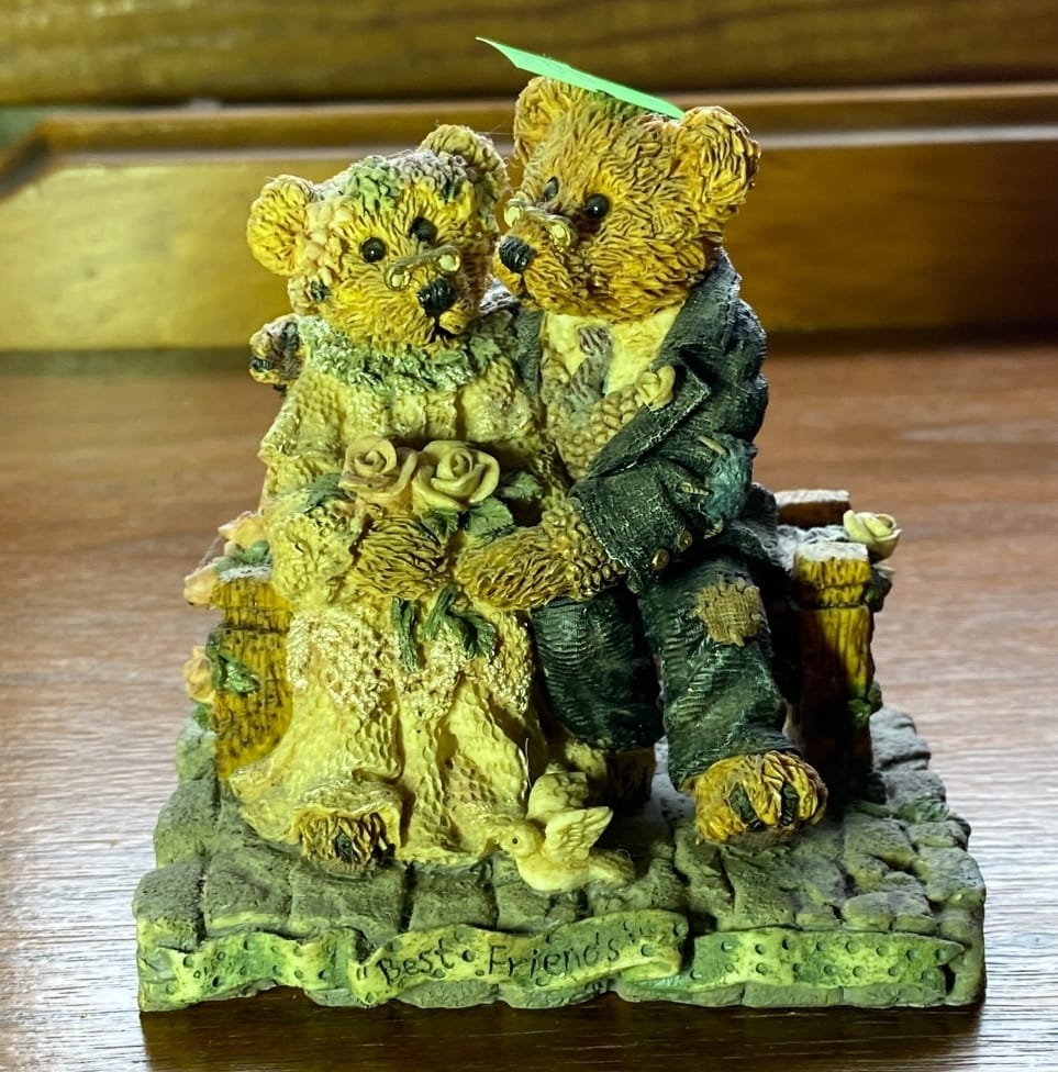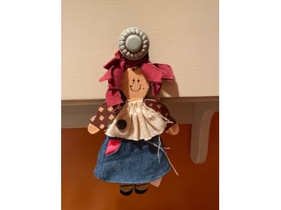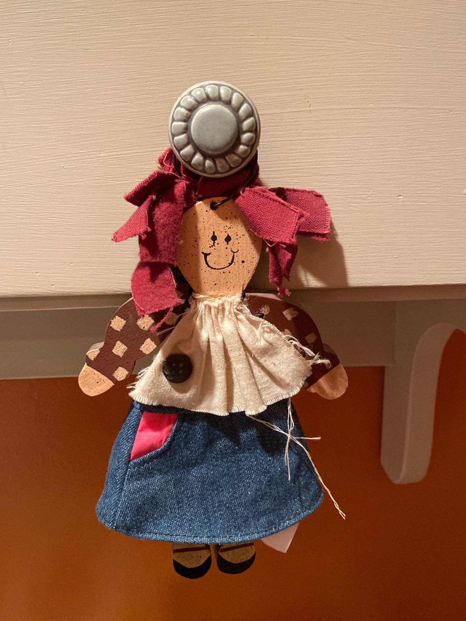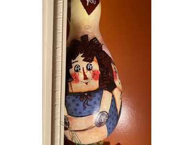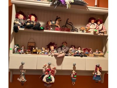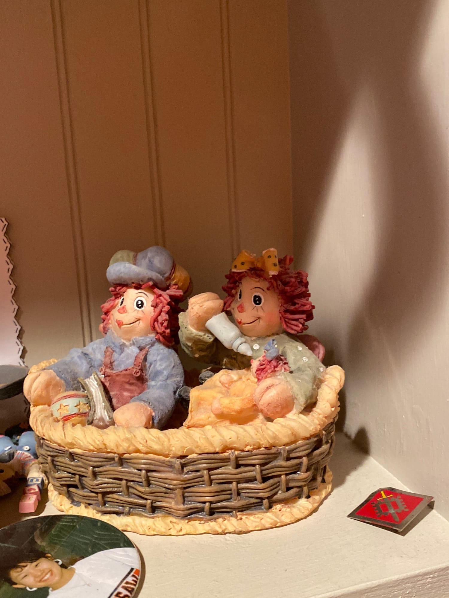 728 Raggedy Ann and Andy dolls on twig bench 16x13x10