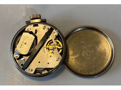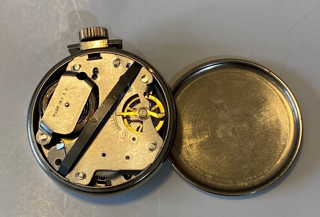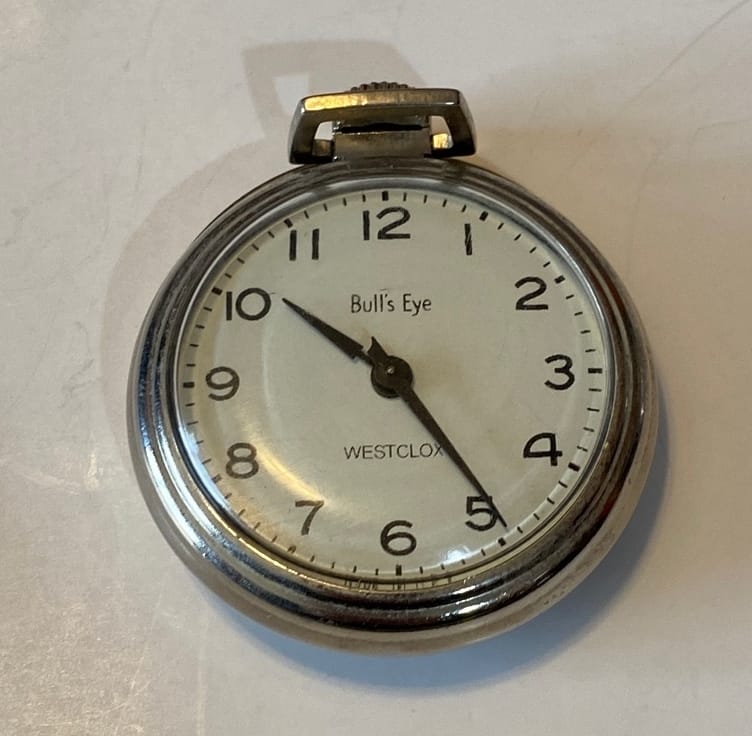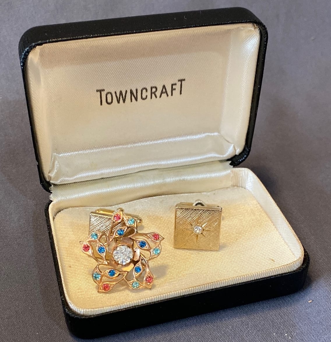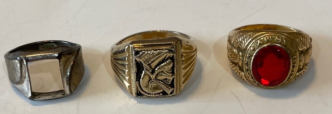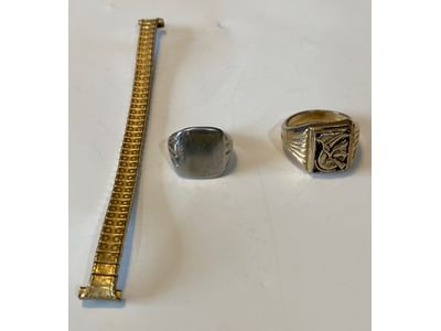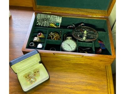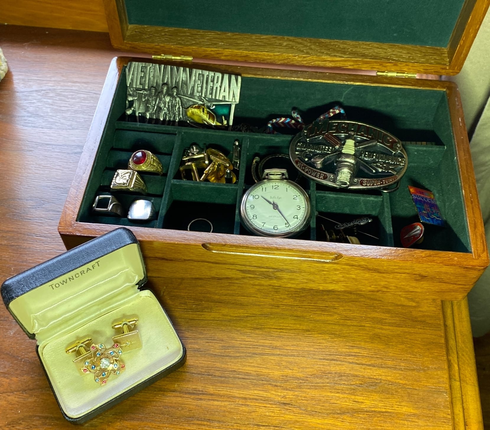 211 Jewelry box with Westcox bull's eye pocket watch, class ring, rings, belt buckles, cuff links, misc.
