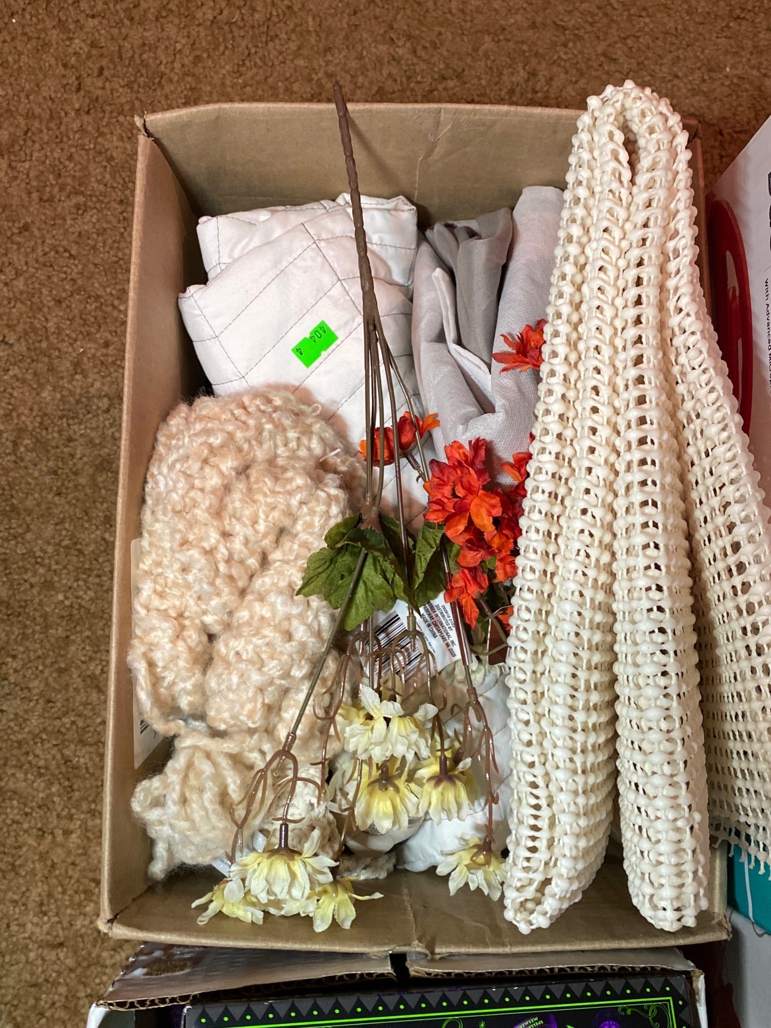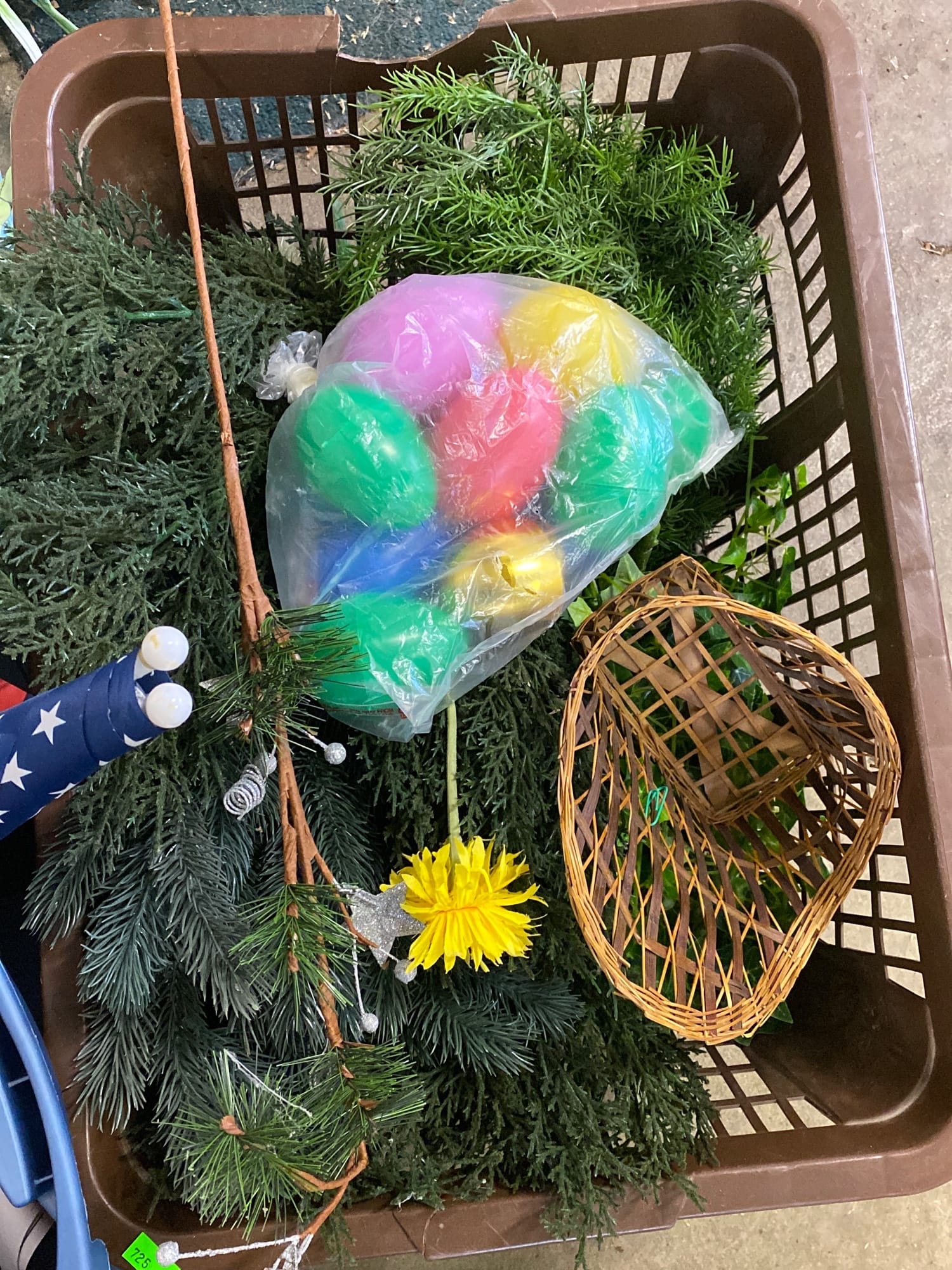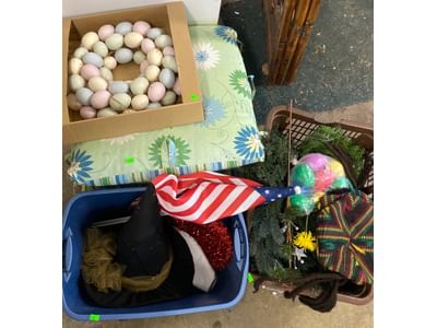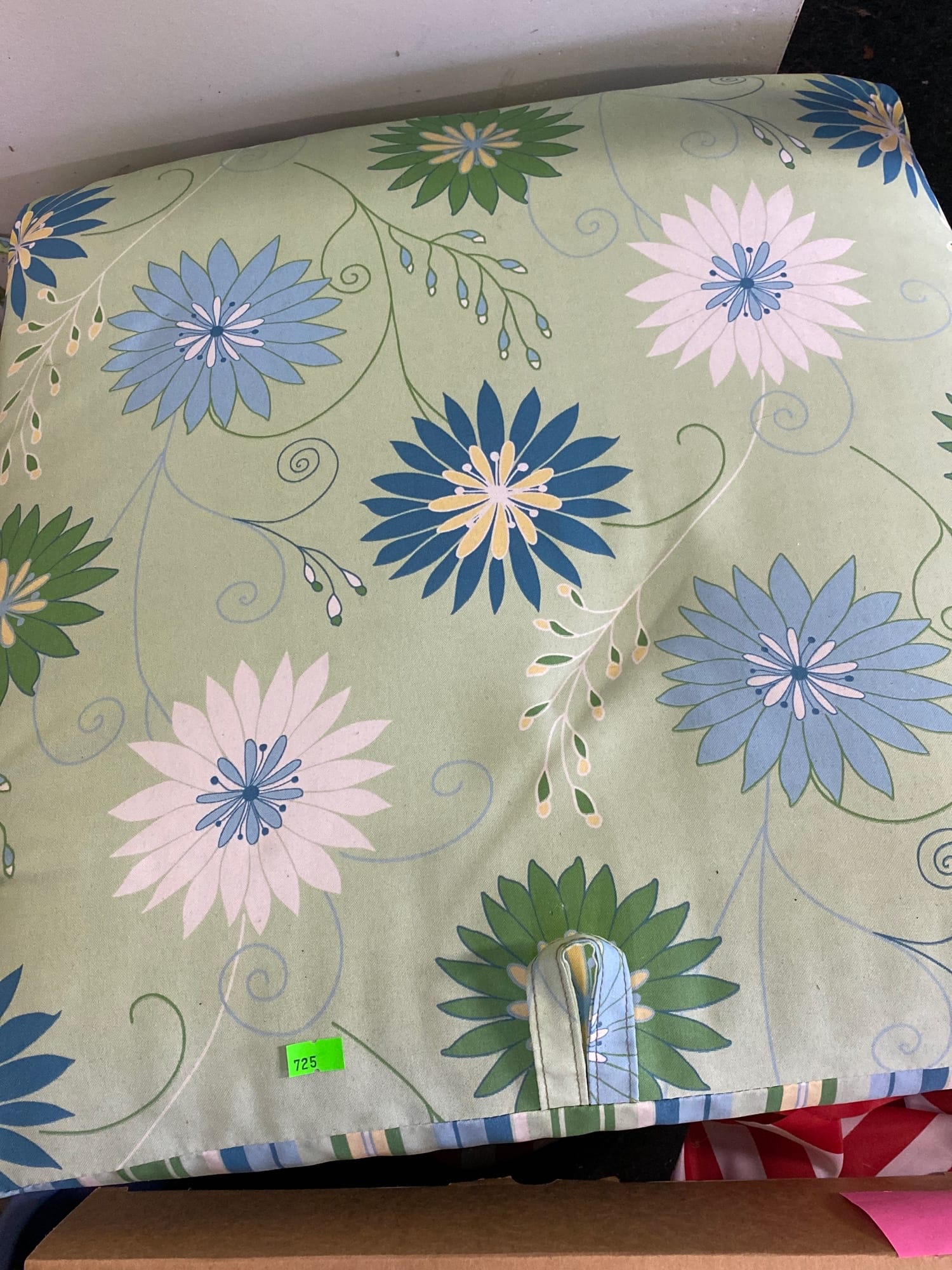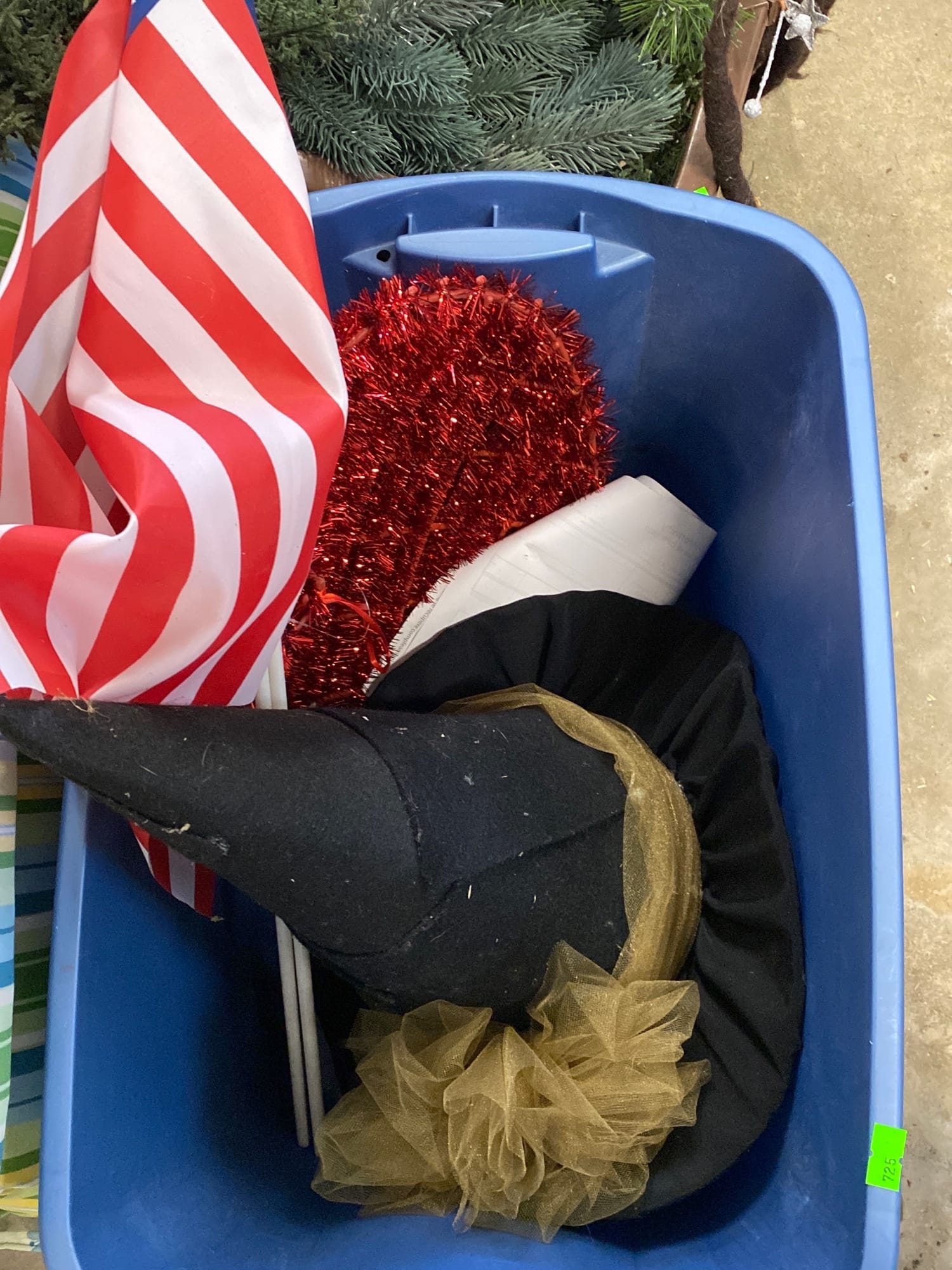 725 Chair cushions, Easter wreath, greenery, craft witch hat, flag, totes, misc.