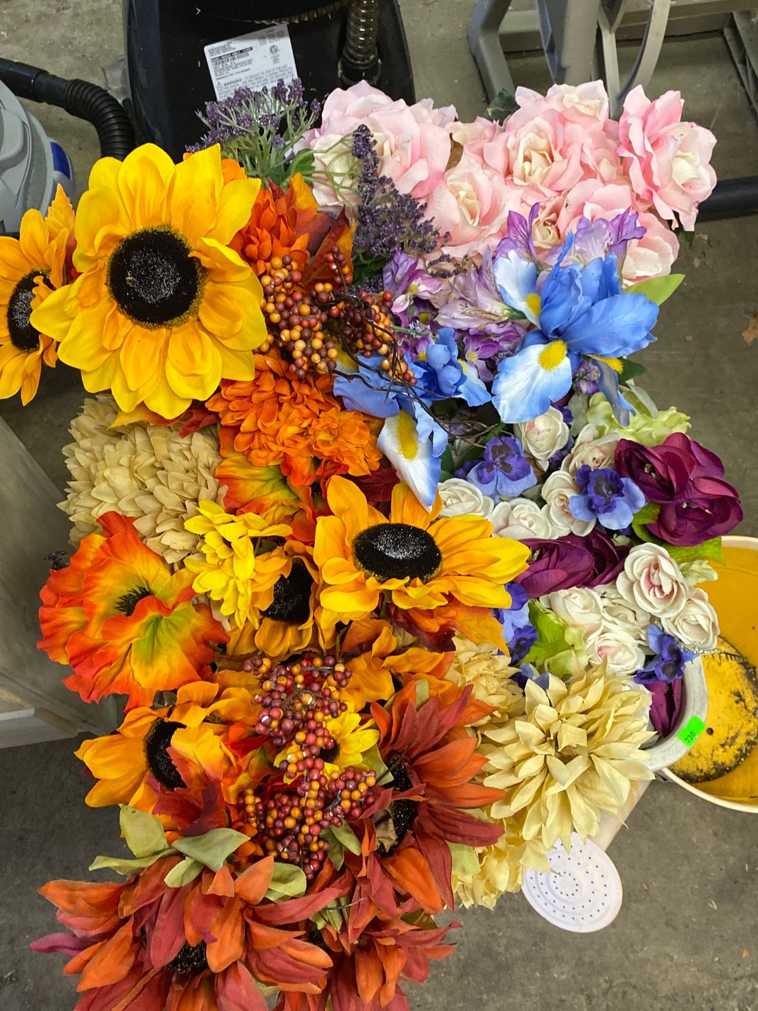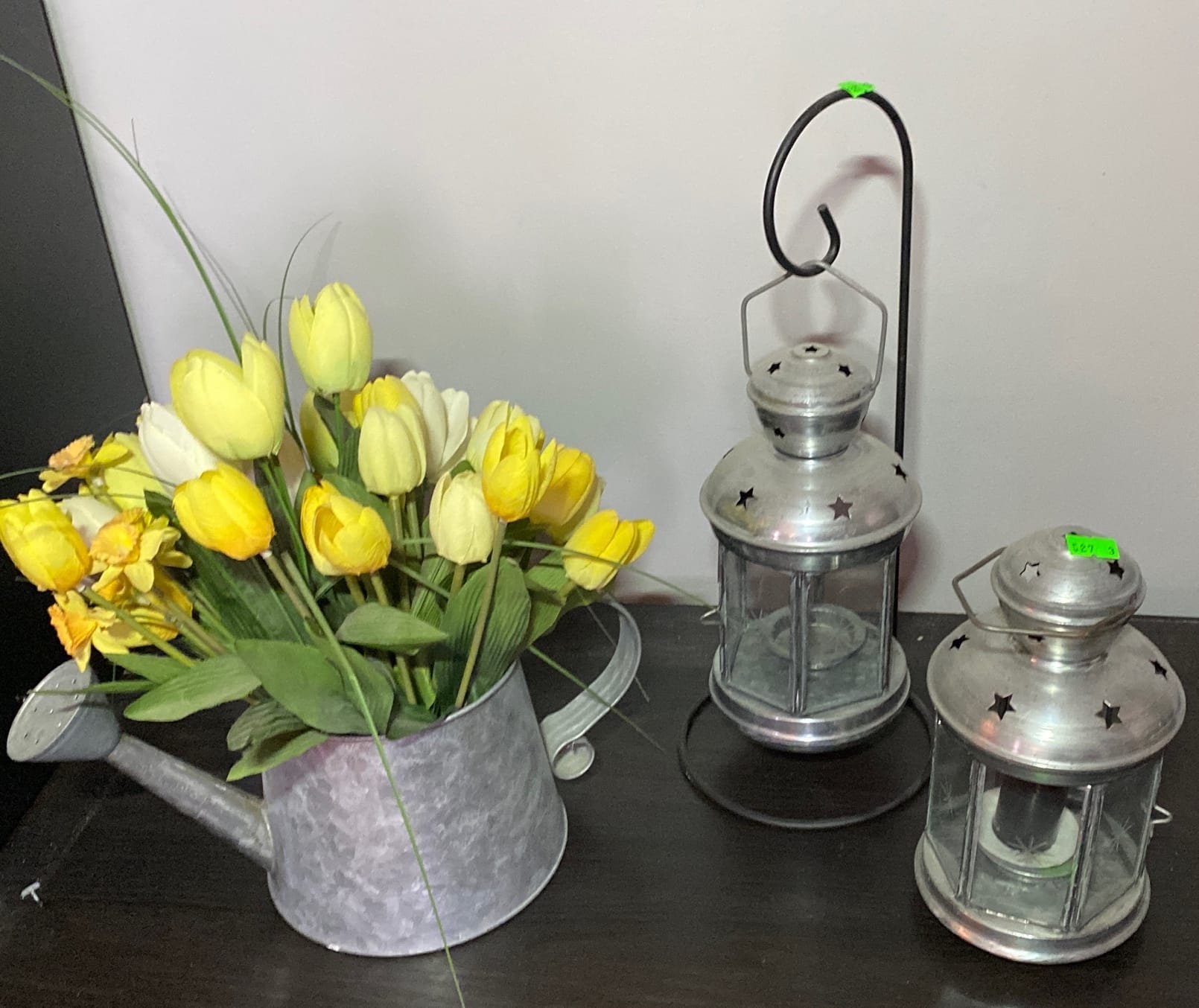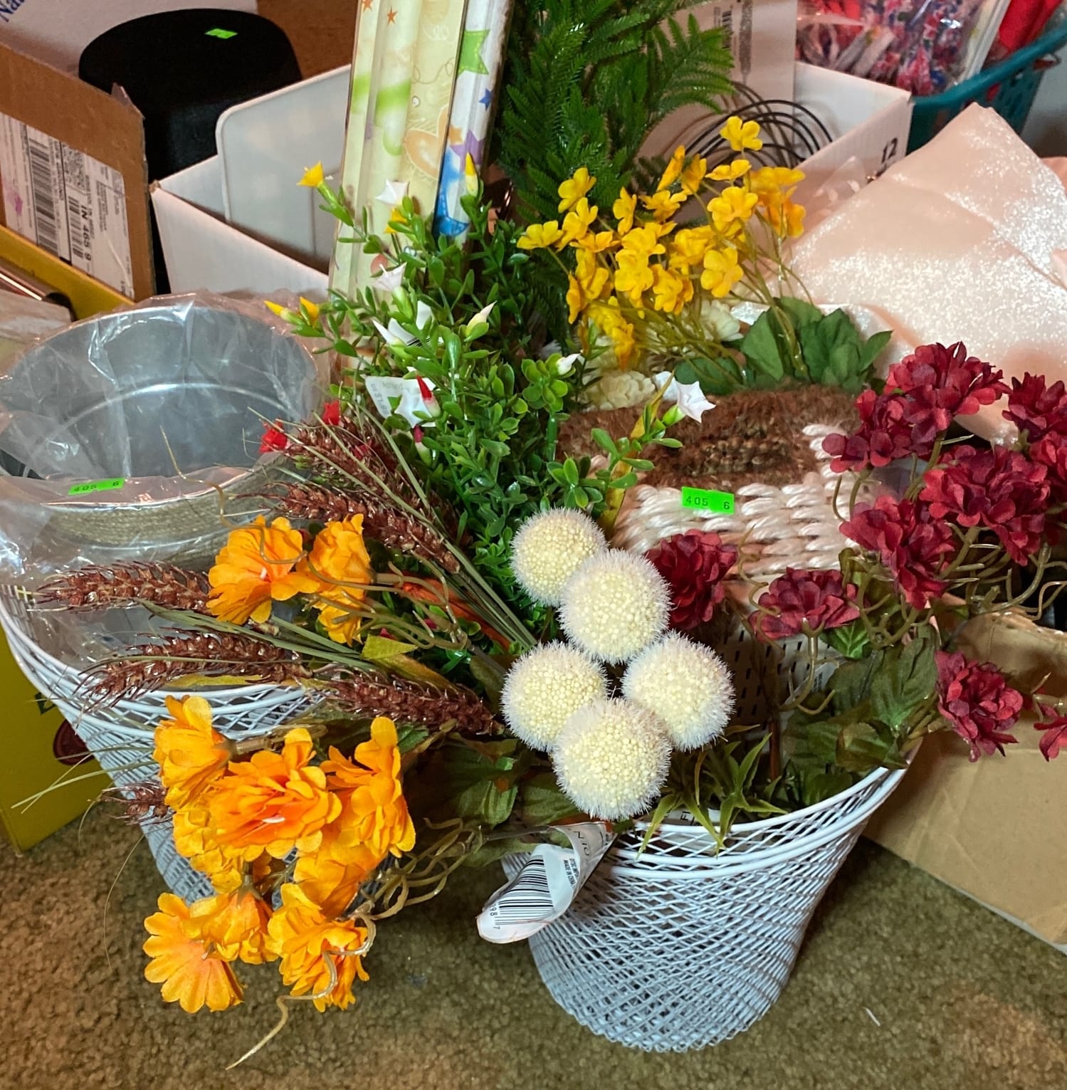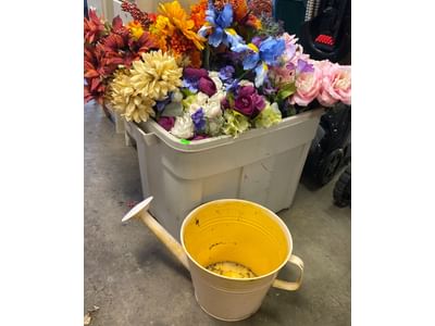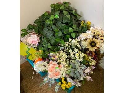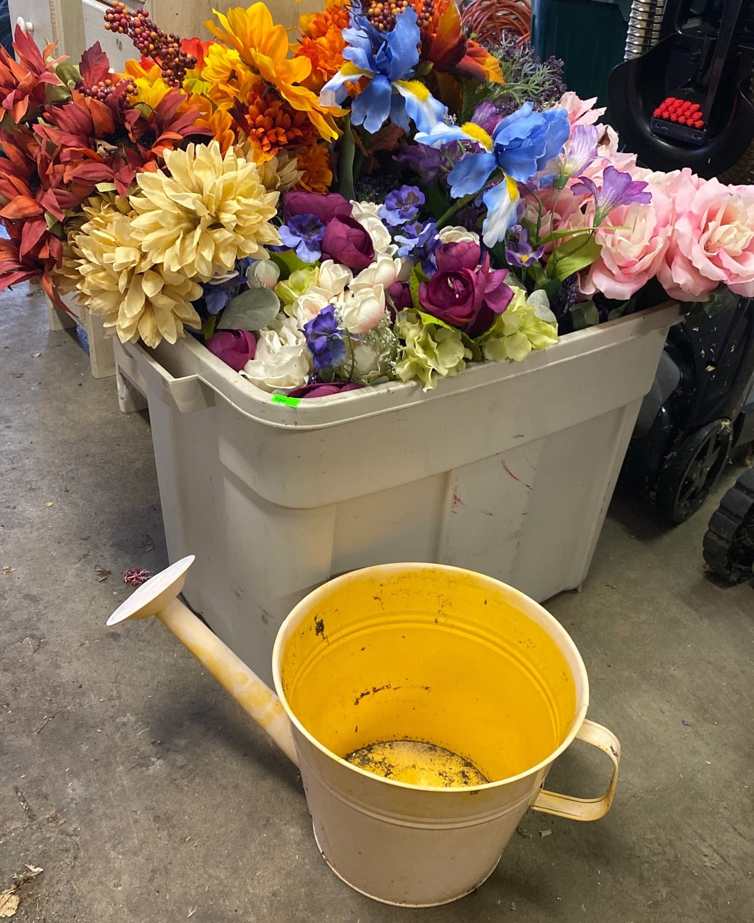 730 Silk flower assortment, tin watering can & plastic tree 72in