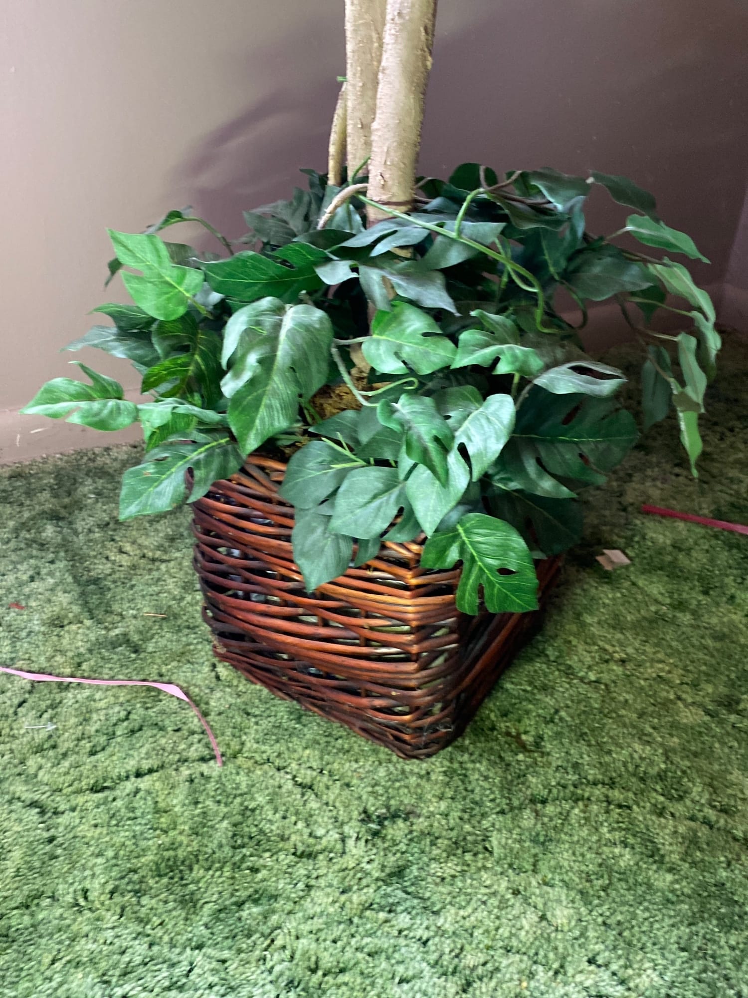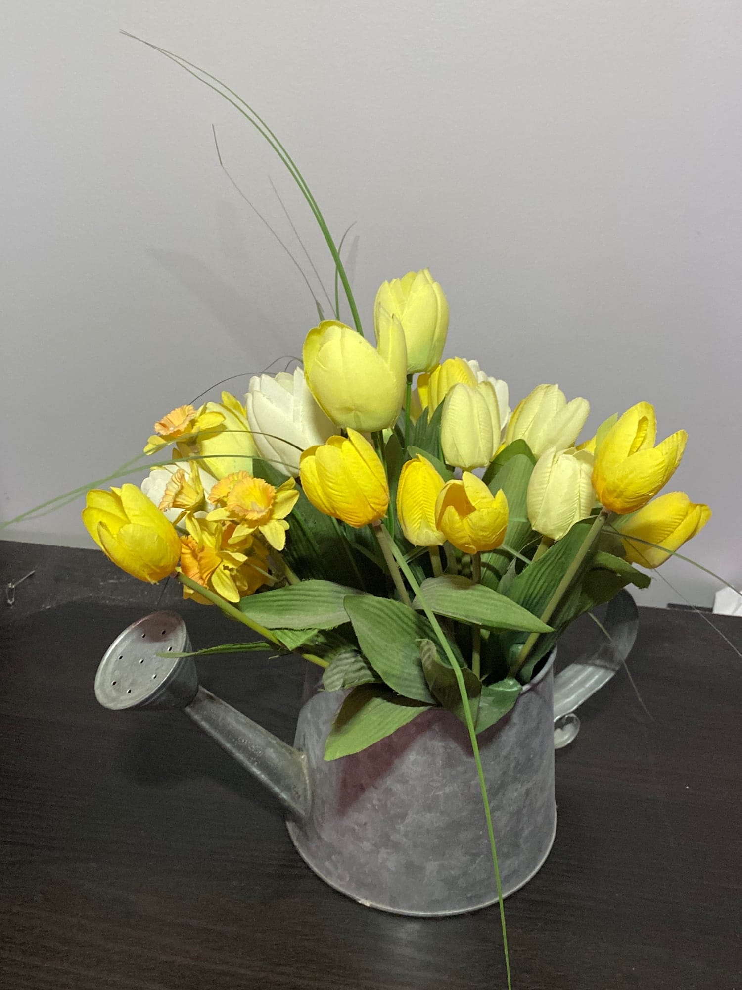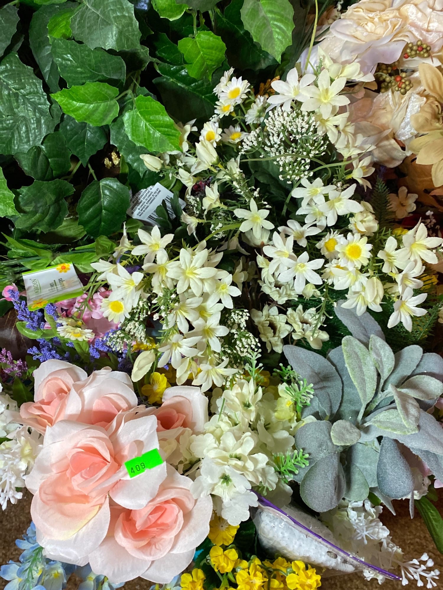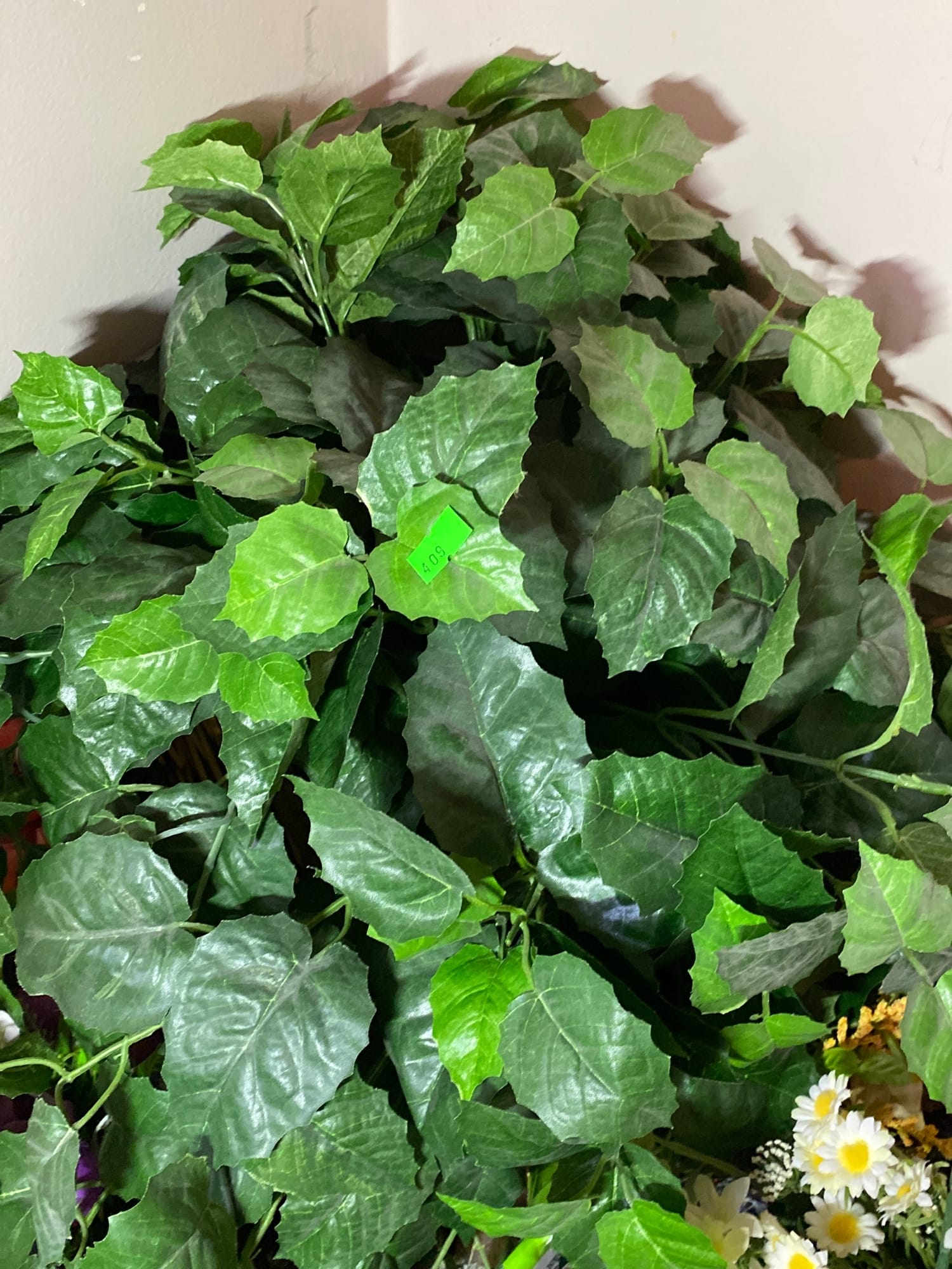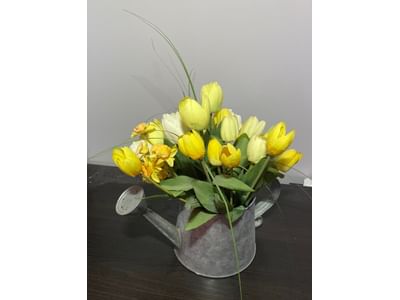 730 Silk flower assortment, tin watering can & plastic tree 72in