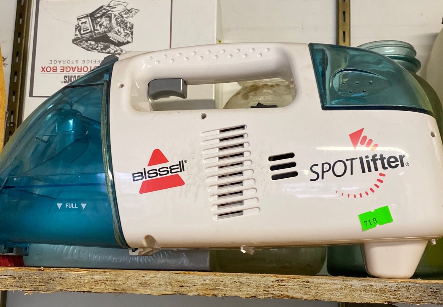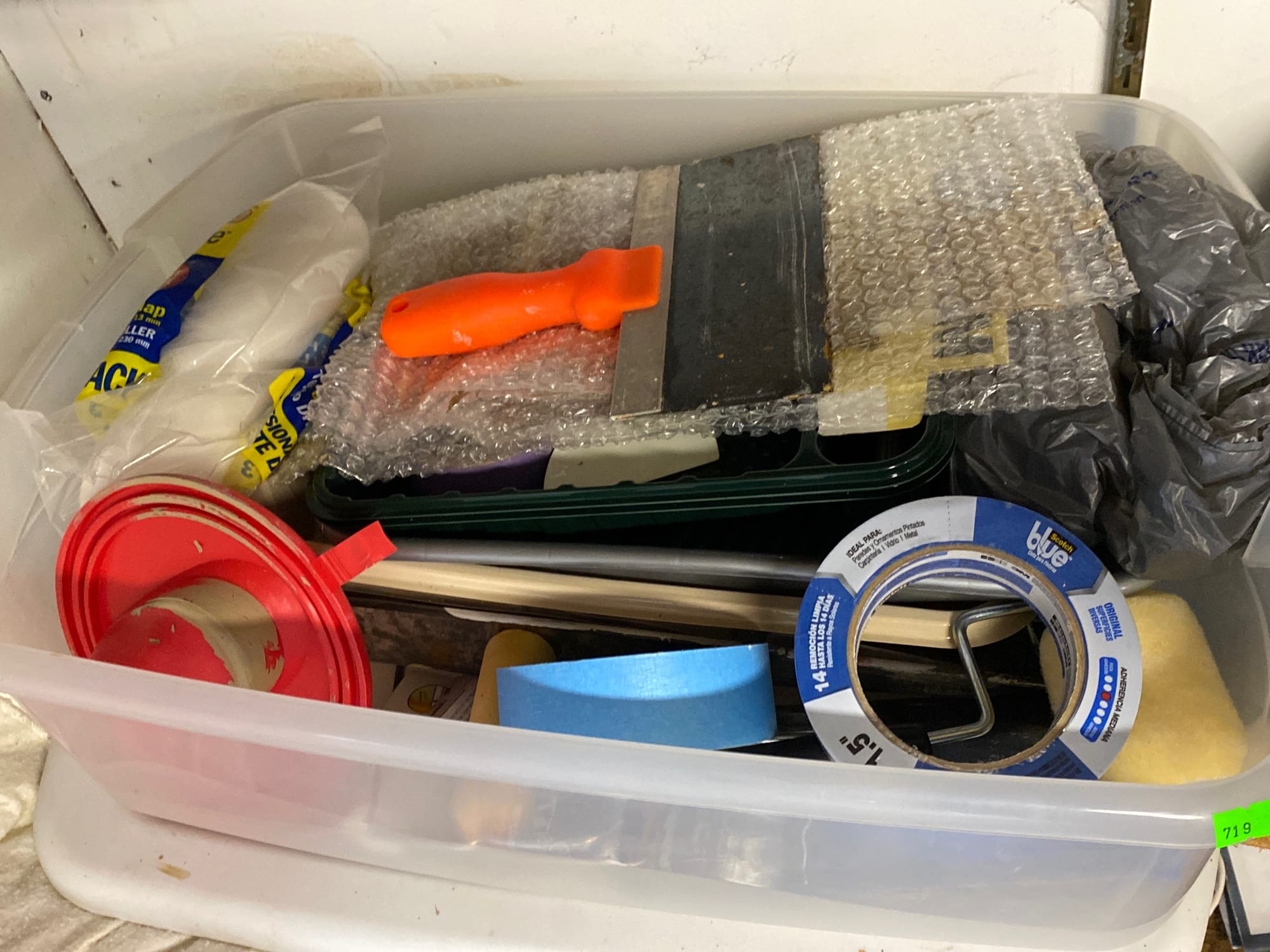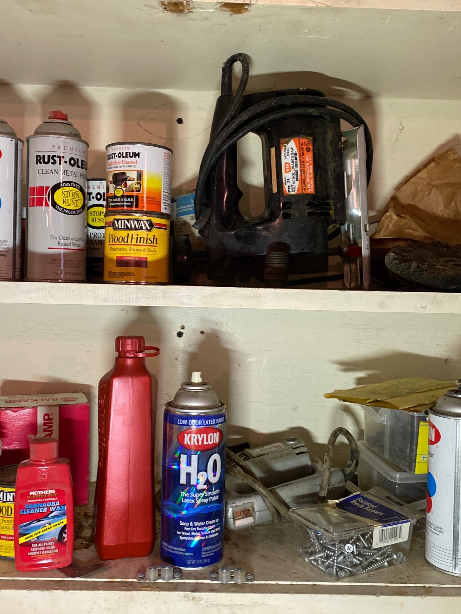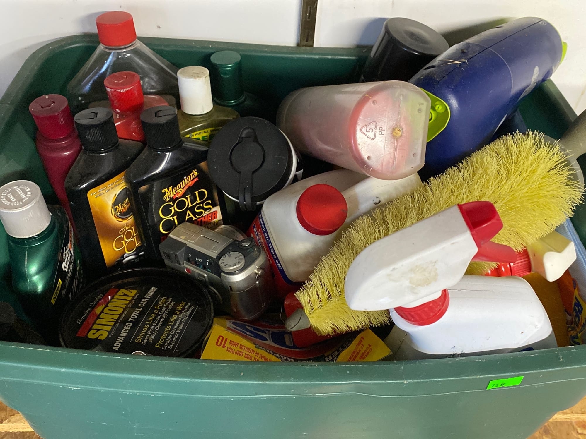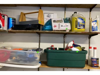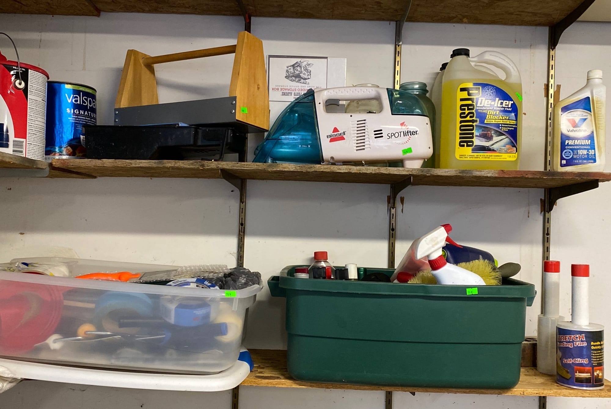 719 Bissell spot lifter, painting supplies, washer fluid, car cleaning supplies, stretch film, tool box, misc.