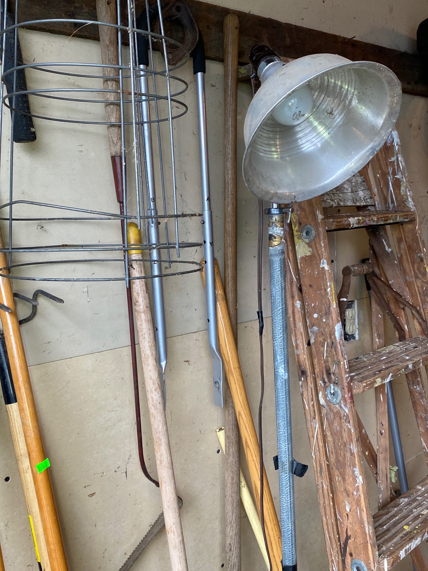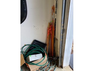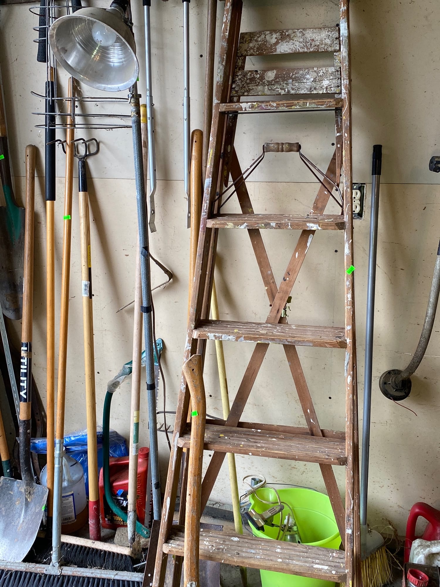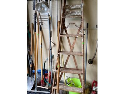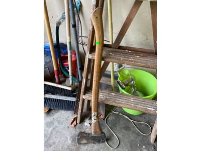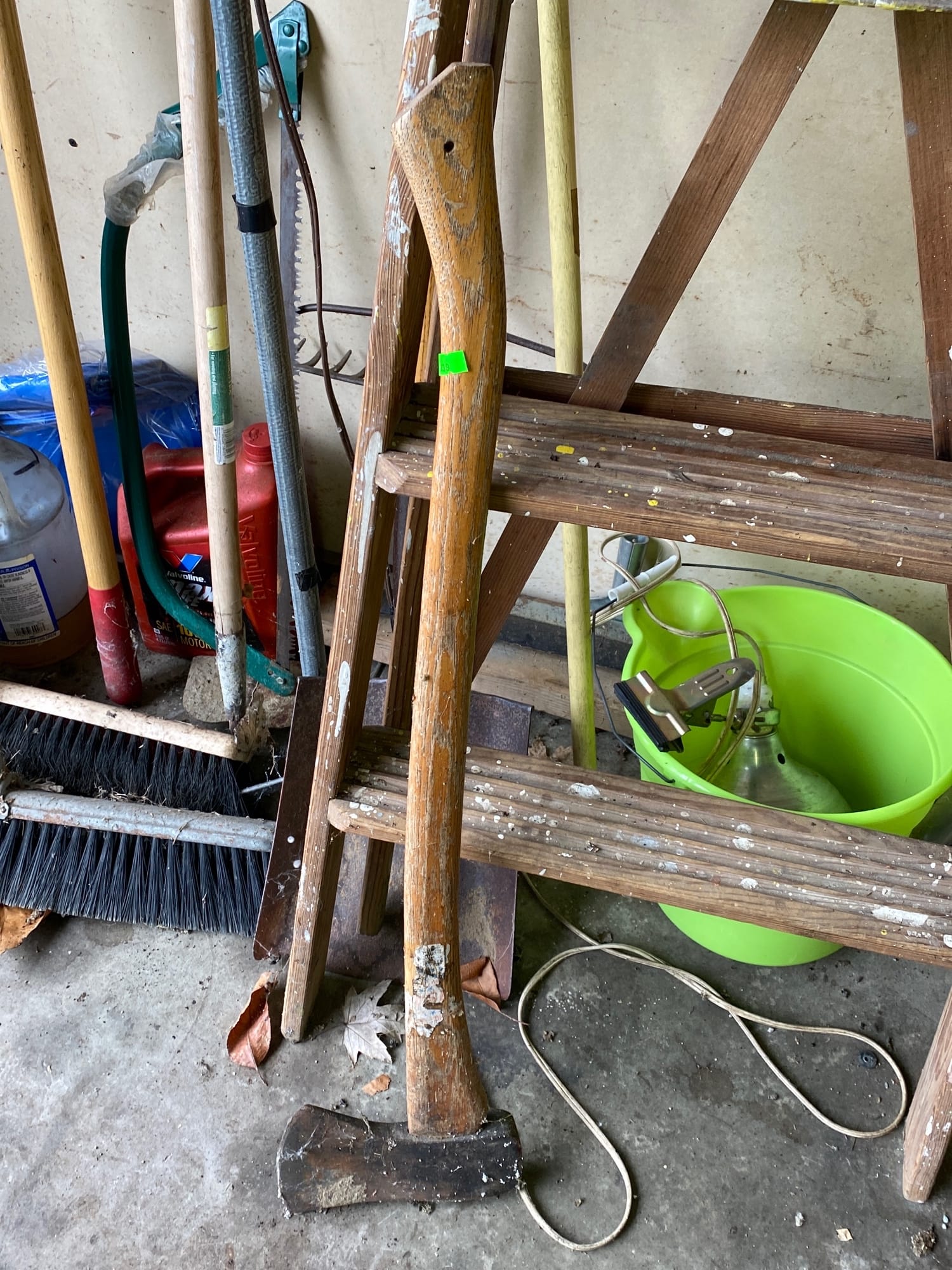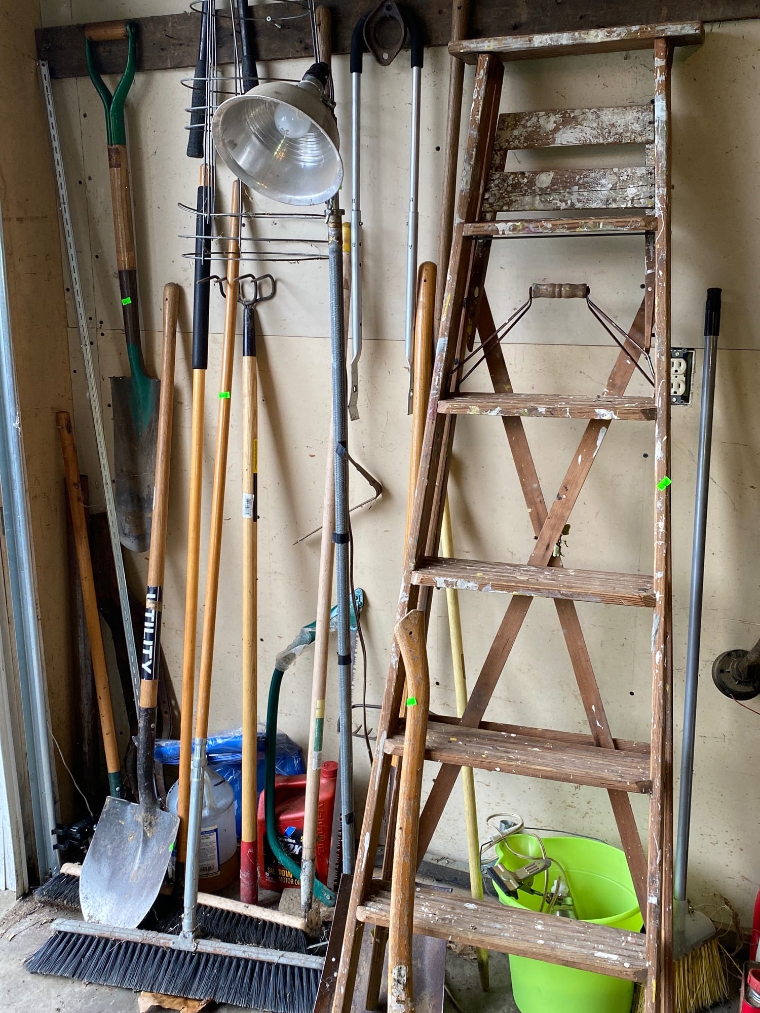 839 Brooms, saw, tomato cages, wood step ladder 5ft, axe, contents as shown in pictures