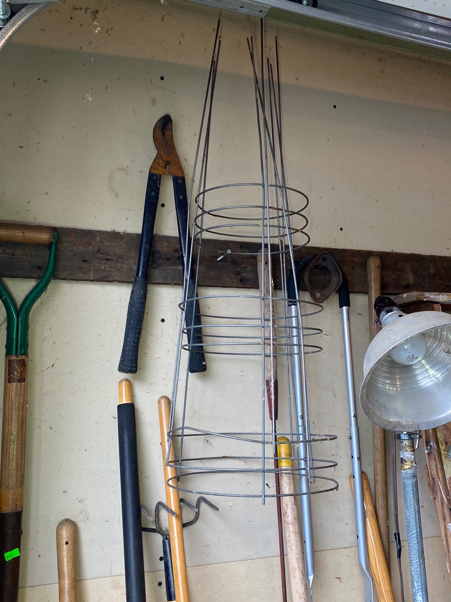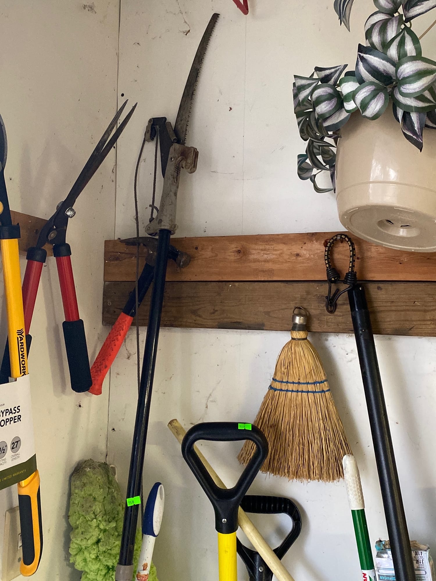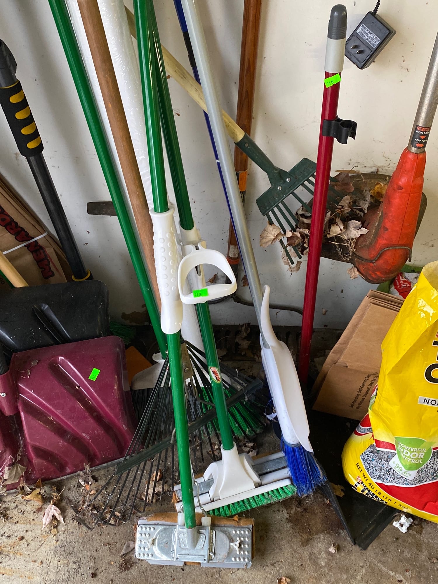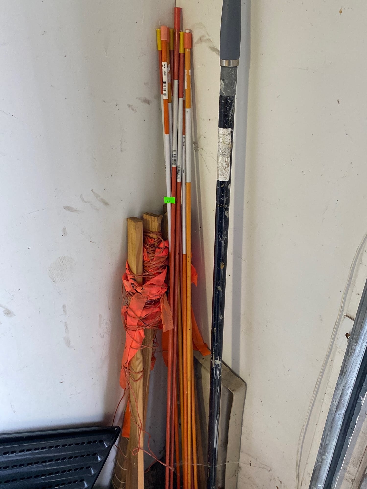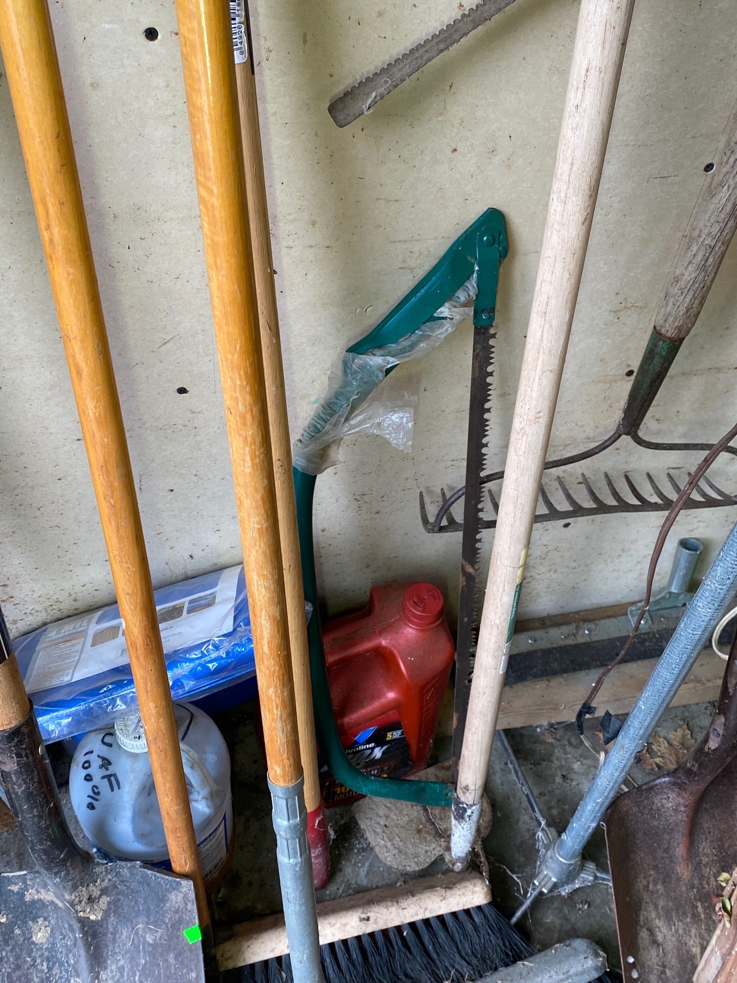 839 Brooms, saw, tomato cages, wood step ladder 5ft, axe, contents as shown in pictures