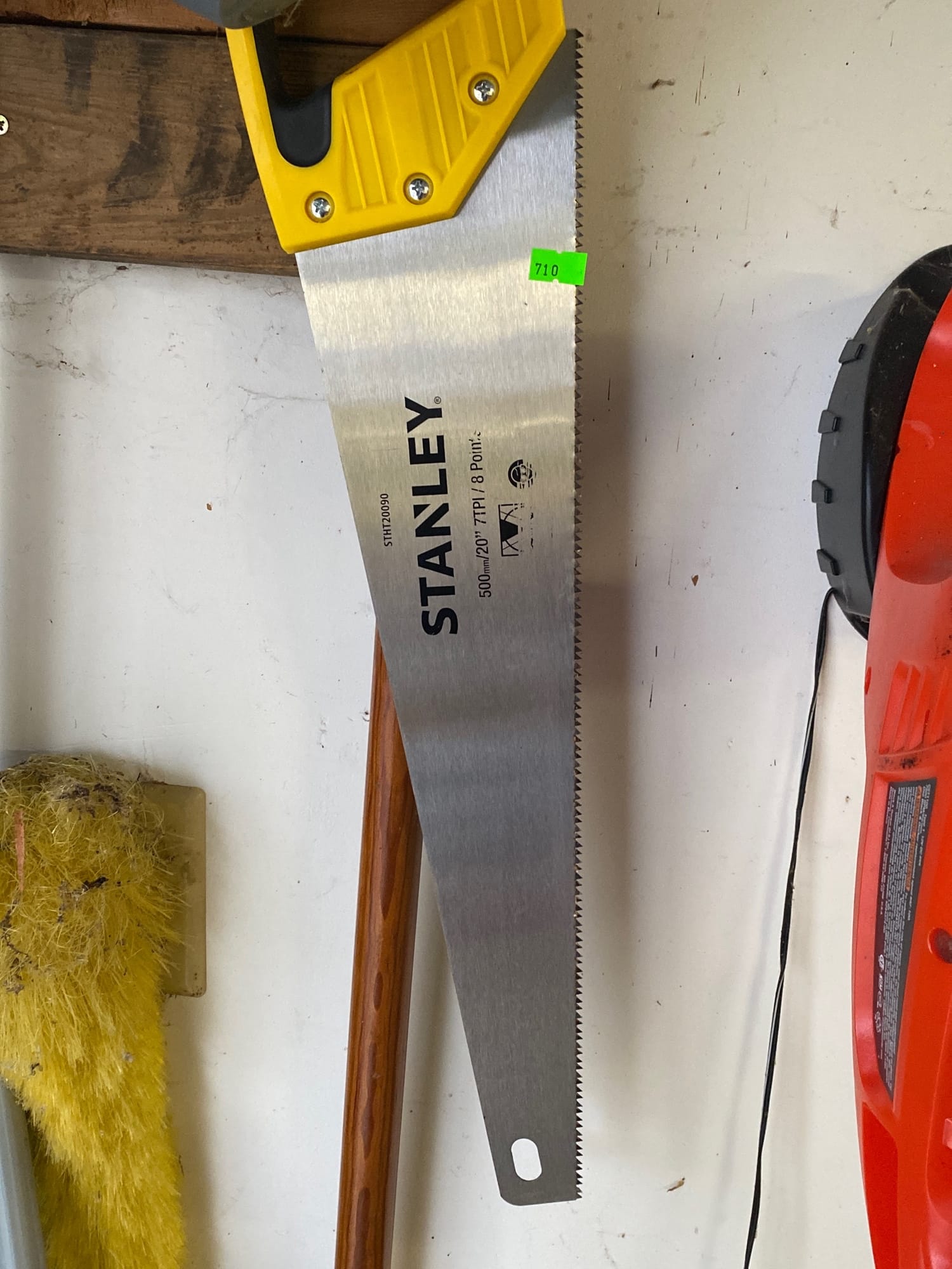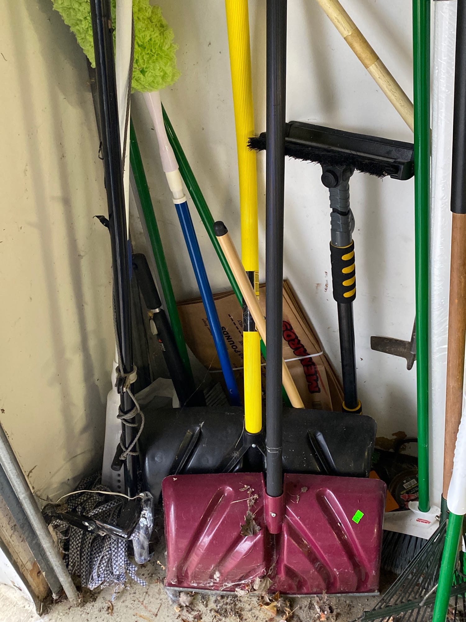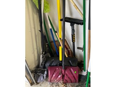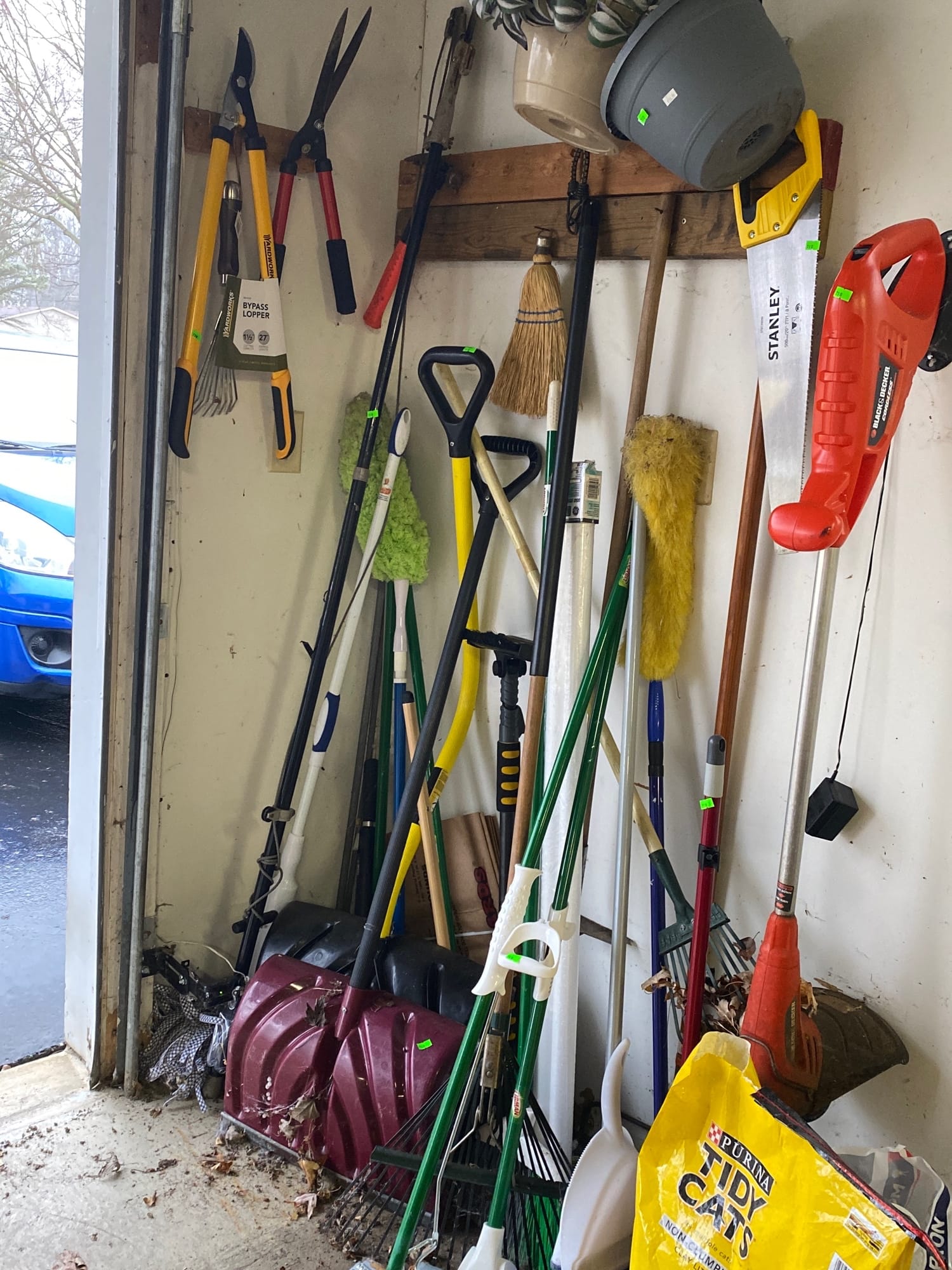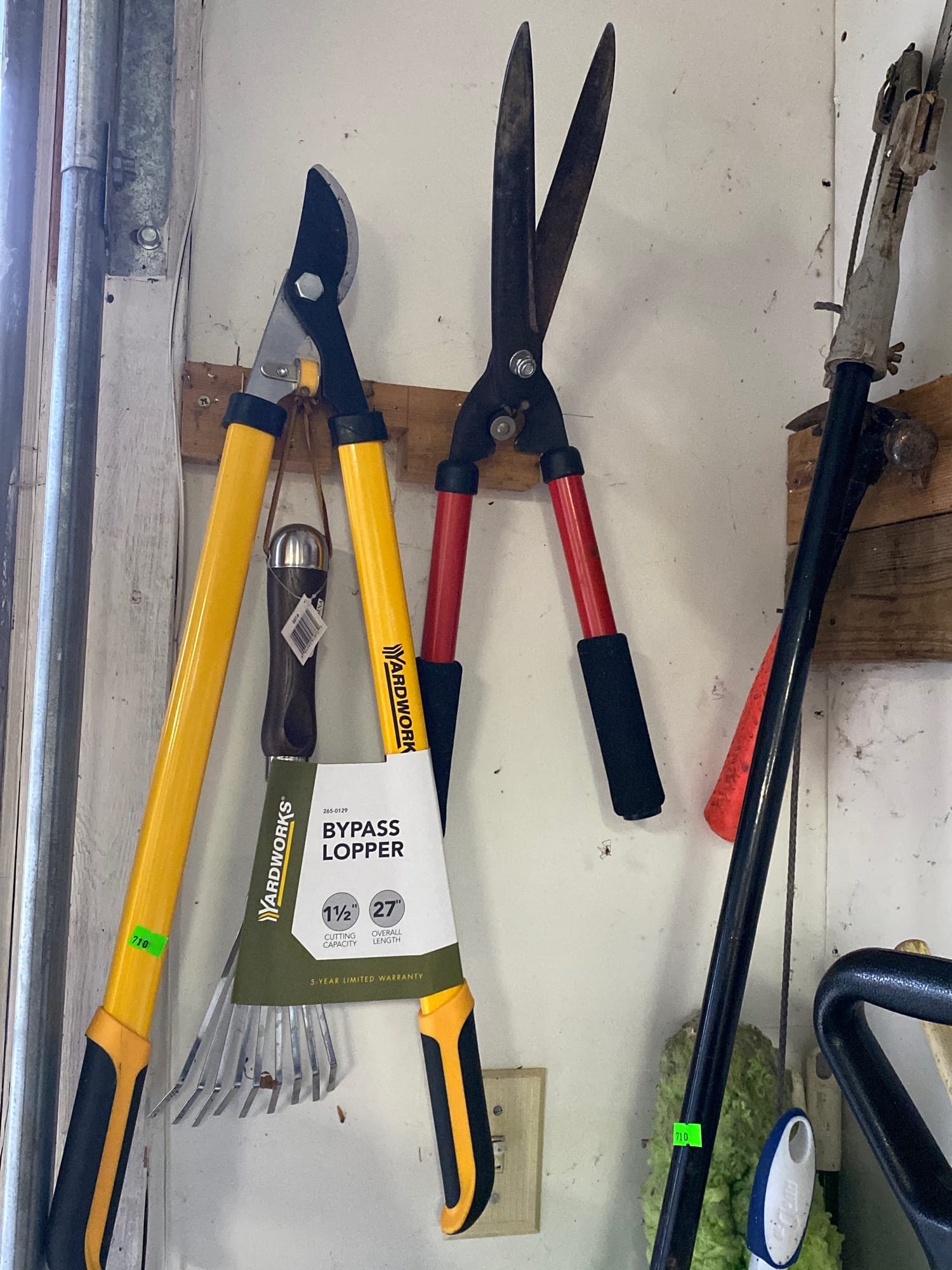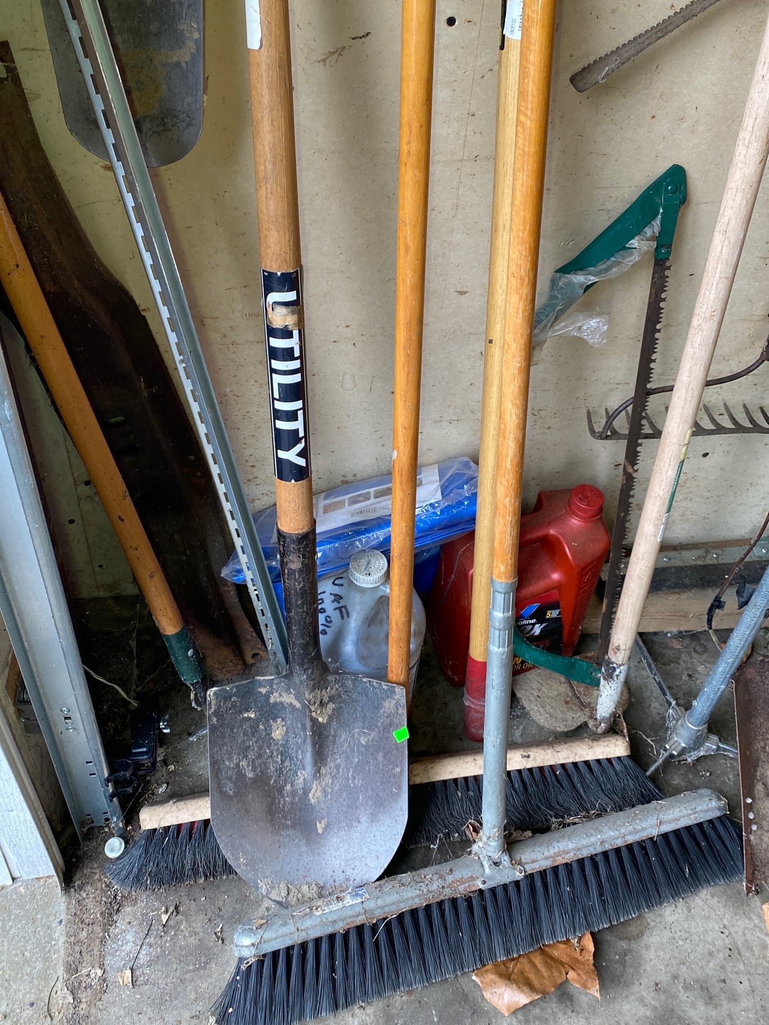 839 Brooms, saw, tomato cages, wood step ladder 5ft, axe, contents as shown in pictures