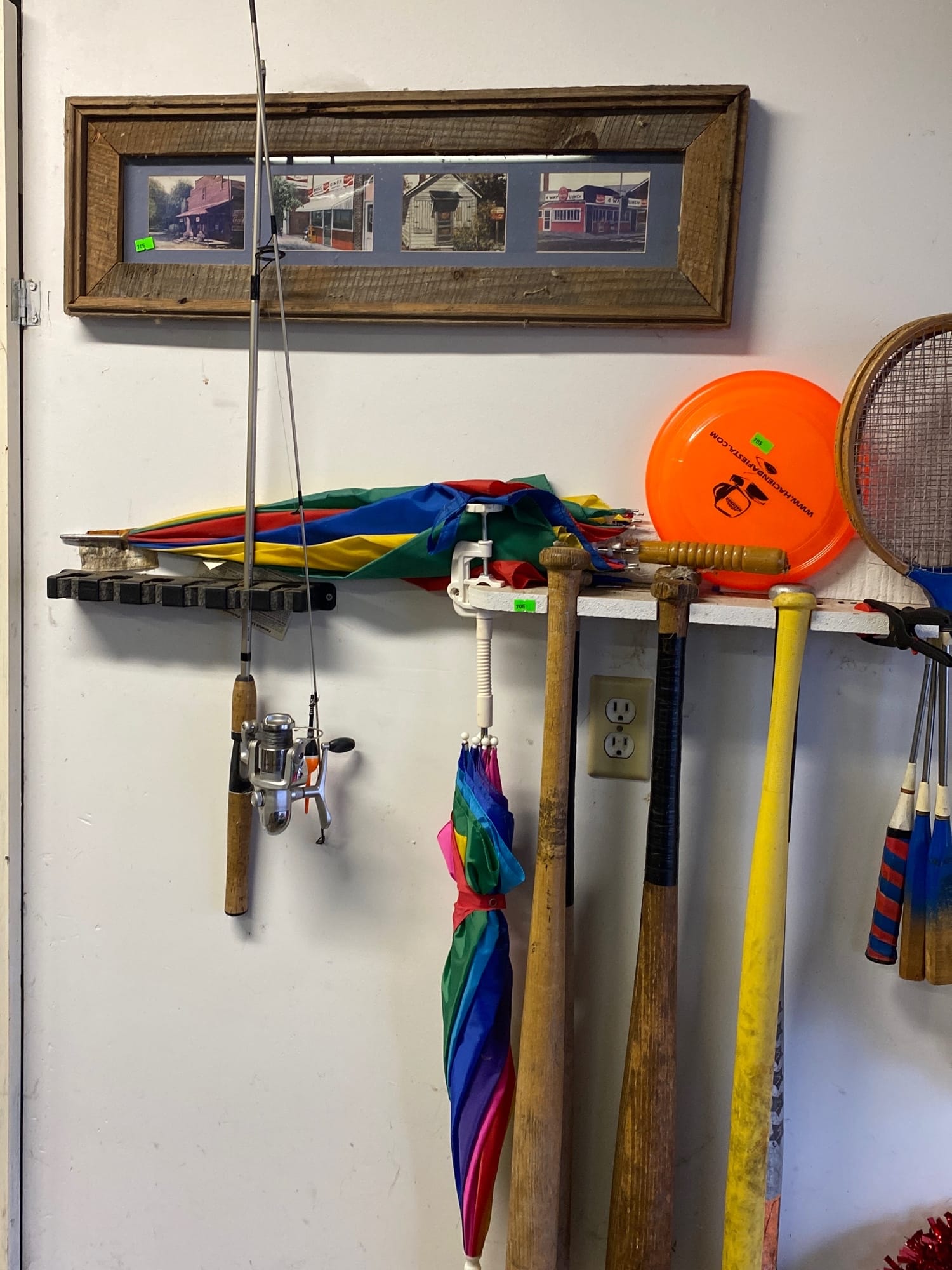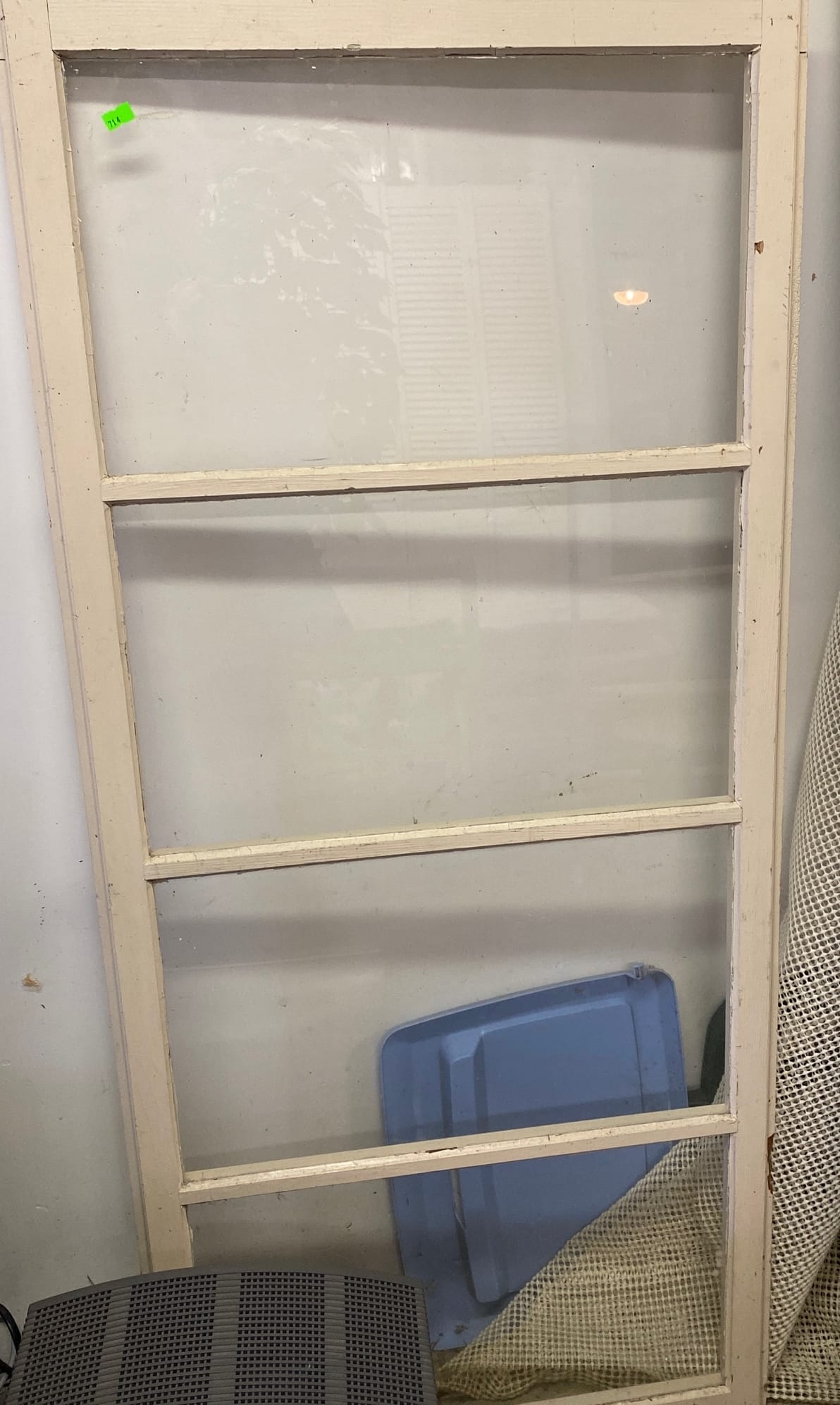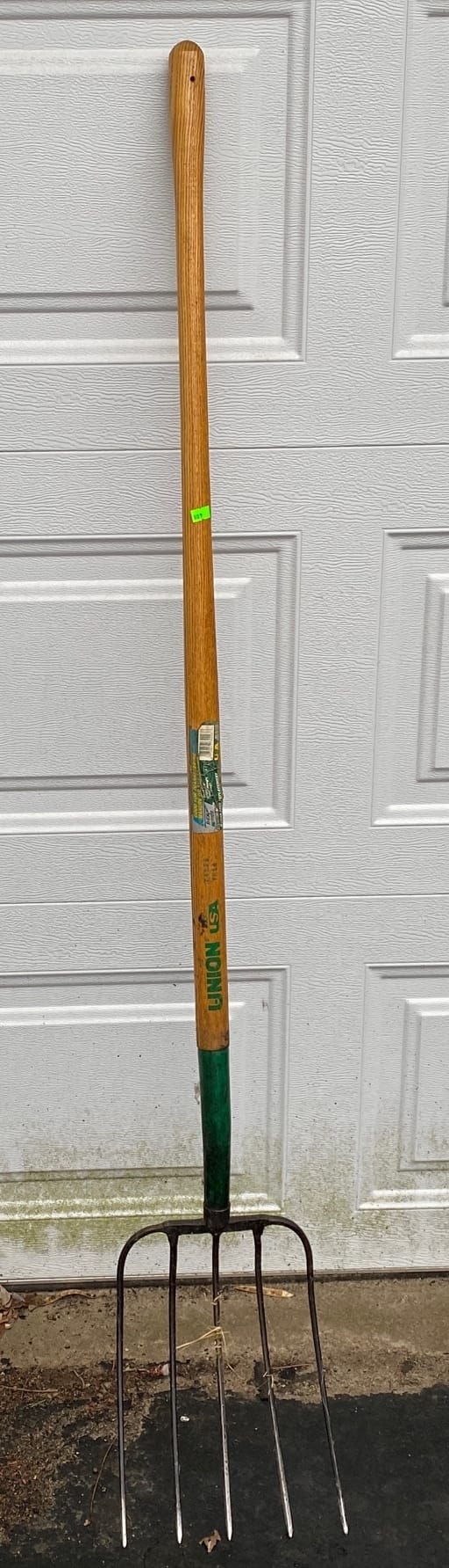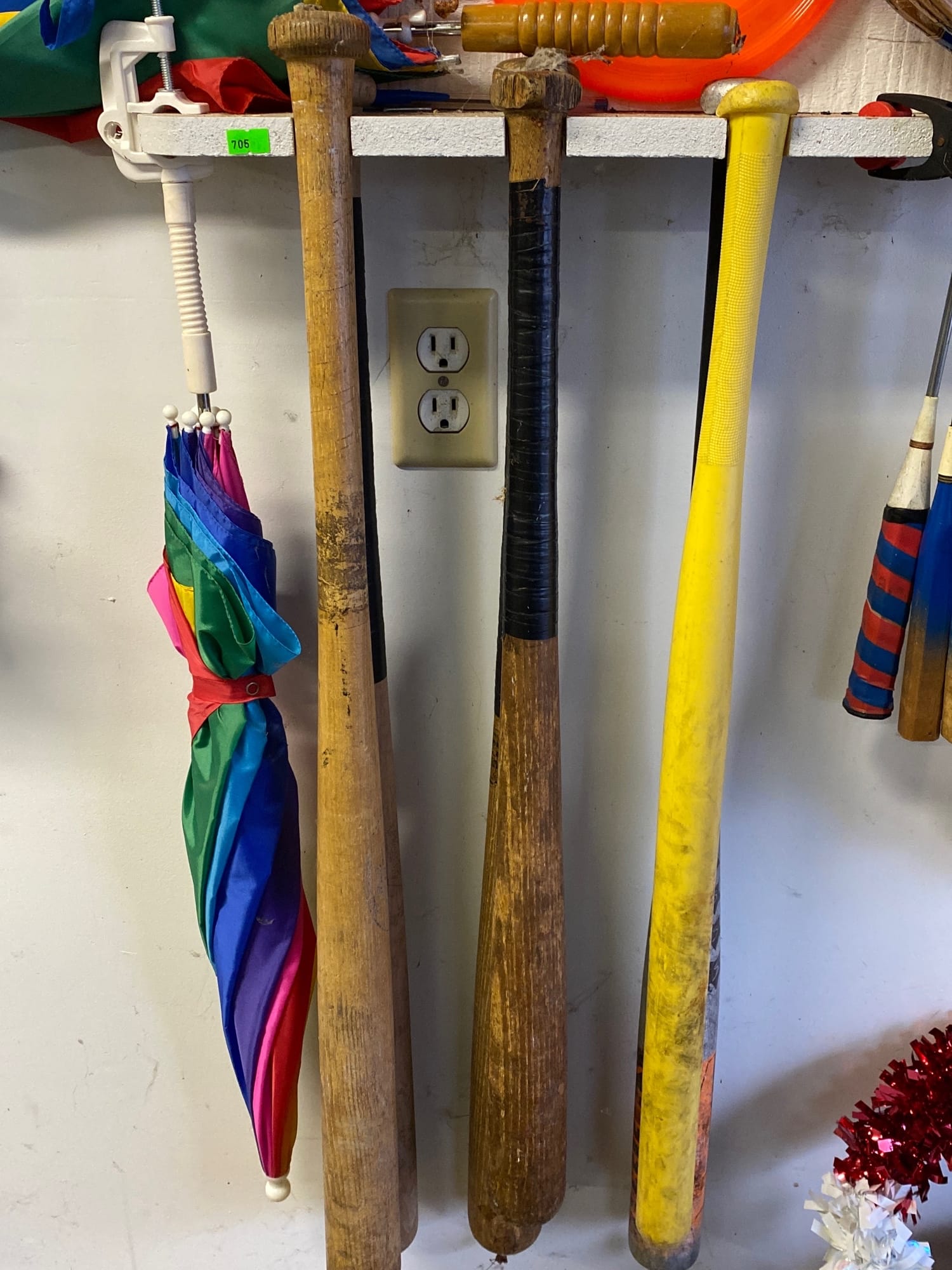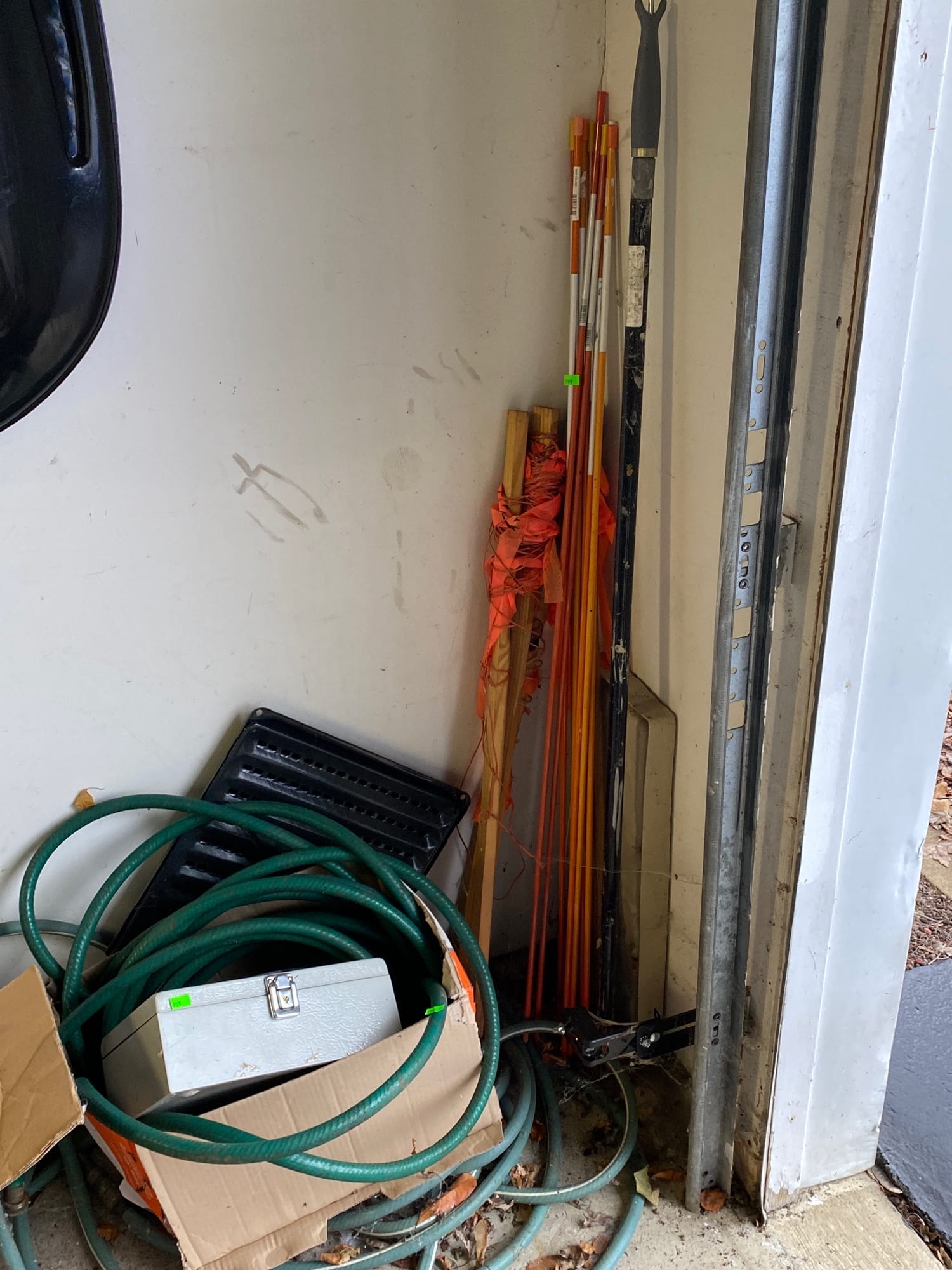 839 Brooms, saw, tomato cages, wood step ladder 5ft, axe, contents as shown in pictures