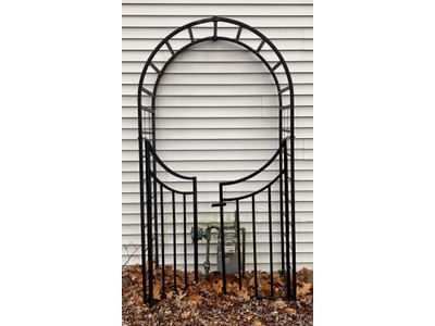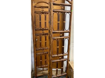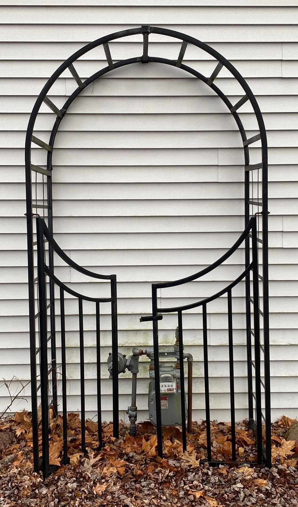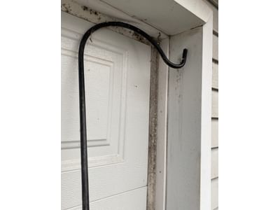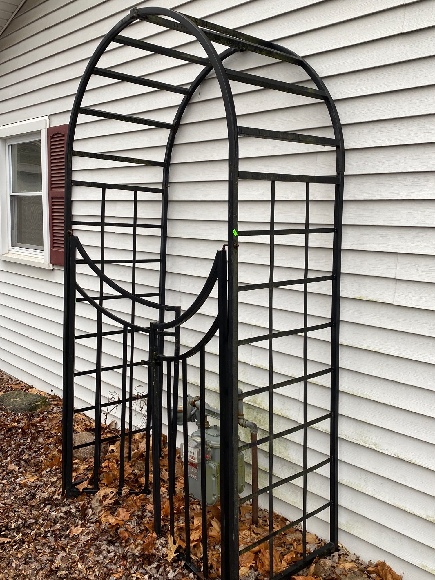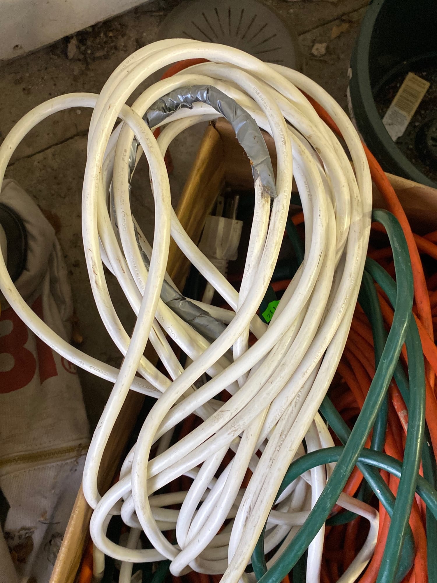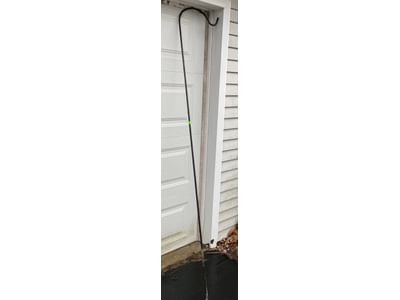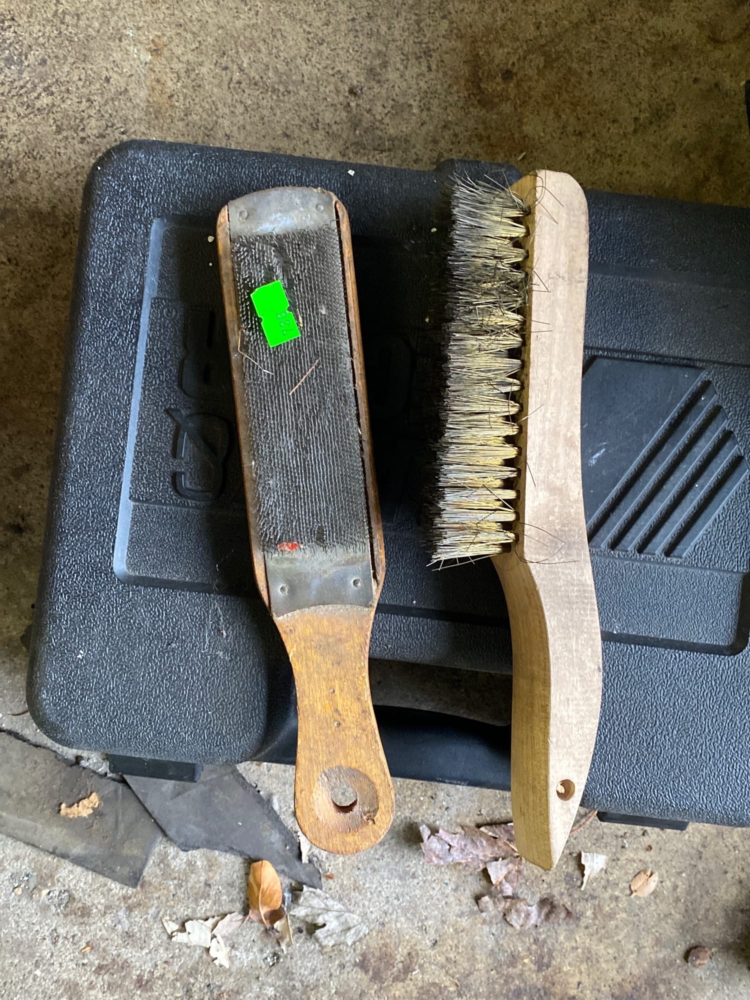 839 Brooms, saw, tomato cages, wood step ladder 5ft, axe, contents as shown in pictures